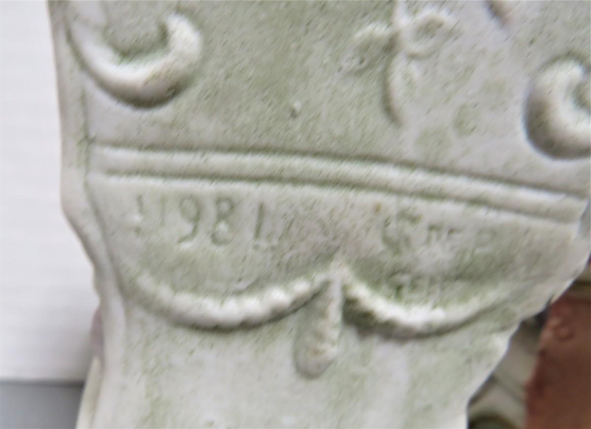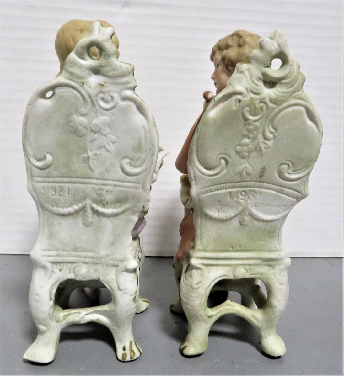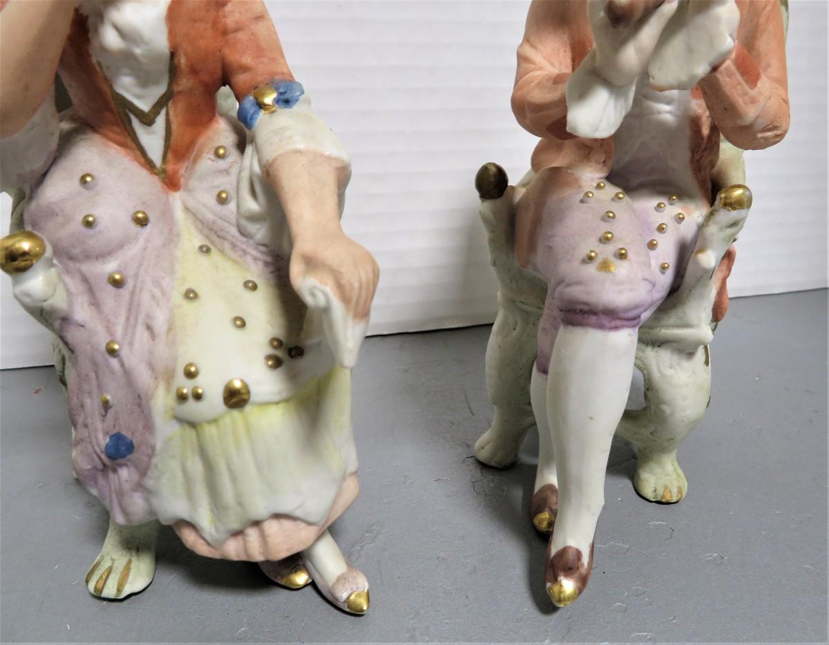 (2) nice Hand painted Victorian Porcelain signed DEP 11981 Germany figures. Both posed in Chairs. Lady holding handbag purse & Man with musical instrument Flute.