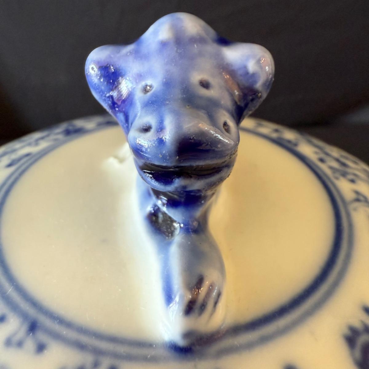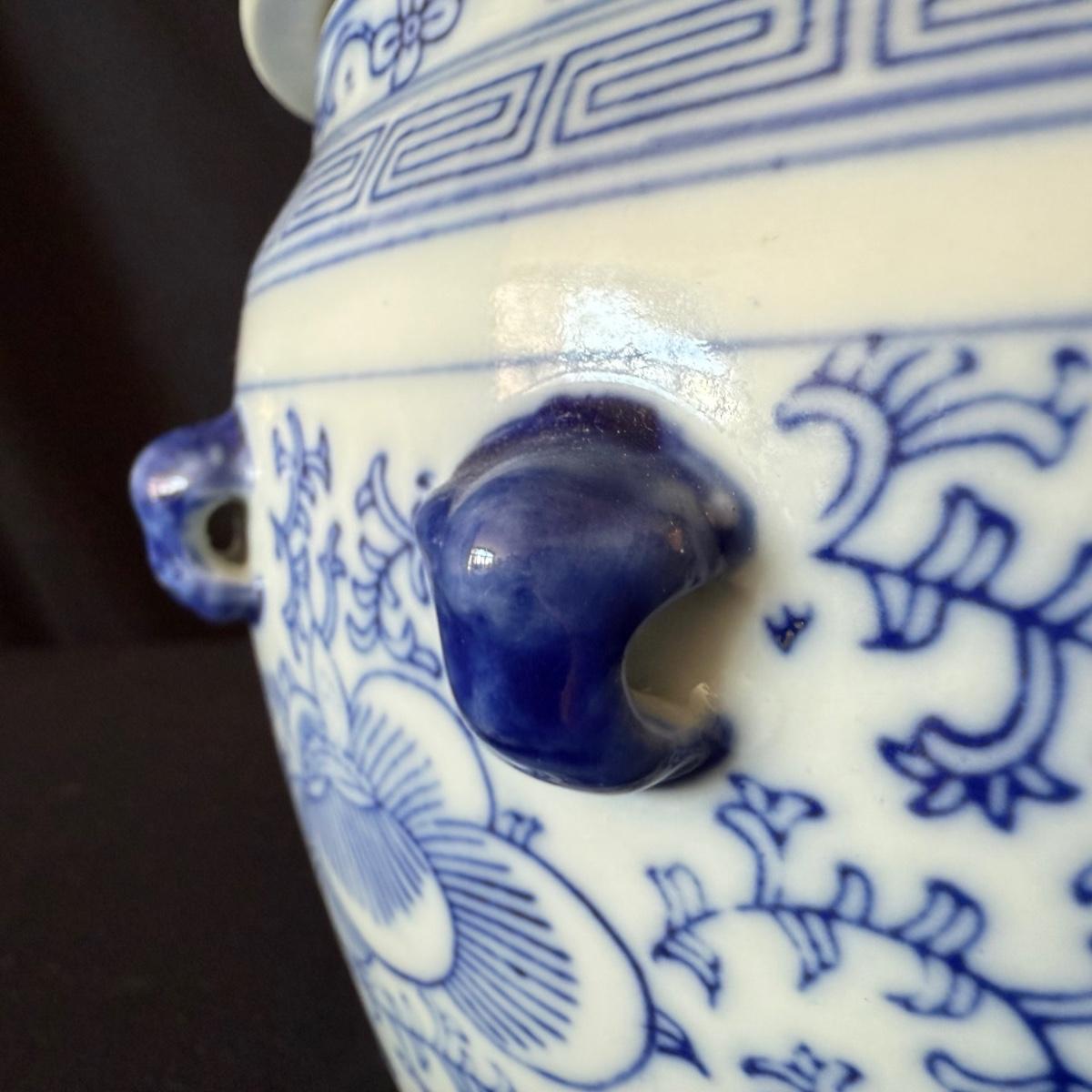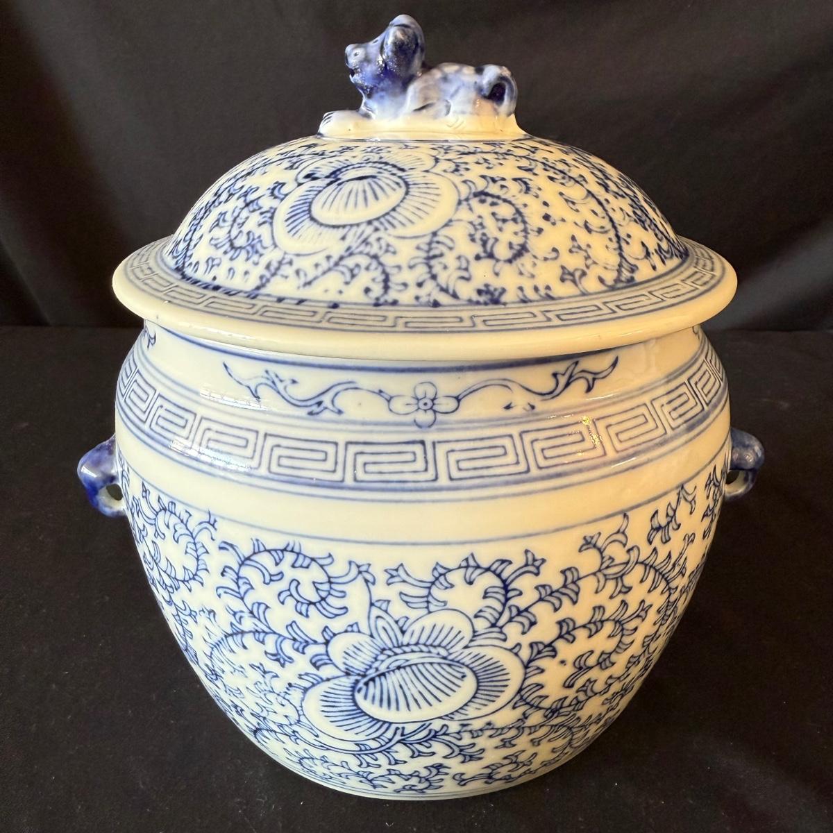 Blue and white porcelain lidded ginger jar features a foo dog finial on the lid. At the widest point, this measures 8”D and is 8”H.