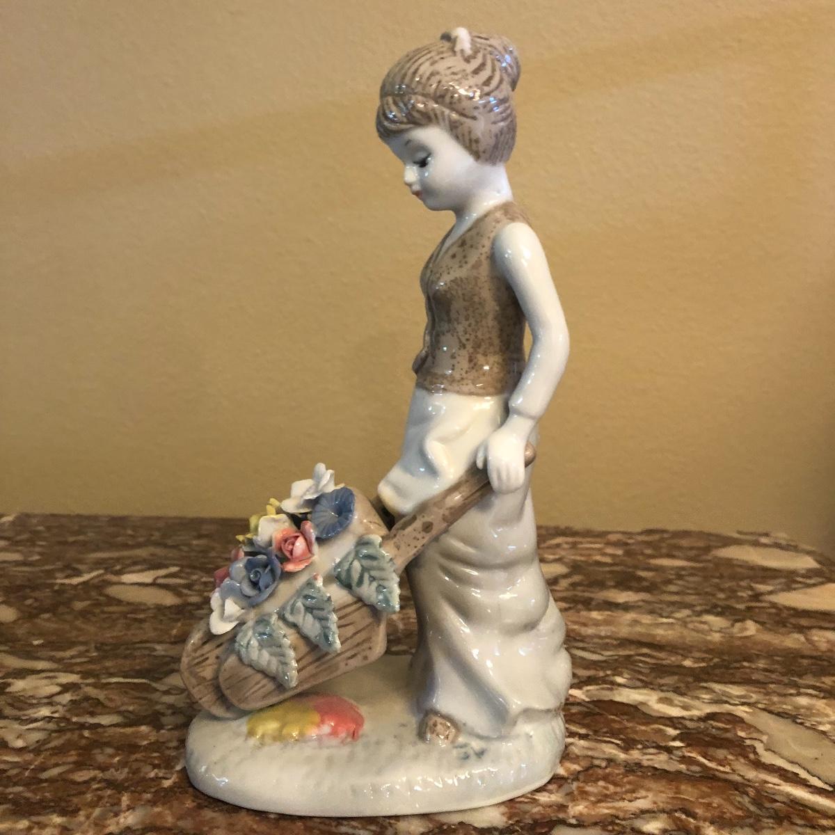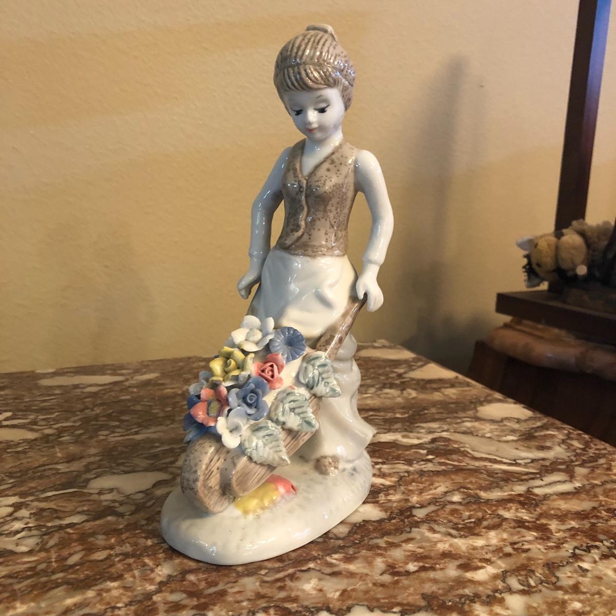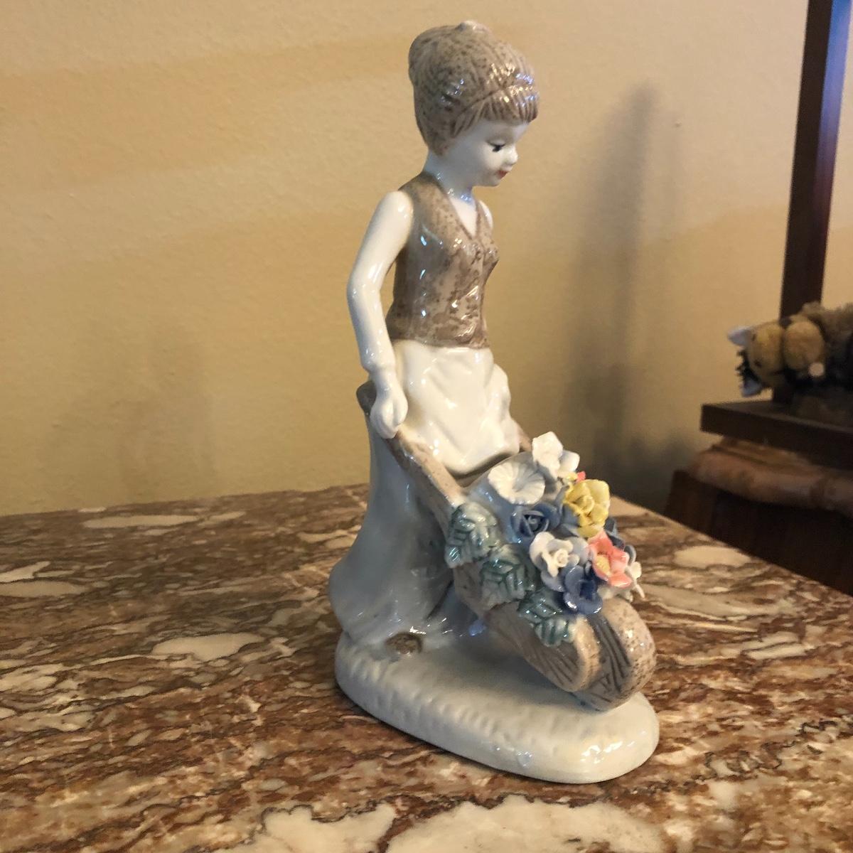 This is another cute porcelain piece. A girl pushing a flower basket. Measures 8”.