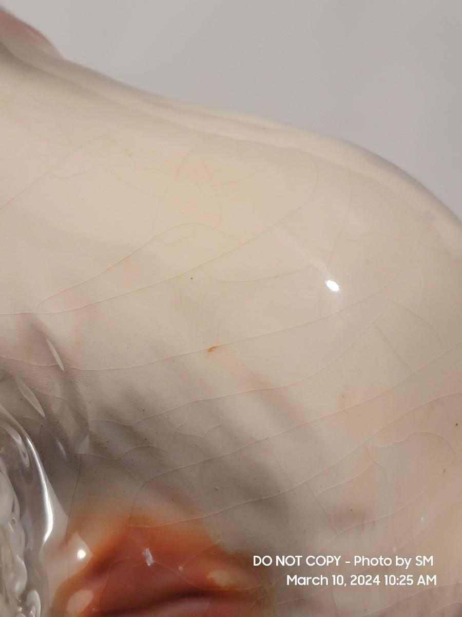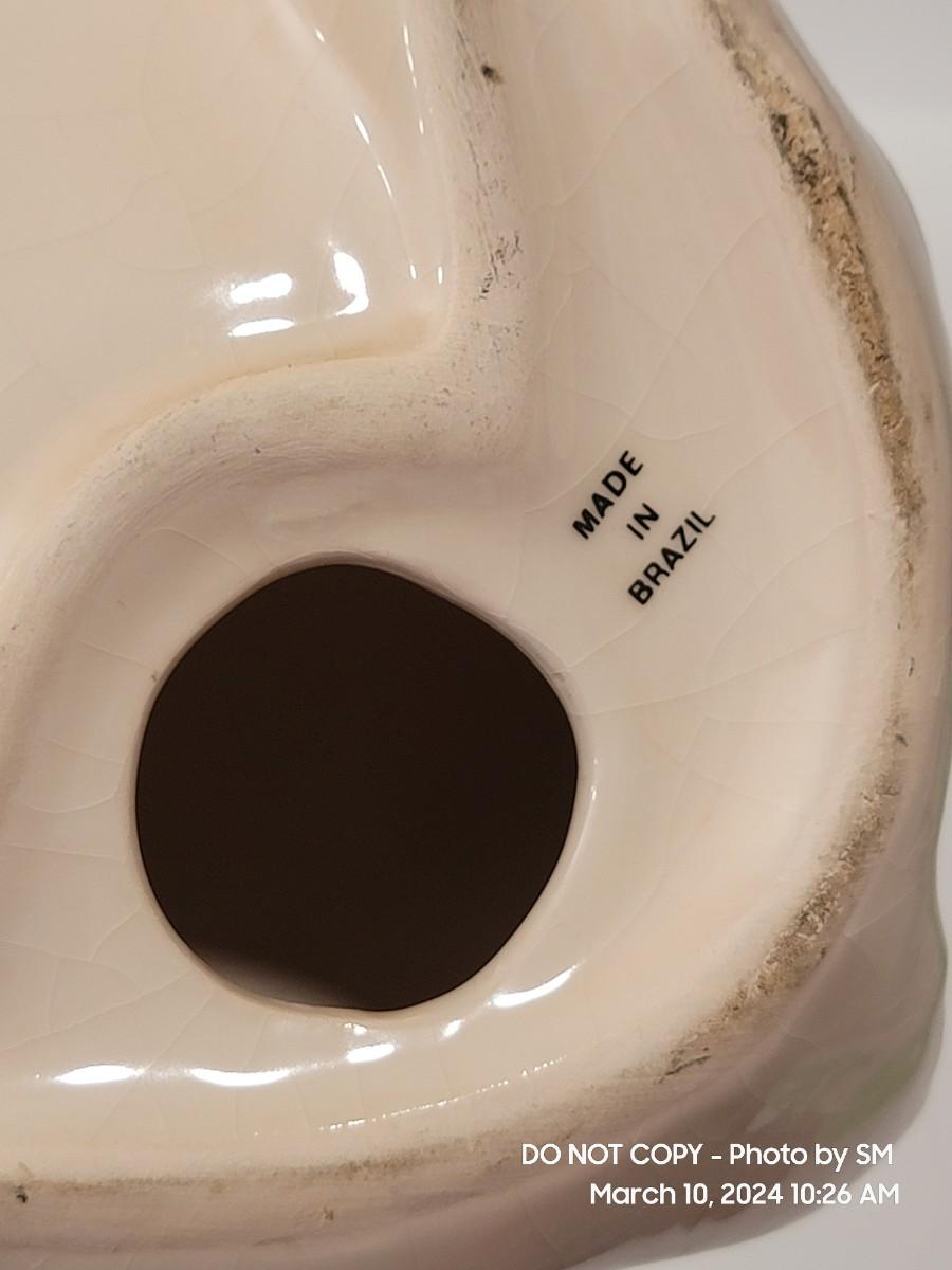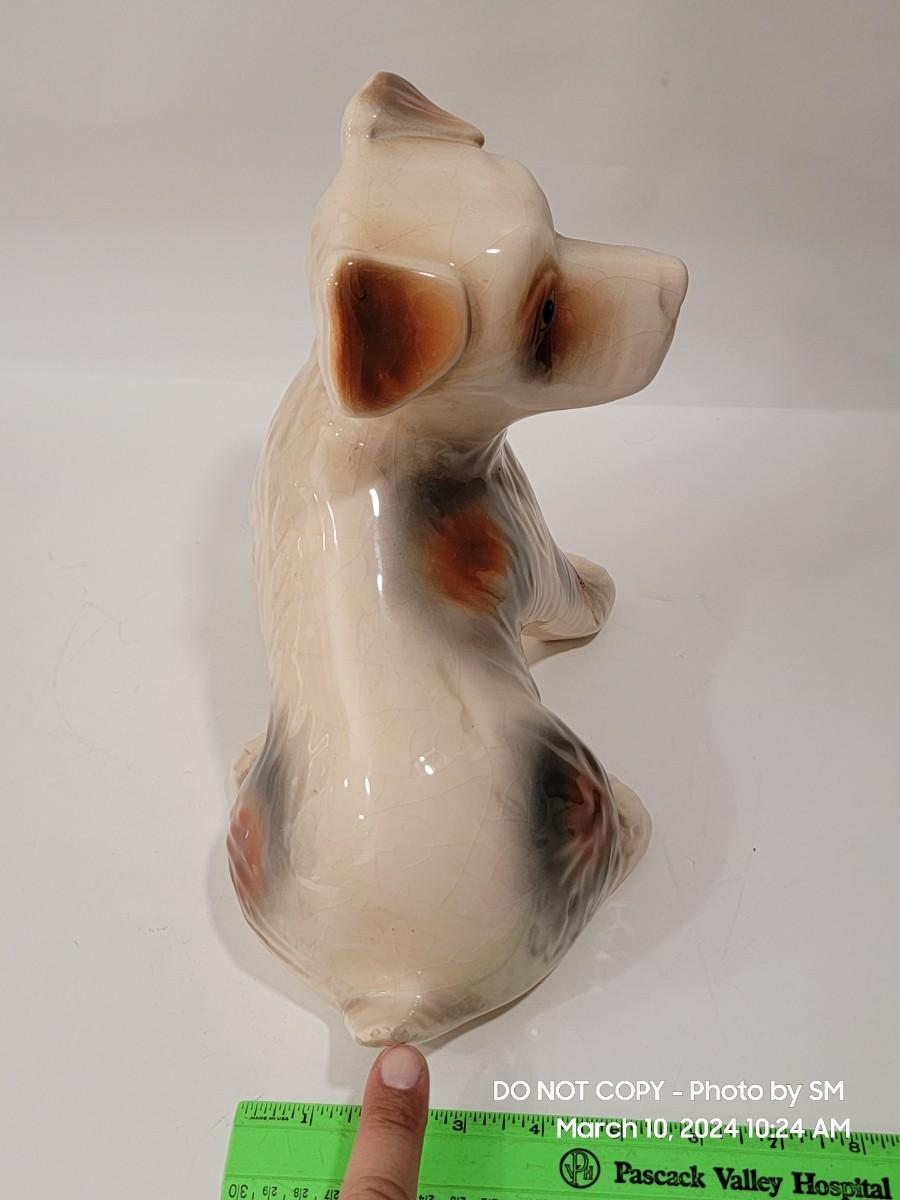 Made in Brazil, is this adorable pup that needs a home. I am not sure if he is chalkware or porcelain, the finish has crazing (like a thin spider webbing like cracking in the finish - but its not cracks). Has minor scuffs here n there but as you can see, he shows off ! As seen in photo with my finger, tail has a small chip but otherwise is nice codition.