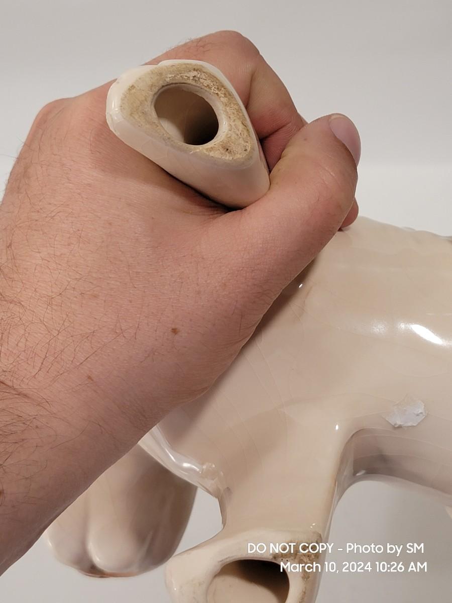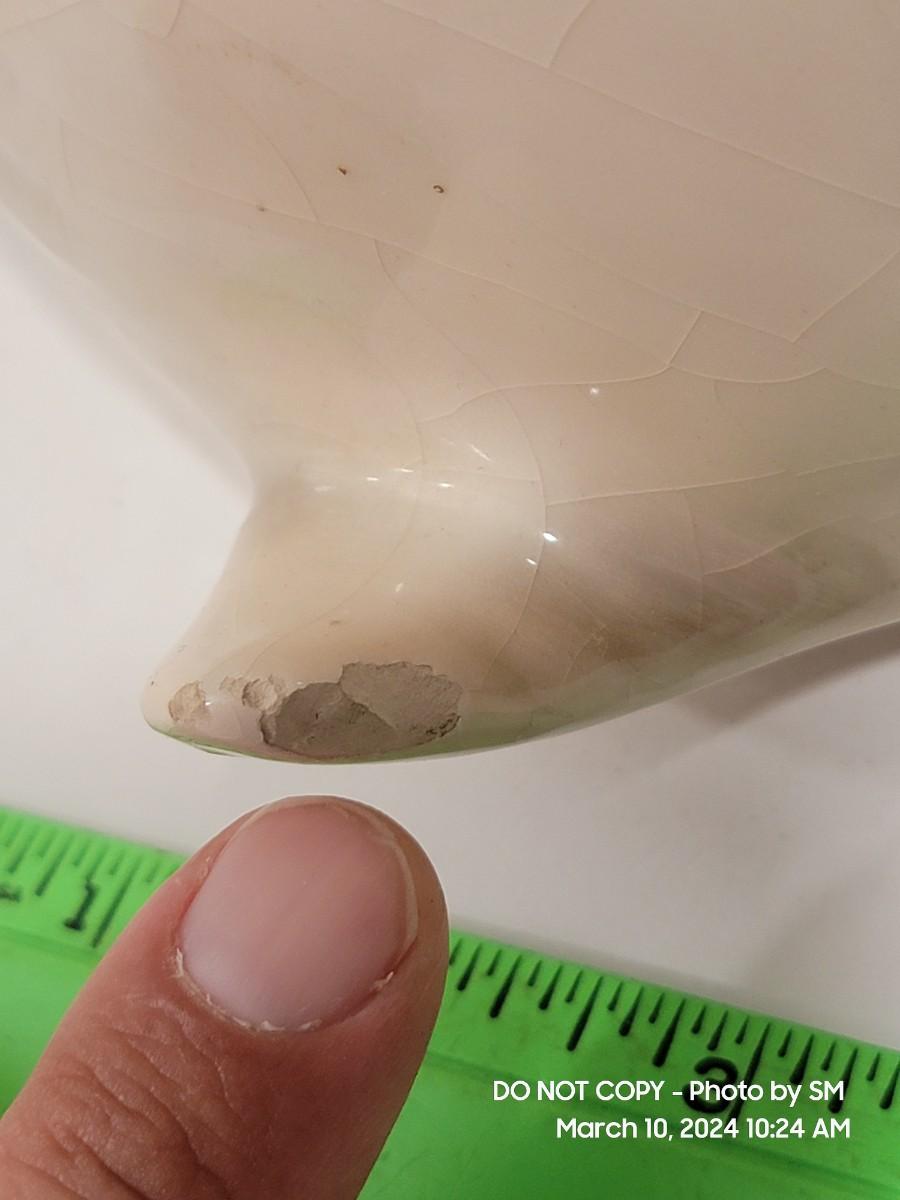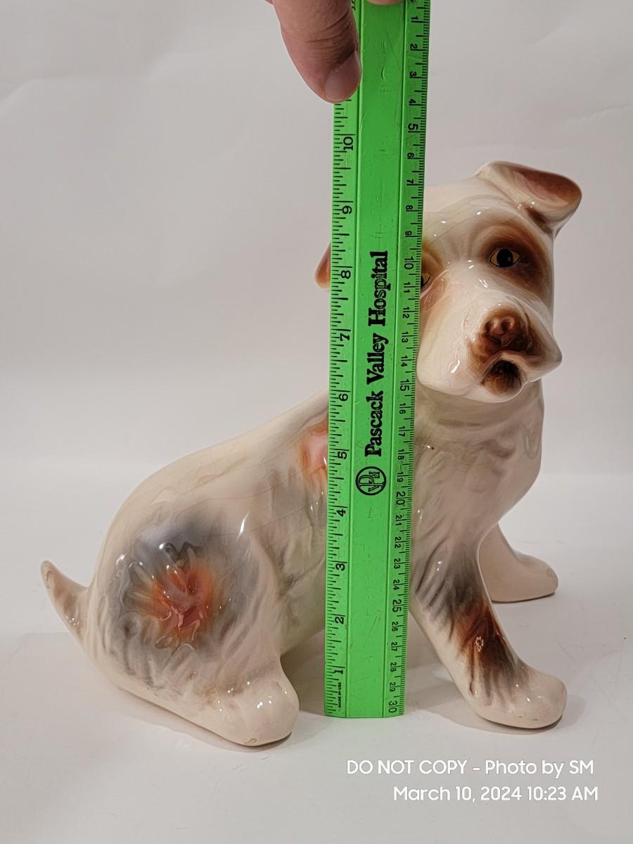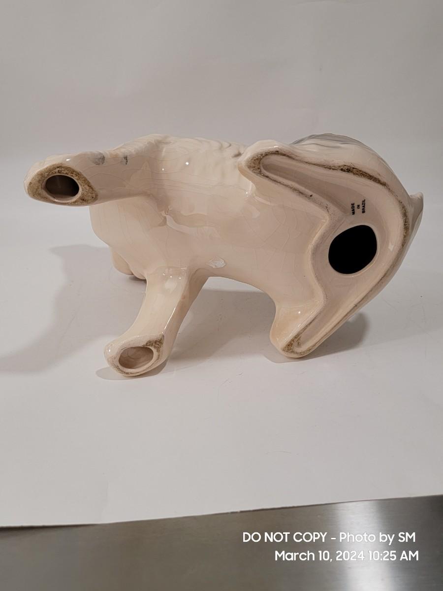 Made in Brazil, is this adorable pup that needs a home. I am not sure if he is chalkware or porcelain, the finish has crazing (like a thin spider webbing like cracking in the finish - but its not cracks). Has minor scuffs here n there but as you can see, he shows off ! As seen in photo with my finger, tail has a small chip but otherwise is nice codition.