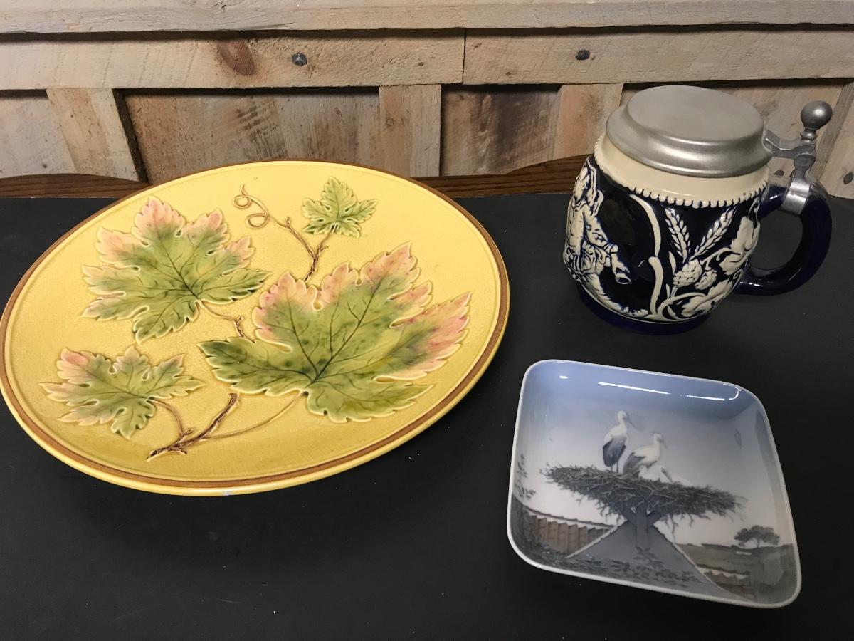 German stein, German majolica plate and danish dish