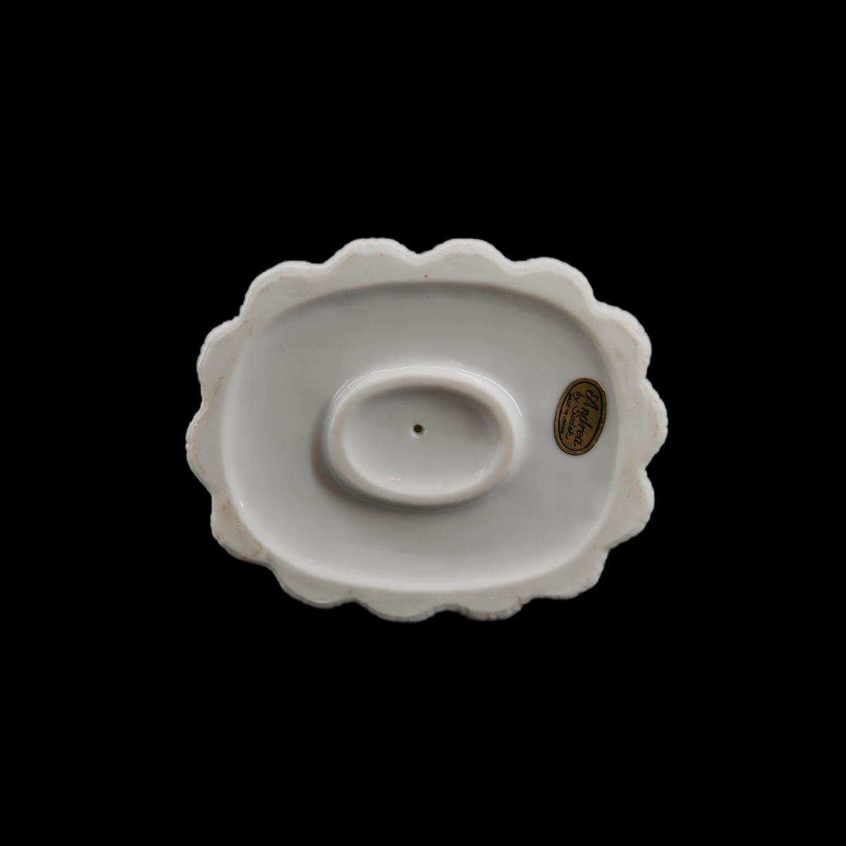 Guanyin (or Guan Yin) is one of the most popular beings of Buddhism representing mercy, modesty, courage, justice, and wisdom. This gorgeous porcelain statuette depicts Guanyin sitting peacefully a top a lotus flower. Sticker on bottom reads "Andrea by Sadek, Made in Japan". Superb condition! Measures L 5" x H 9" x W 4". Weighs 1 lb 1 oz. (D34)