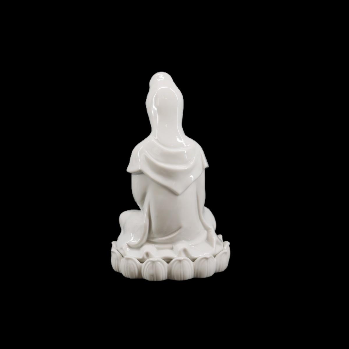 Guanyin (or Guan Yin) is one of the most popular beings of Buddhism representing mercy, modesty, courage, justice, and wisdom. This gorgeous porcelain statuette depicts Guanyin sitting peacefully a top a lotus flower. Sticker on bottom reads "Andrea by Sadek, Made in Japan". One small spot in glaze (see photo). Excellent condition! Measures L 5" x H 9" x W 4". Weighs 1 lb 1 oz. (D35)