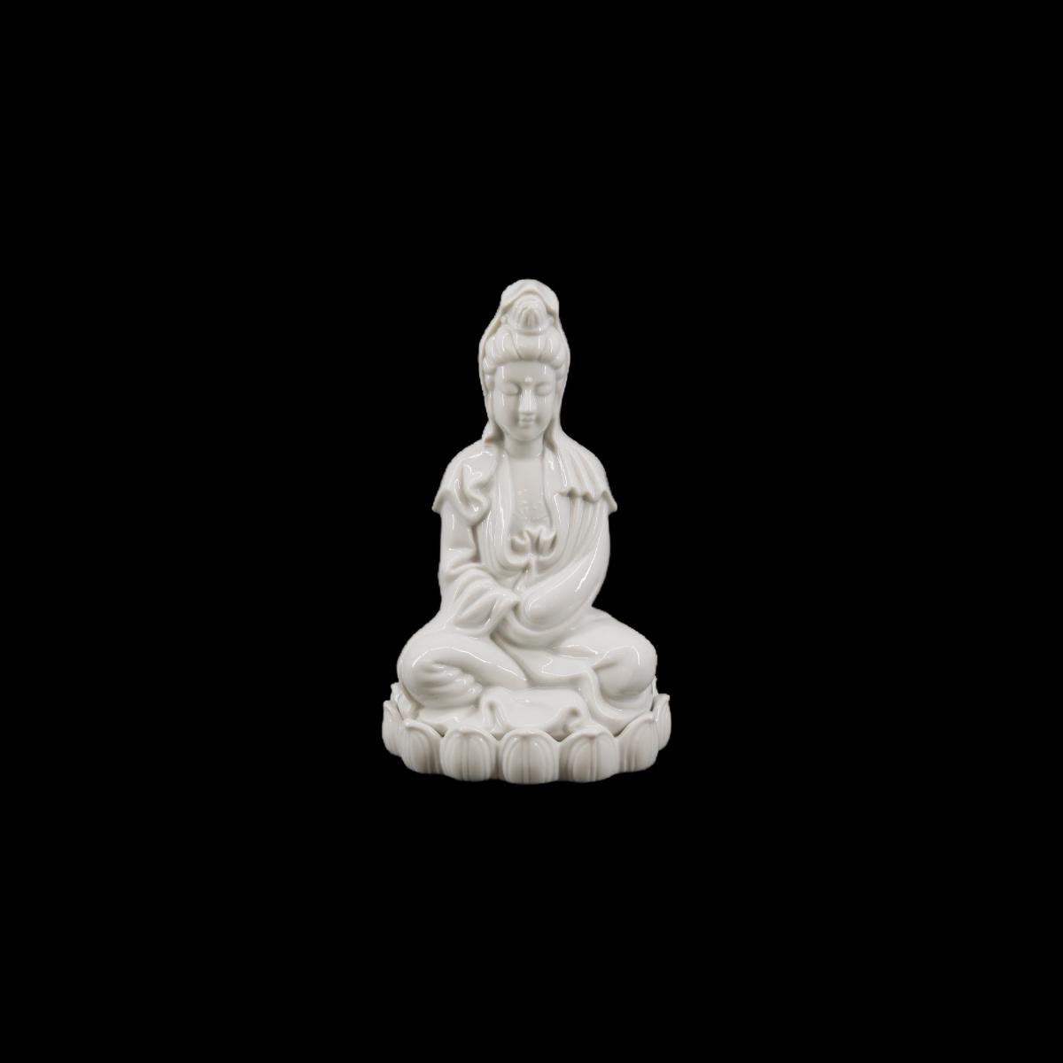 Guanyin (or Guan Yin) is one of the most popular beings of Buddhism representing mercy, modesty, courage, justice, and wisdom. This gorgeous porcelain statuette depicts Guanyin sitting peacefully a top a lotus flower. Sticker on bottom reads "Andrea by Sadek, Made in Japan". One small spot in glaze (see photo). Excellent condition! Measures L 5" x H 9" x W 4". Weighs 1 lb 1 oz. (D35)