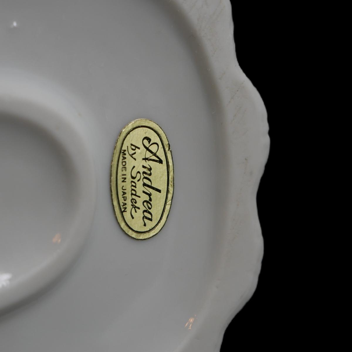 Guanyin (or Guan Yin) is one of the most popular beings of Buddhism representing mercy, modesty, courage, justice, and wisdom. This gorgeous porcelain statuette depicts Guanyin sitting peacefully a top a lotus flower. Sticker on bottom reads "Andrea by Sadek, Made in Japan". One small spot in glaze (see photo). Excellent condition! Measures L 5" x H 9" x W 4". Weighs 1 lb 1 oz. (D35)