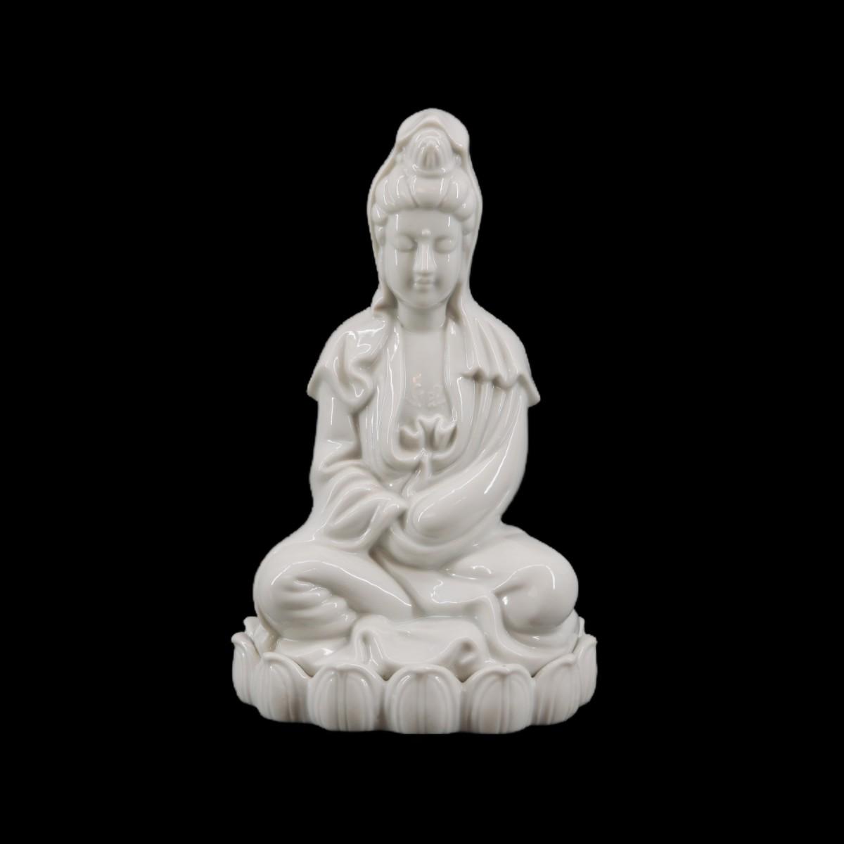 Guanyin (or Guan Yin) is one of the most popular beings of Buddhism representing mercy, modesty, courage, justice, and wisdom. This gorgeous porcelain statuette depicts Guanyin sitting peacefully a top a lotus flower. Sticker on bottom reads "Andrea by Sadek, Made in Japan". Superb condition! Measures L 5" x H 9" x W 4". Weighs 1 lb 1 oz. (D34)