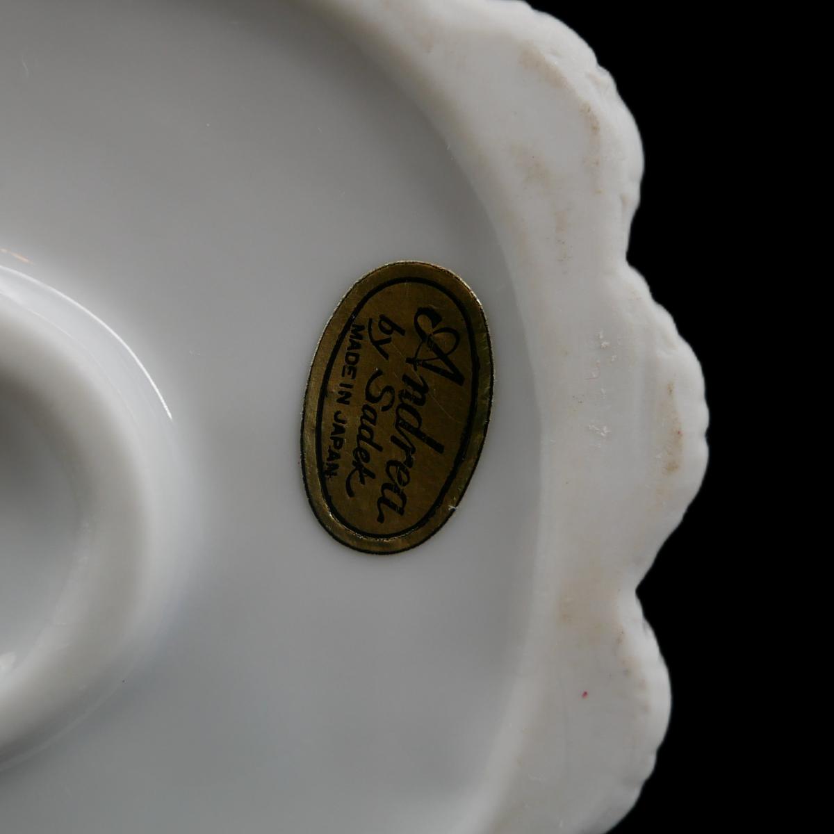 Guanyin (or Guan Yin) is one of the most popular beings of Buddhism representing mercy, modesty, courage, justice, and wisdom. This gorgeous porcelain statuette depicts Guanyin sitting peacefully a top a lotus flower. Sticker on bottom reads "Andrea by Sadek, Made in Japan". Superb condition! Measures L 5" x H 9" x W 4". Weighs 1 lb 1 oz. (D34)
