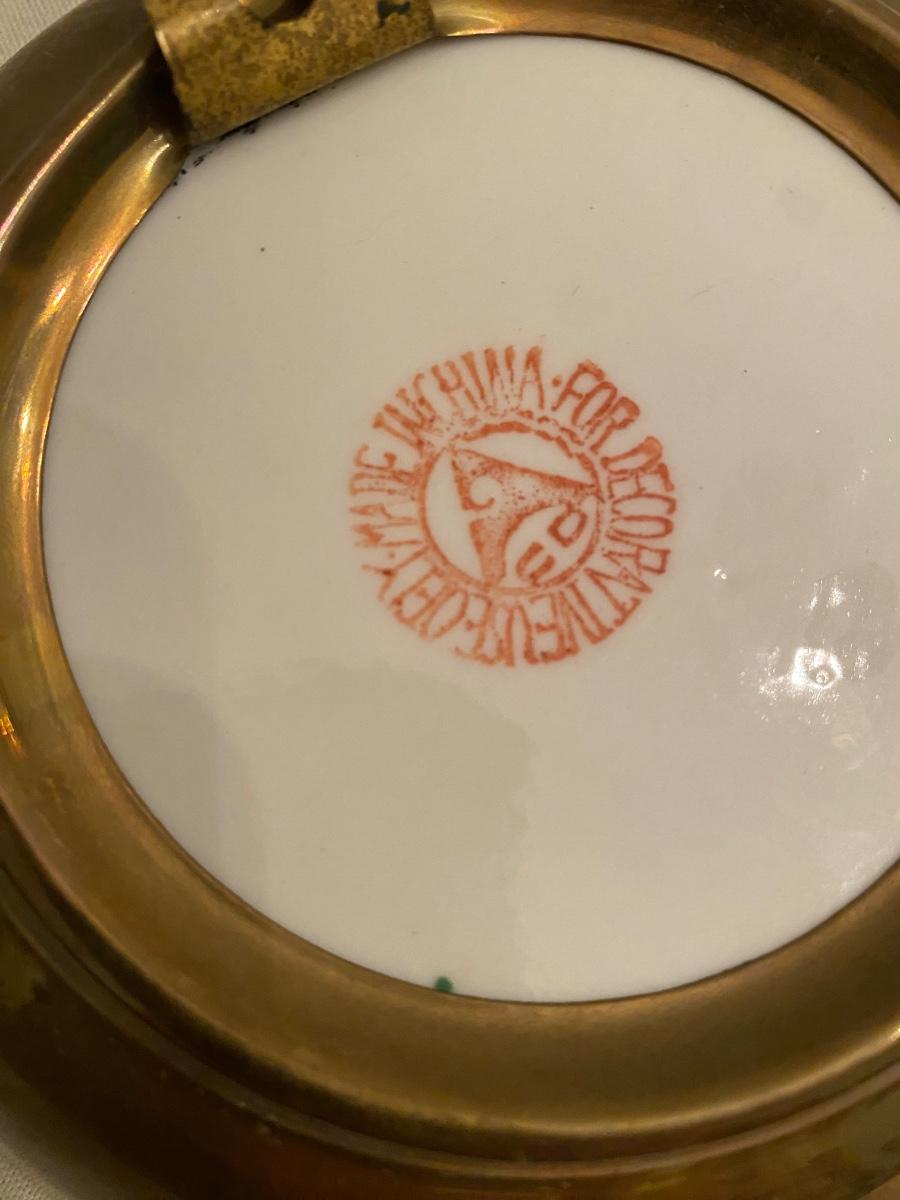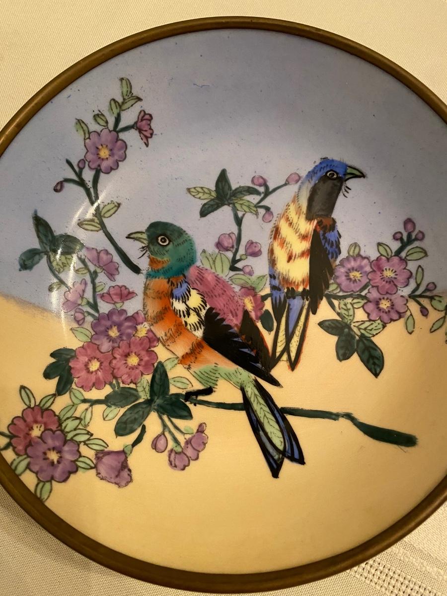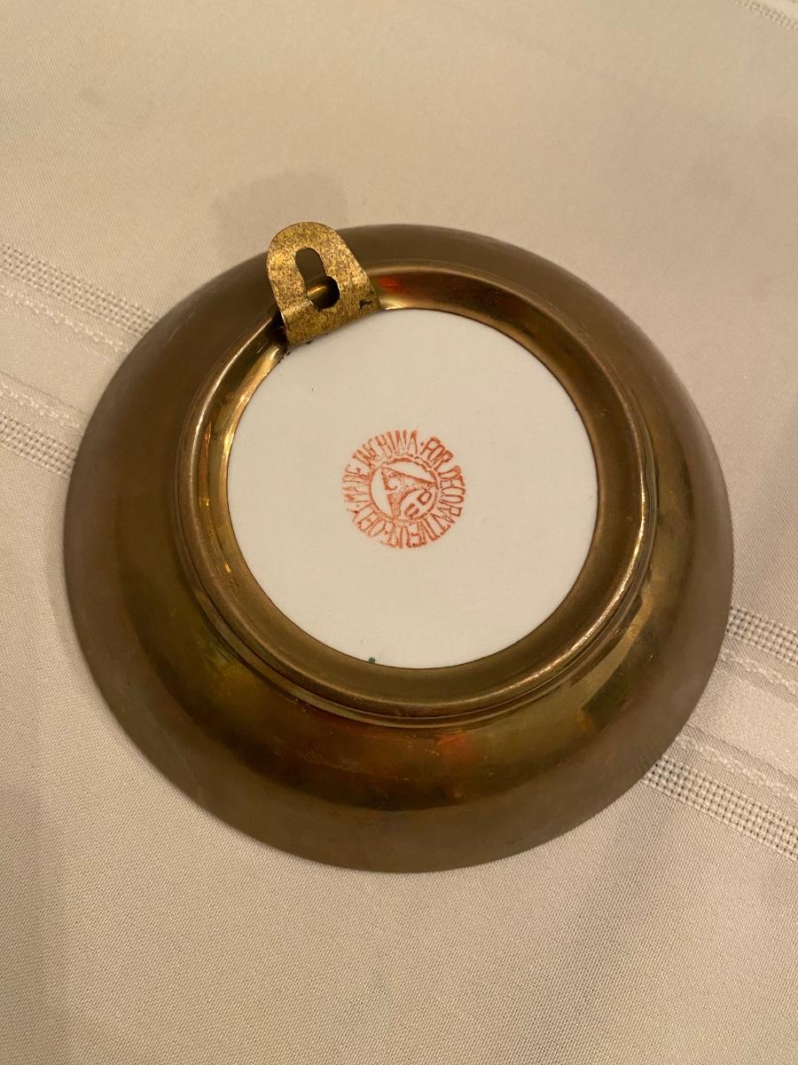 Porcelain Hand Painted Chinoiserie Style Birds Cherry Plum Blossom Wall Decor with Brass Trim - 6" diameter, Wall hanging tab affixed to back