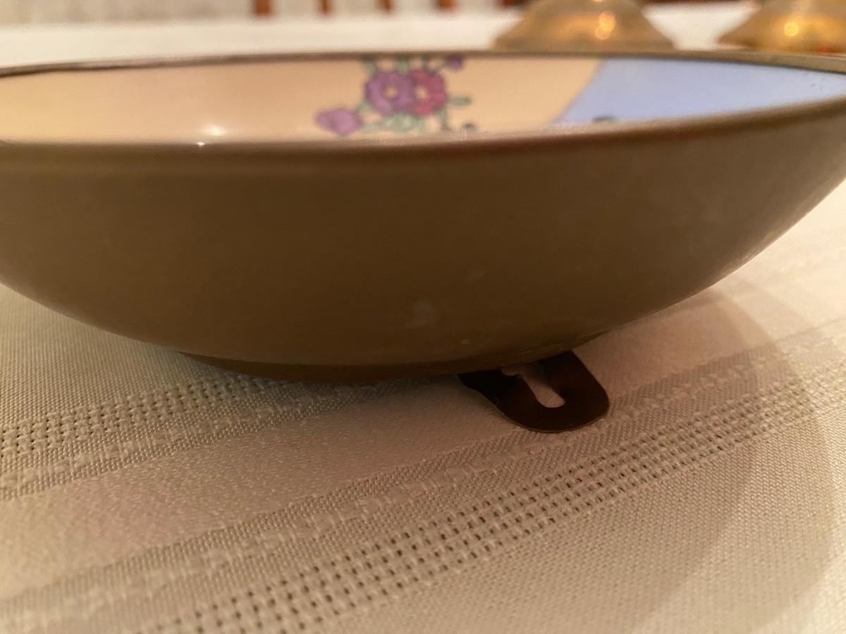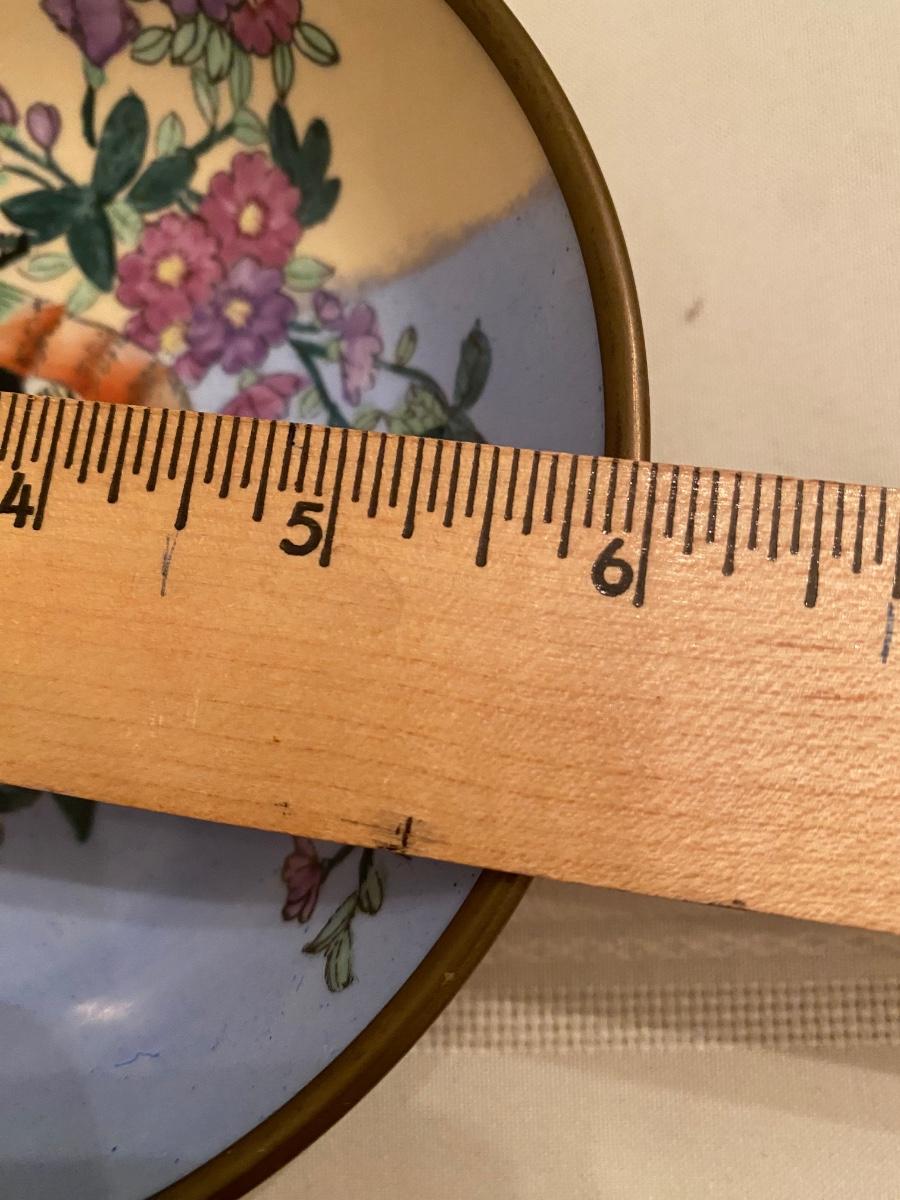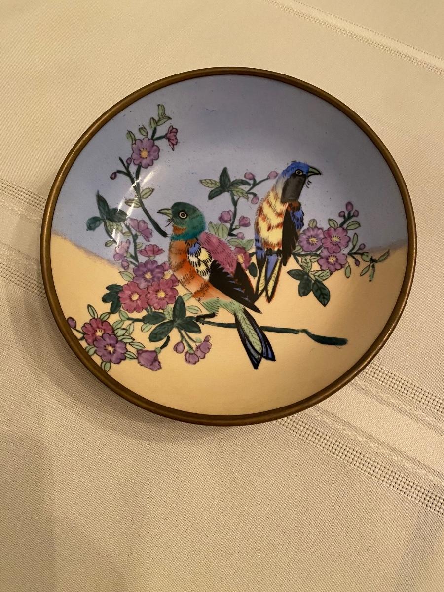 Porcelain Hand Painted Chinoiserie Style Birds Cherry Plum Blossom Wall Decor with Brass Trim - 6" diameter, Wall hanging tab affixed to back