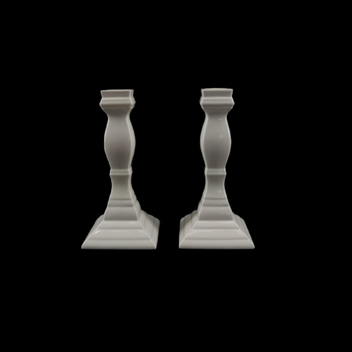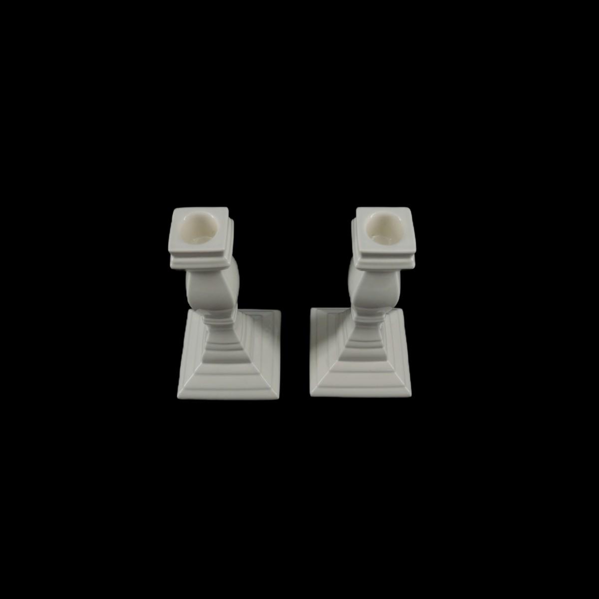 Set of two vintage porcelain French countryside style Mikasa candlestick holders, made in Japan. Each measures H 7.25" x W 3.5". Lot weighs 1 lb. (C22)