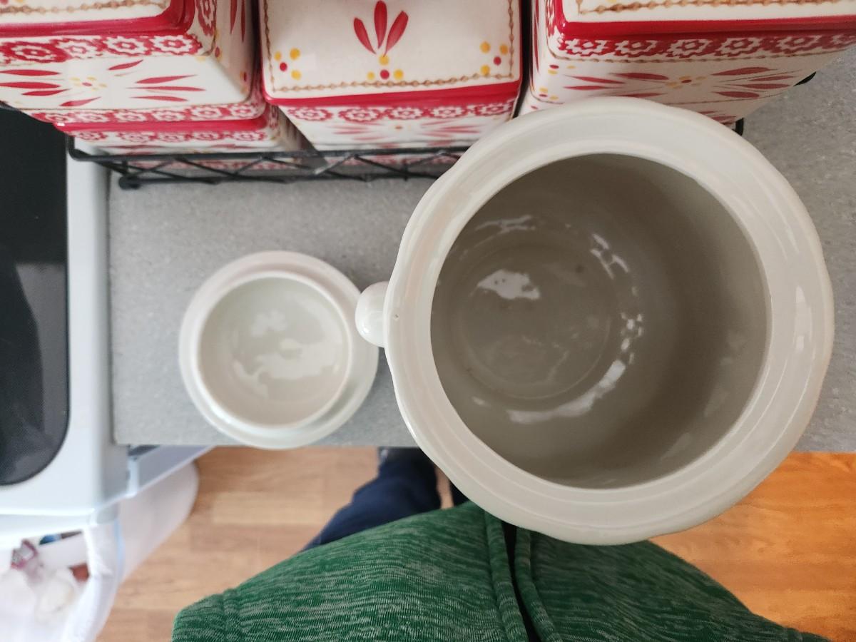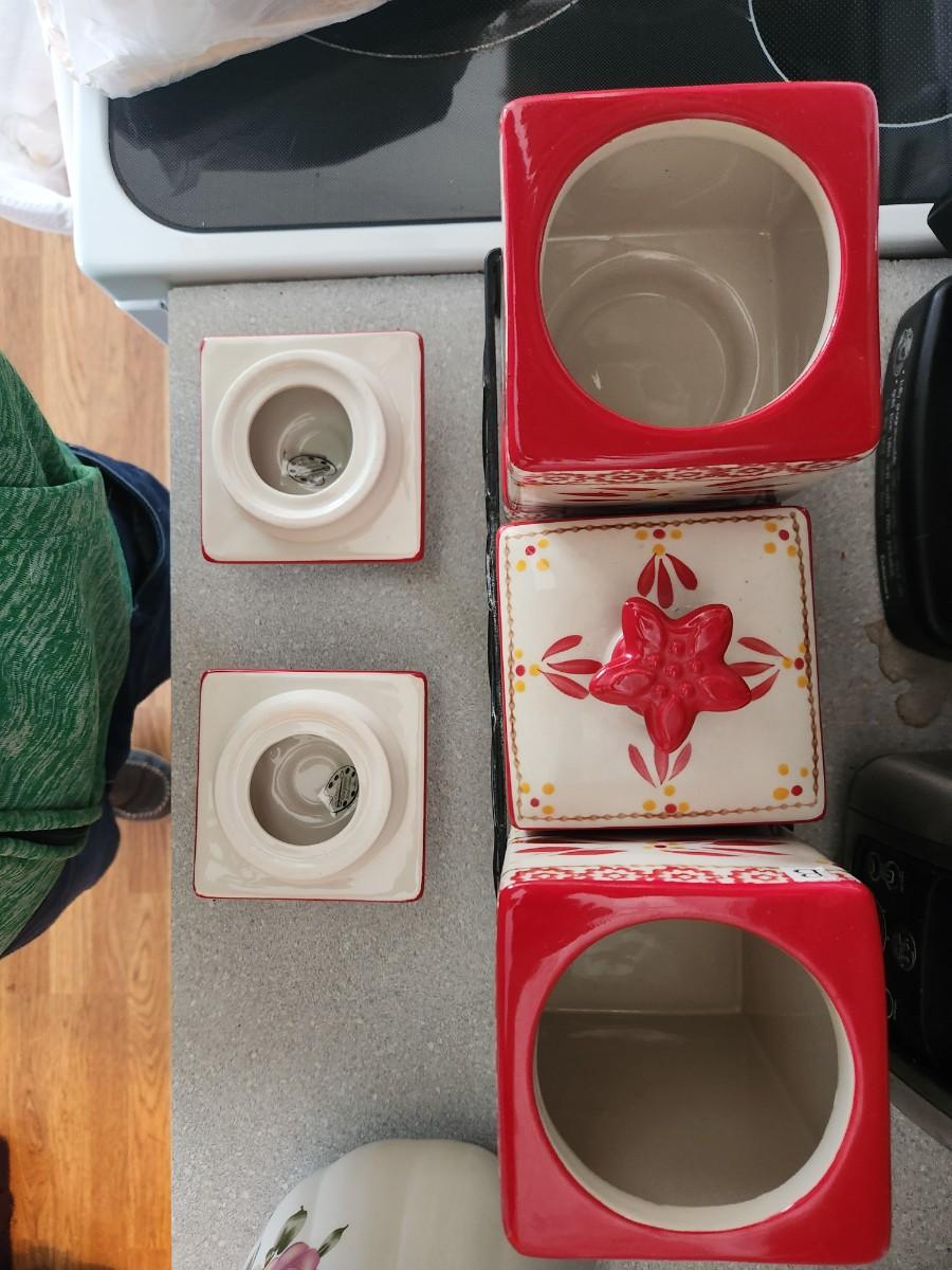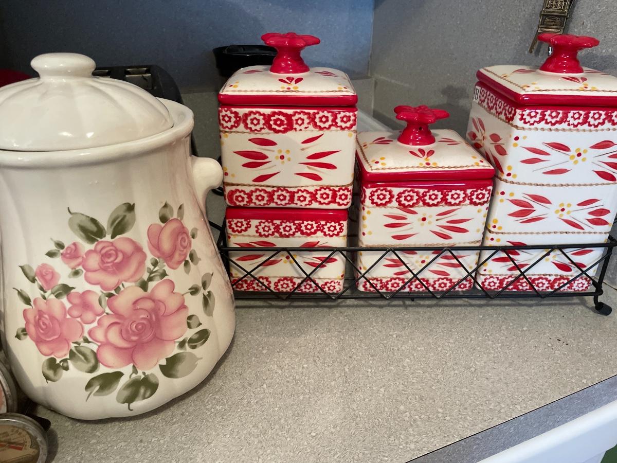 Porcelain canister set includes 5 square ones in rack and 1 large floral