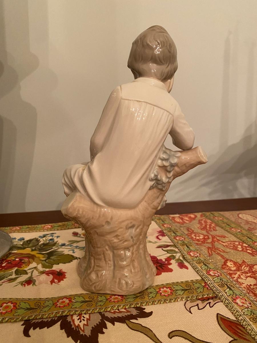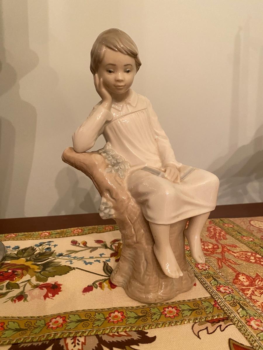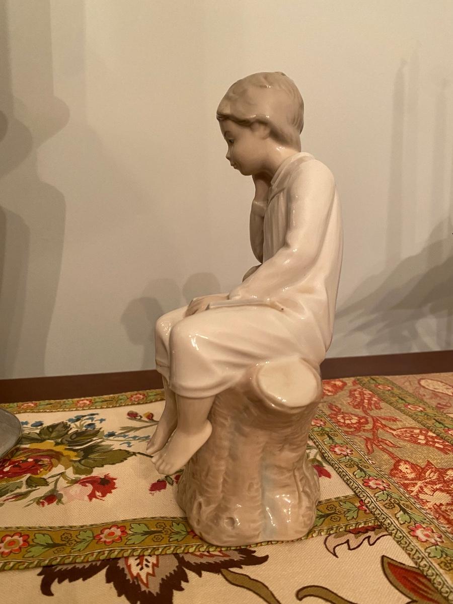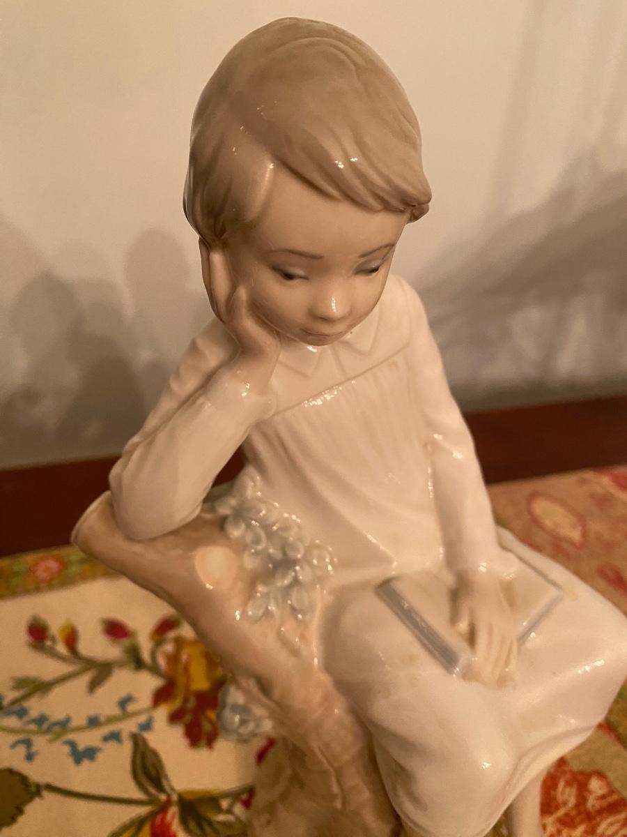 Porcelain Lladro boy sitting on a stump reading a book figurine. Great condition. 8 1/4 " tall.