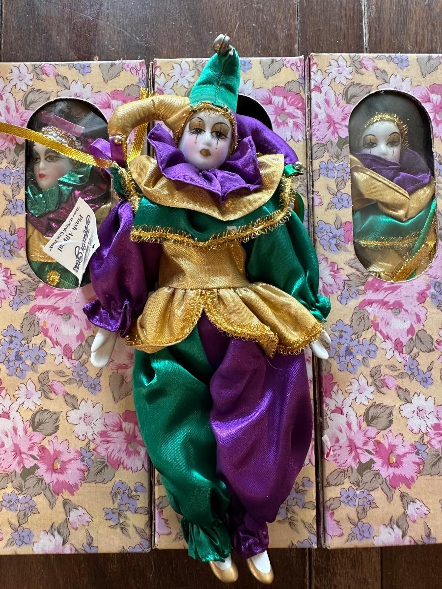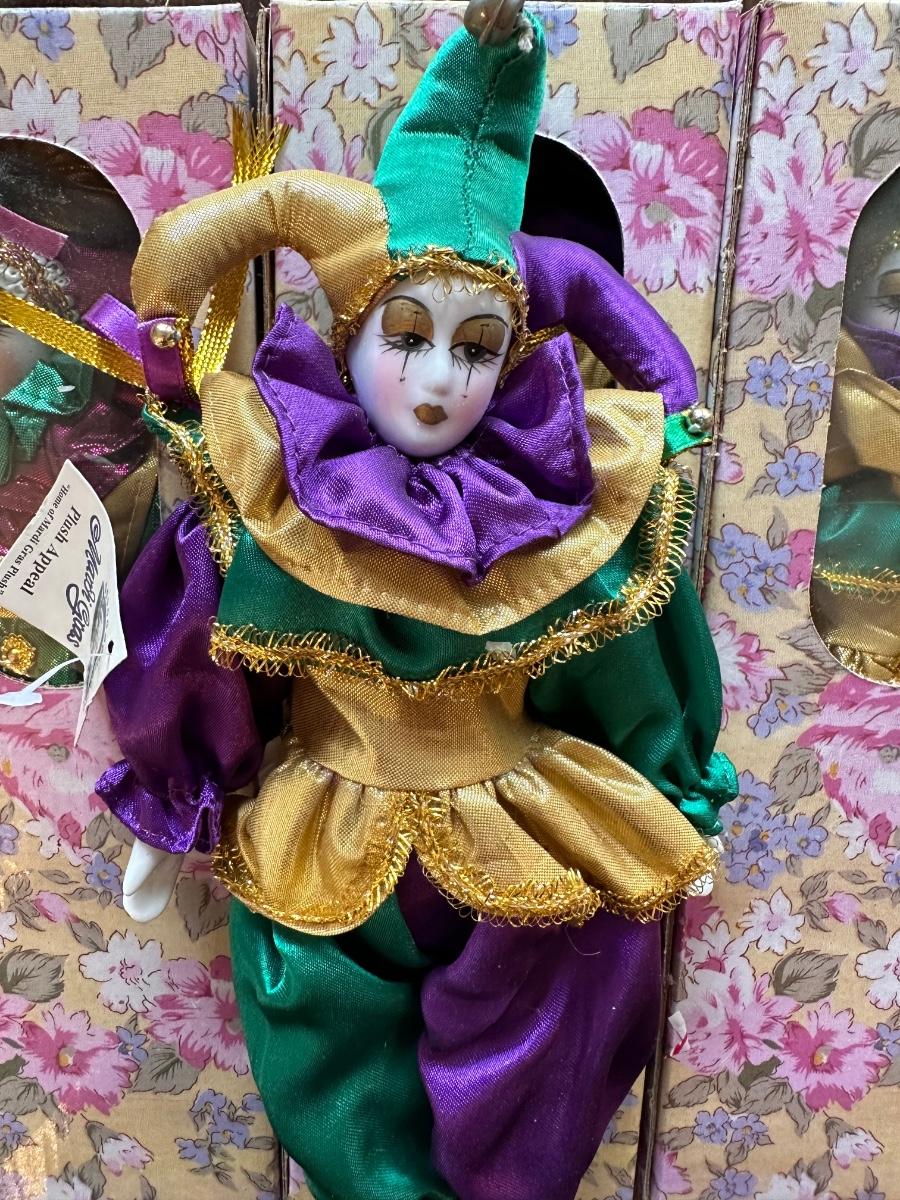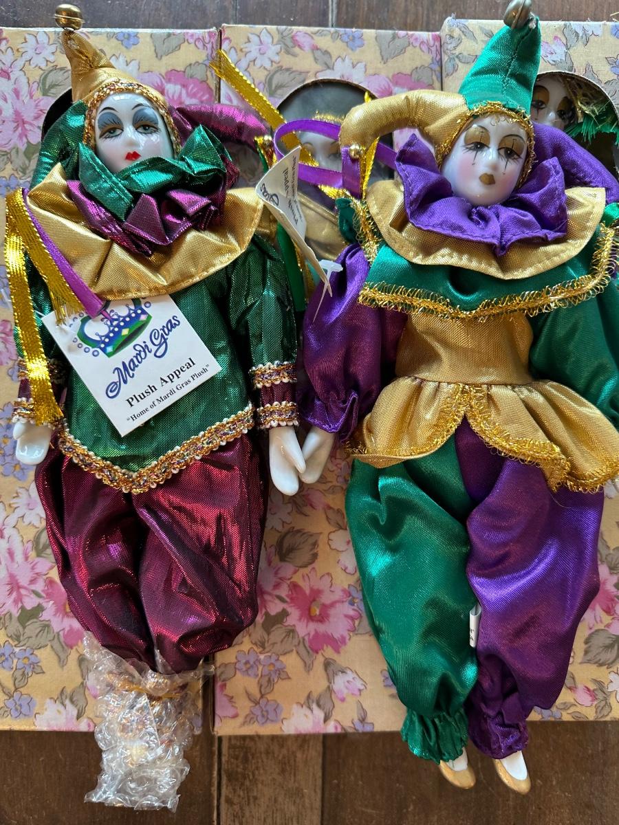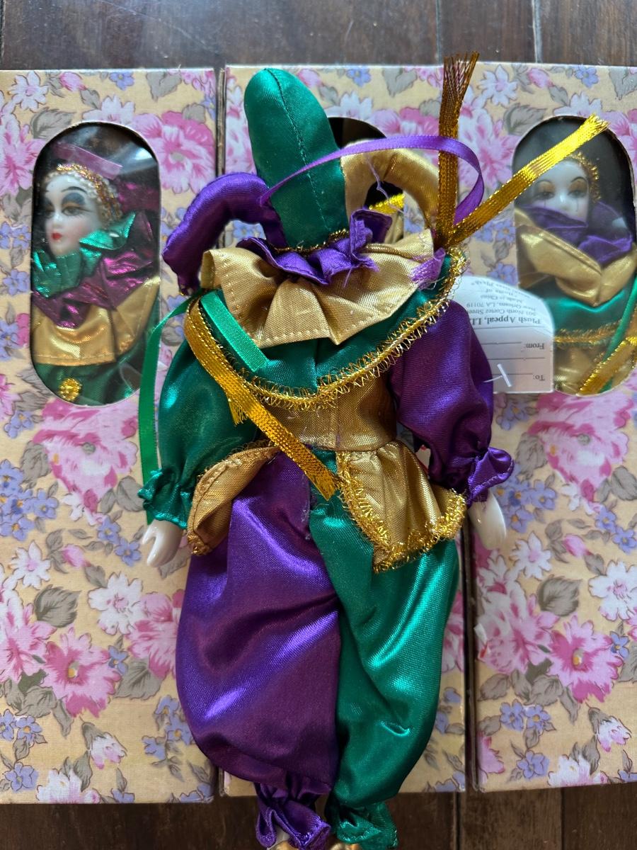 Porcelain Mardi Gras Jester Dolls in Original Boxes
