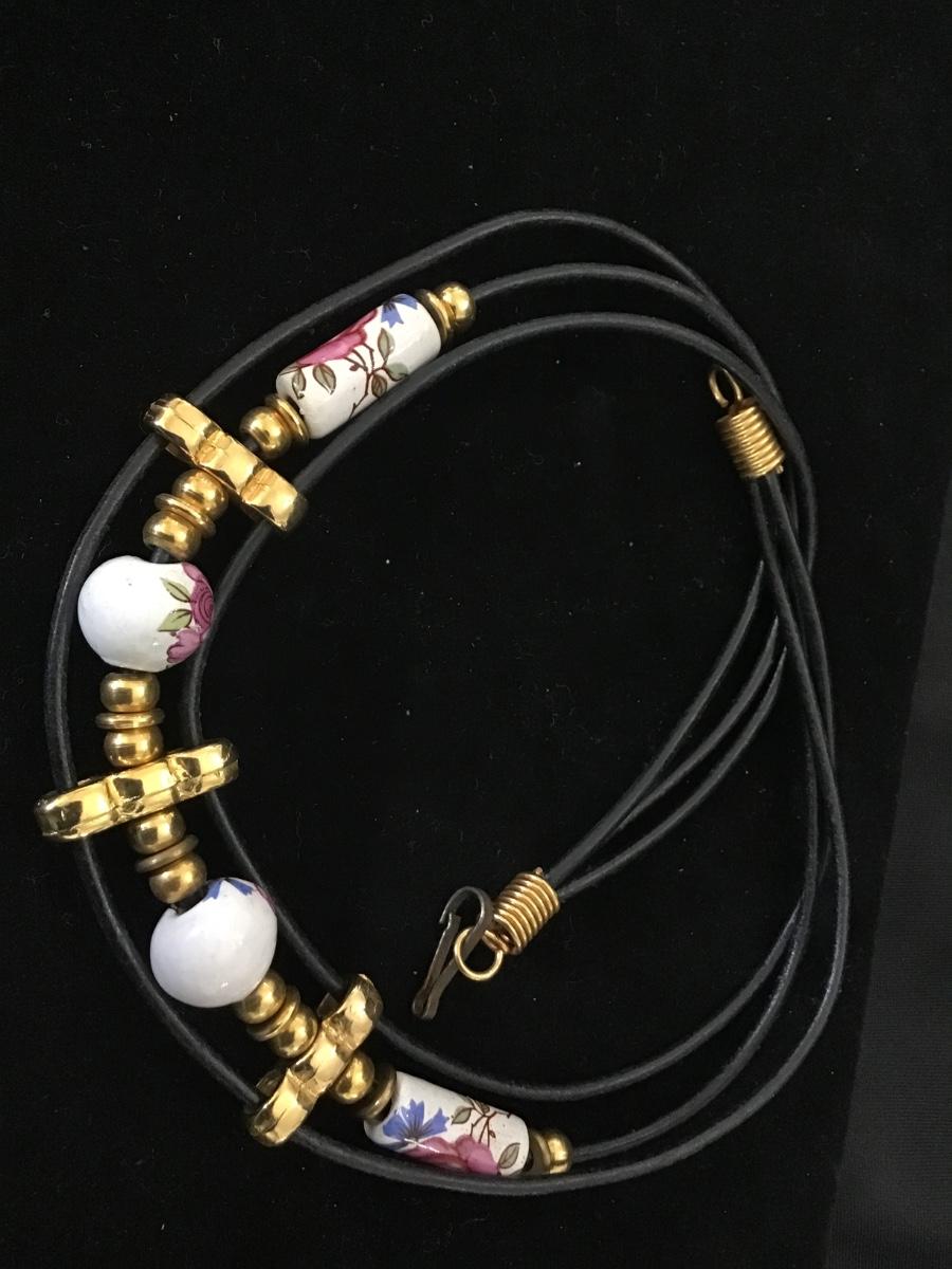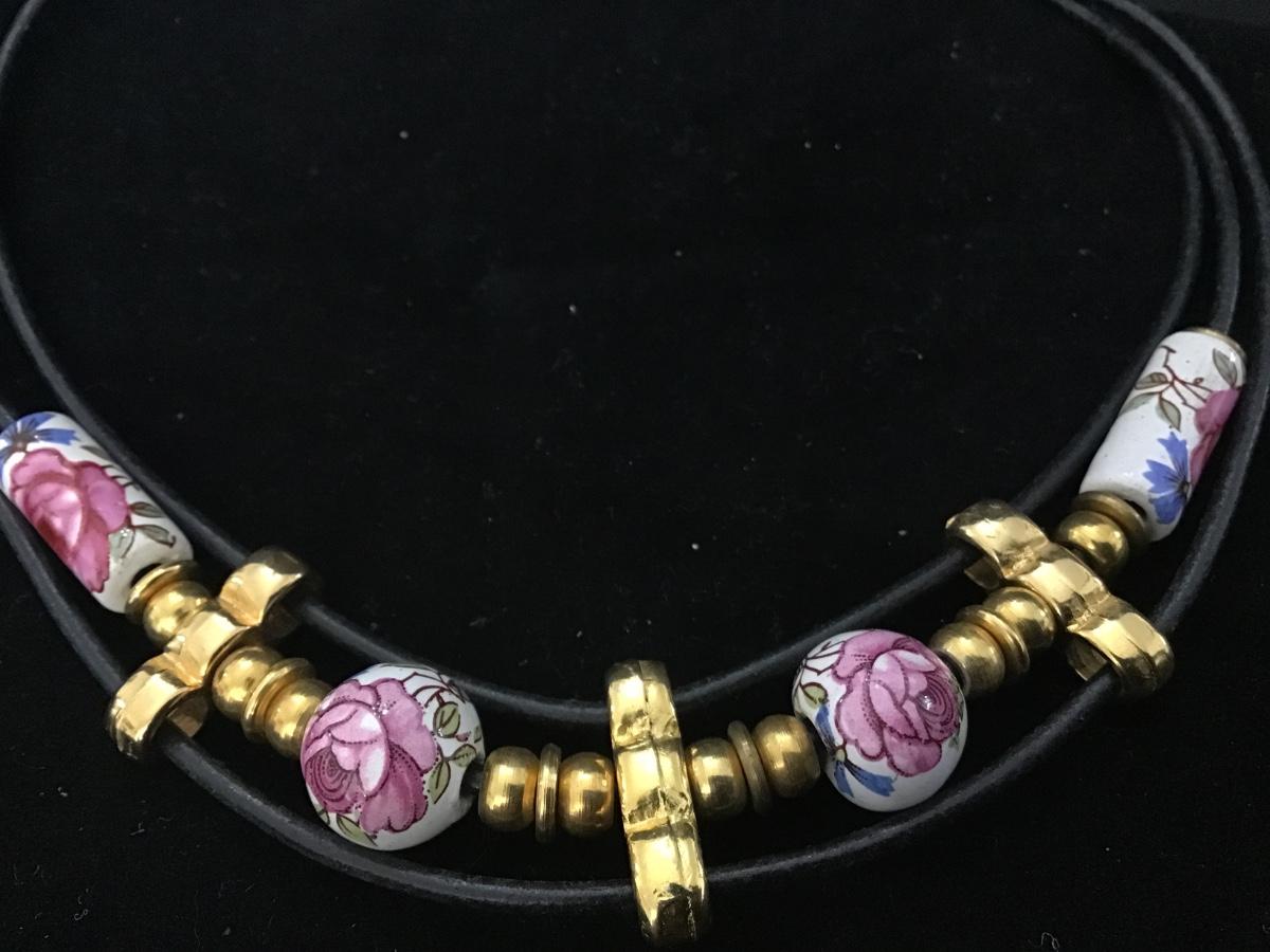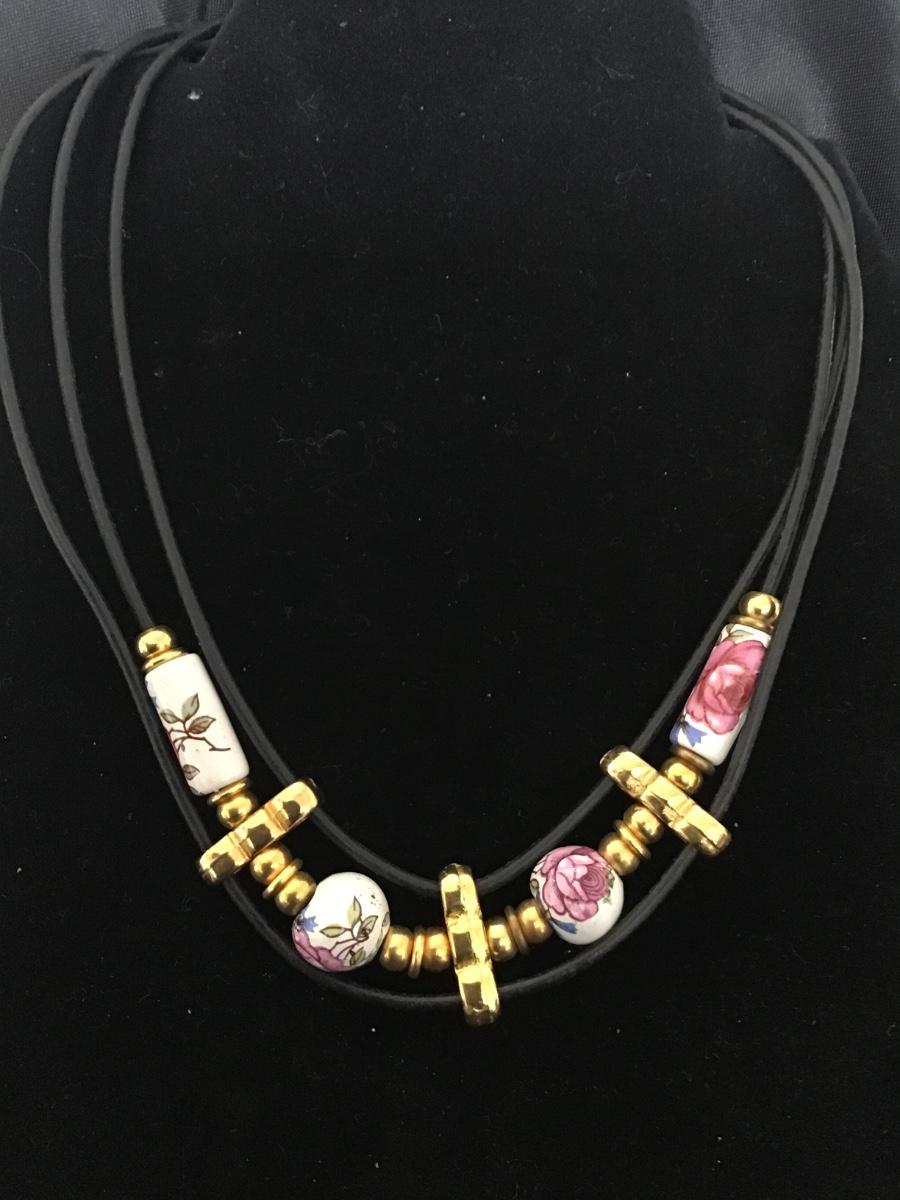 Porcelain Rose Bead Necklace Leather Type Necklace