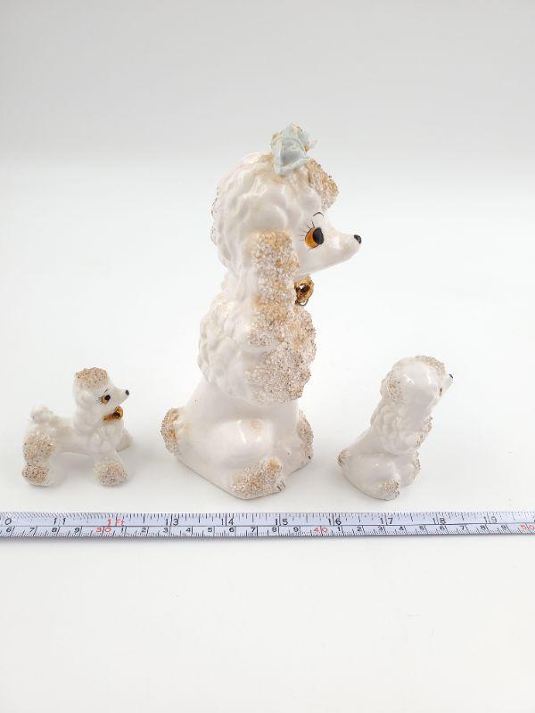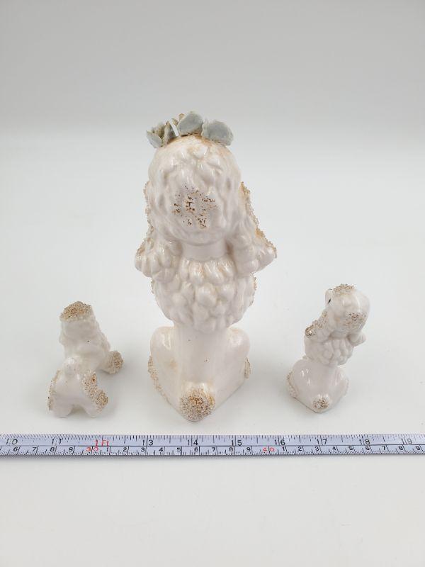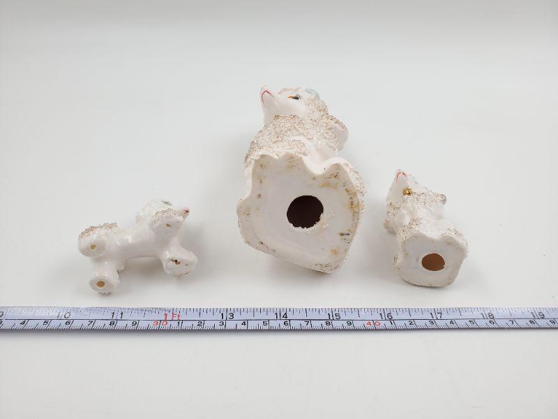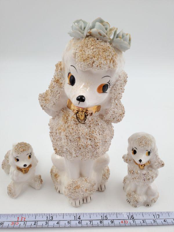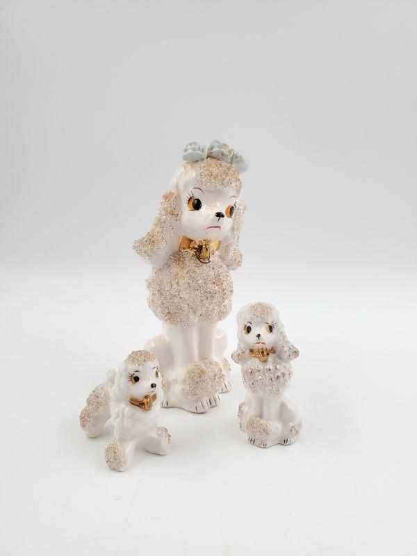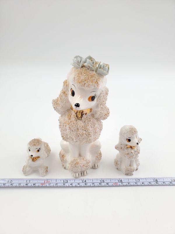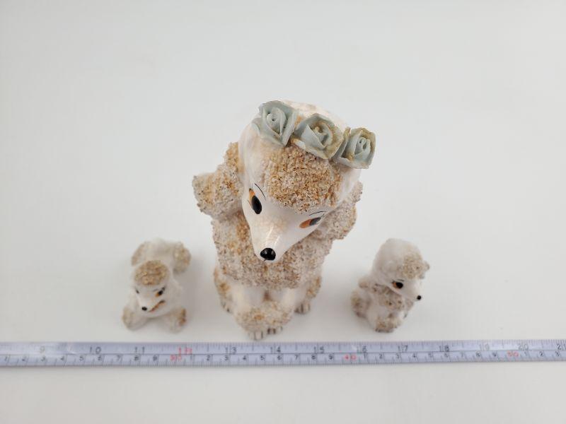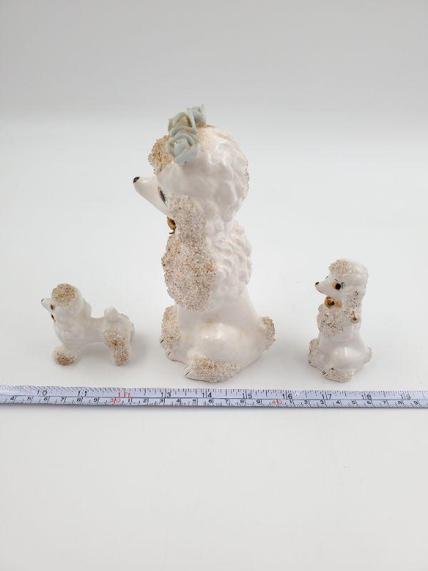Mama poodle and her pups, chain is missing but collars are intact and chain could be replaced. Figures do have crazing but no chips, cracks or breaks found. Adorable poodles accented with light blue flowers and gold "spaghetti" fur