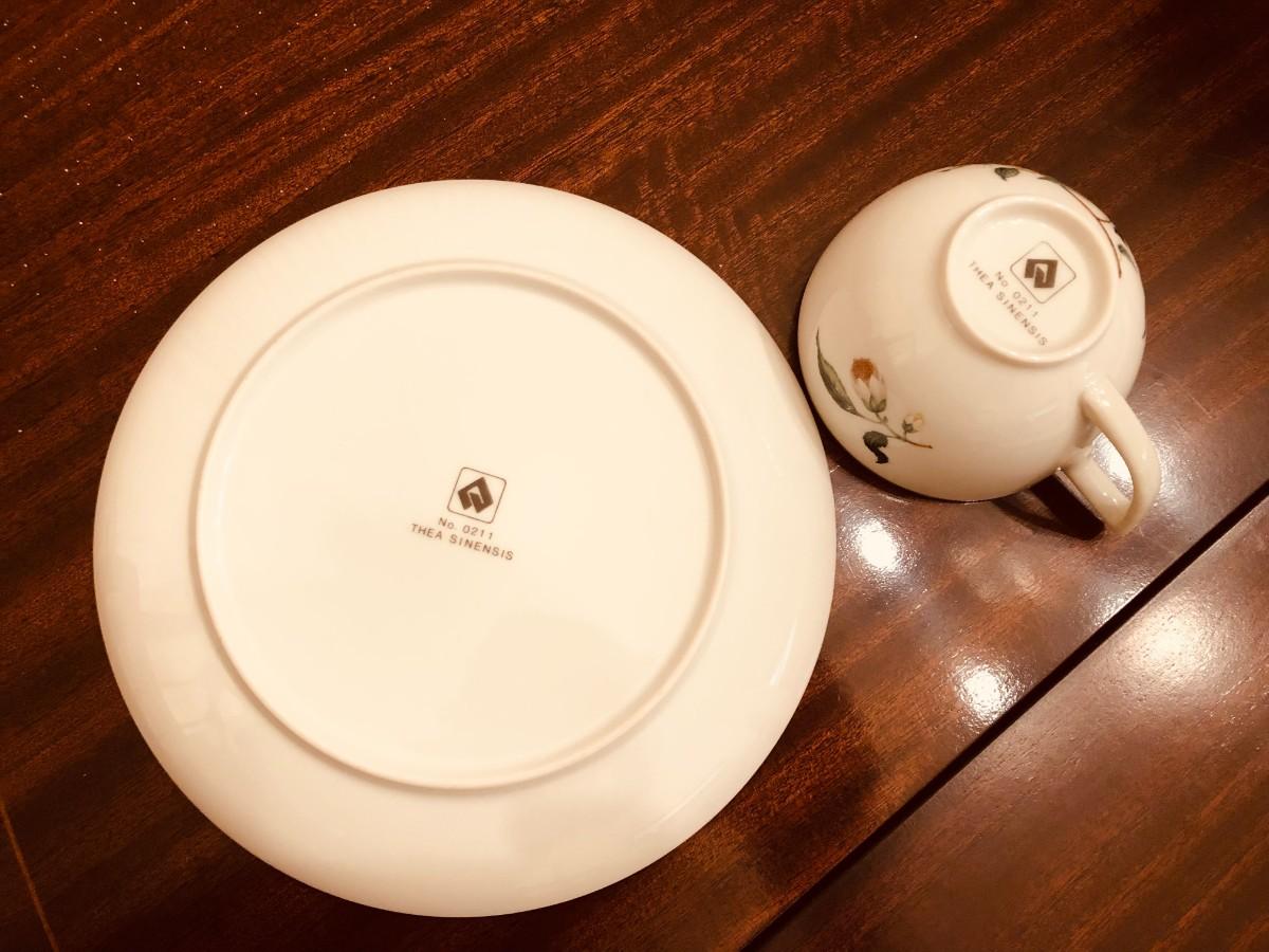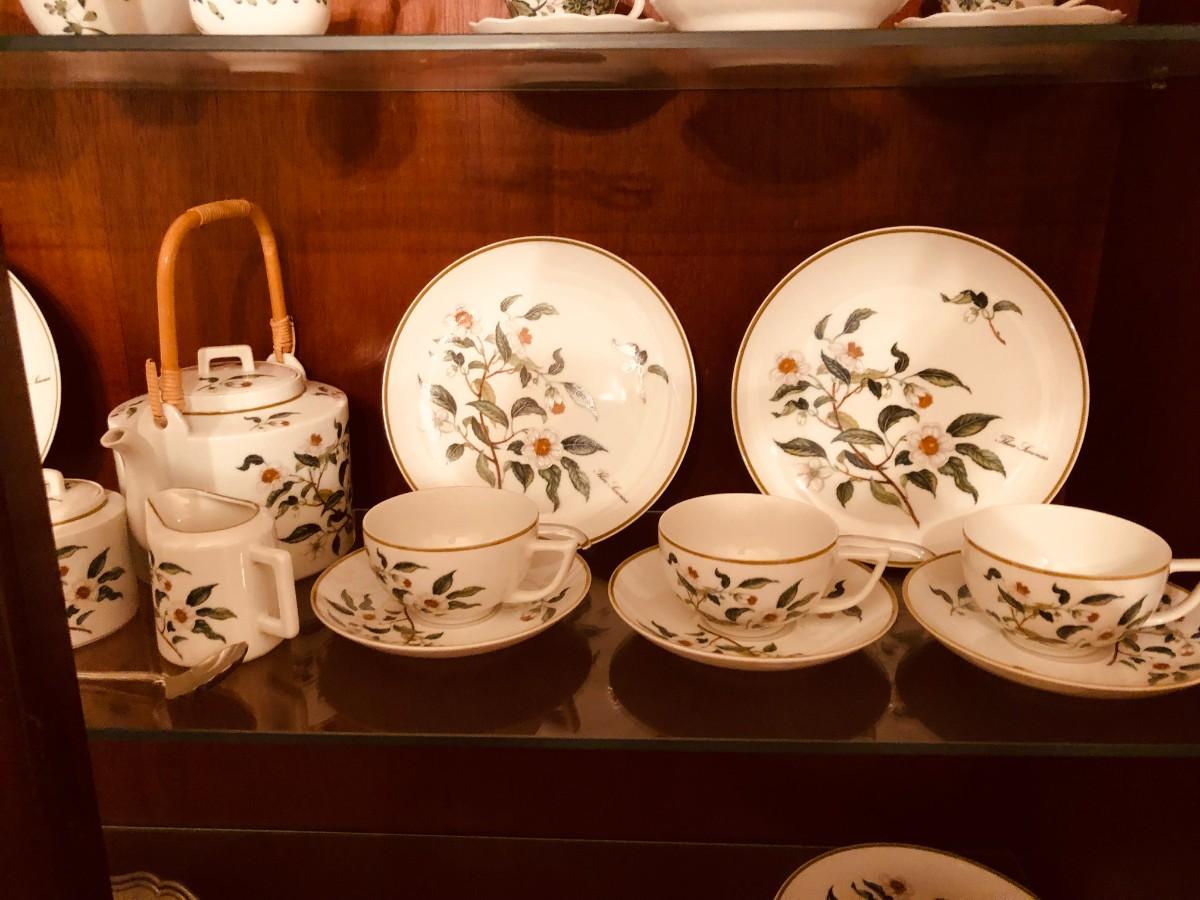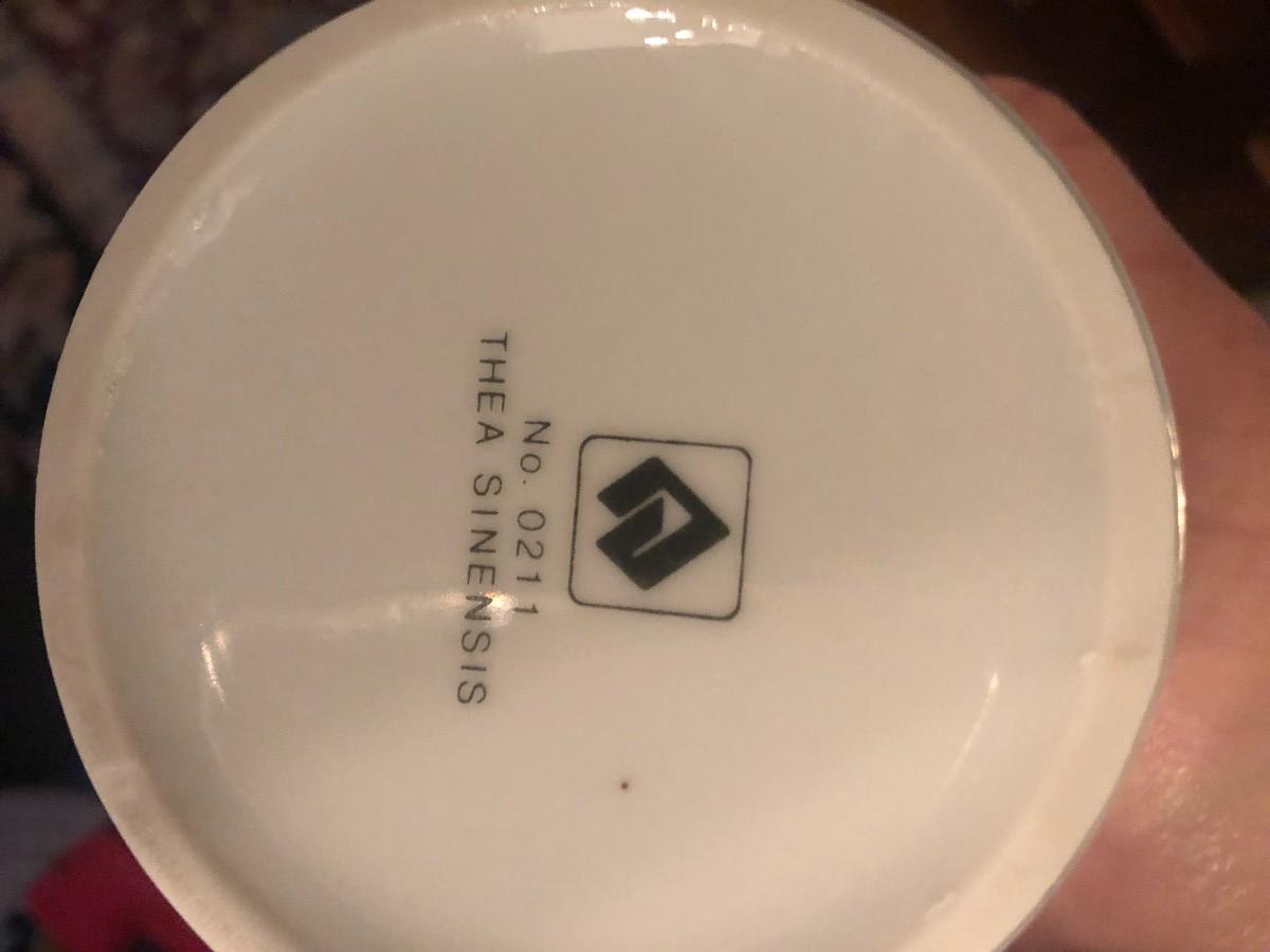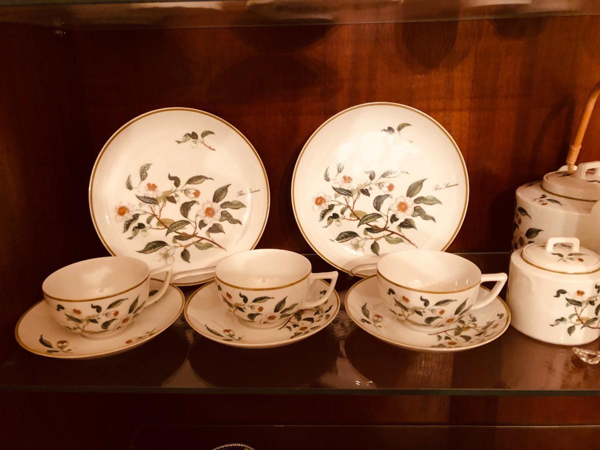 Serving for six, "Chamomile Tea" in German. Hand painted. Buyer responsible for packing up and removing from cabinet.