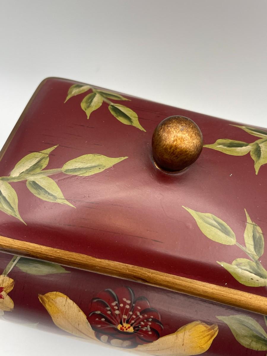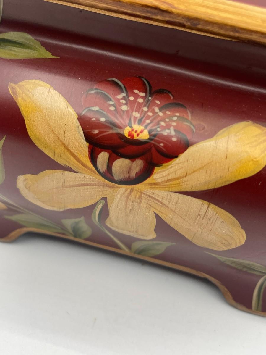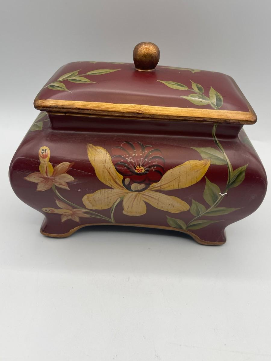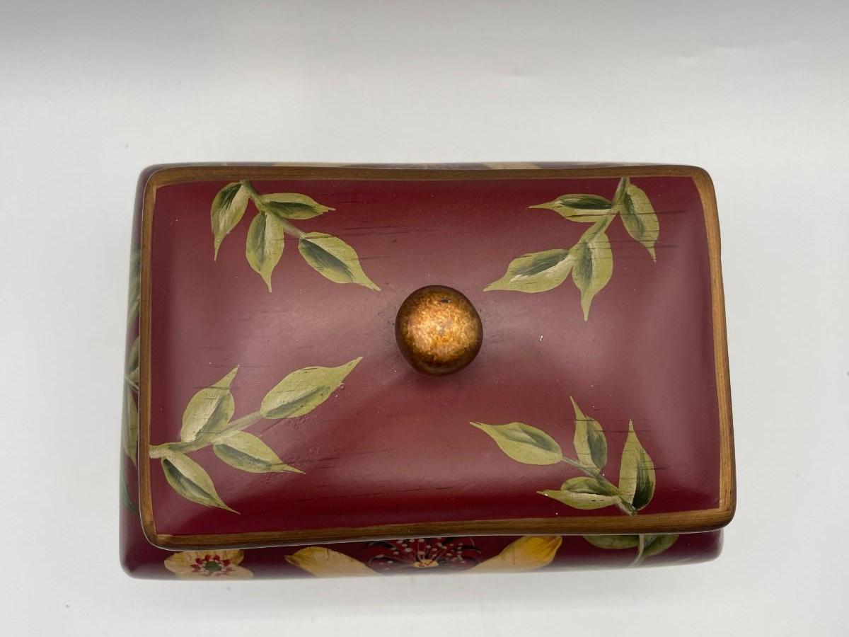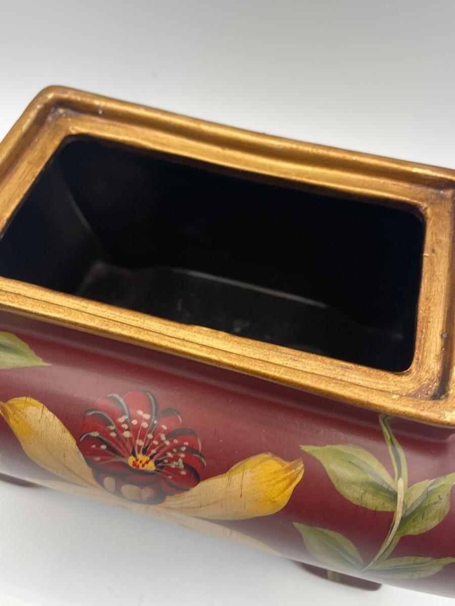 Charming box for trinkets, a catchall at the front or back doors, or that extra set of keys you need to keep handy. Lovely red color, footed box, with yellow floral accents. 8.5" W x 6" W x 6.5" H # 866