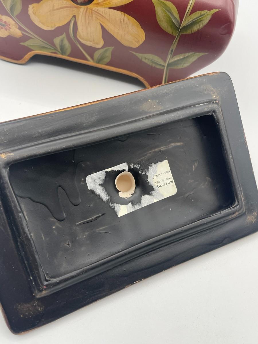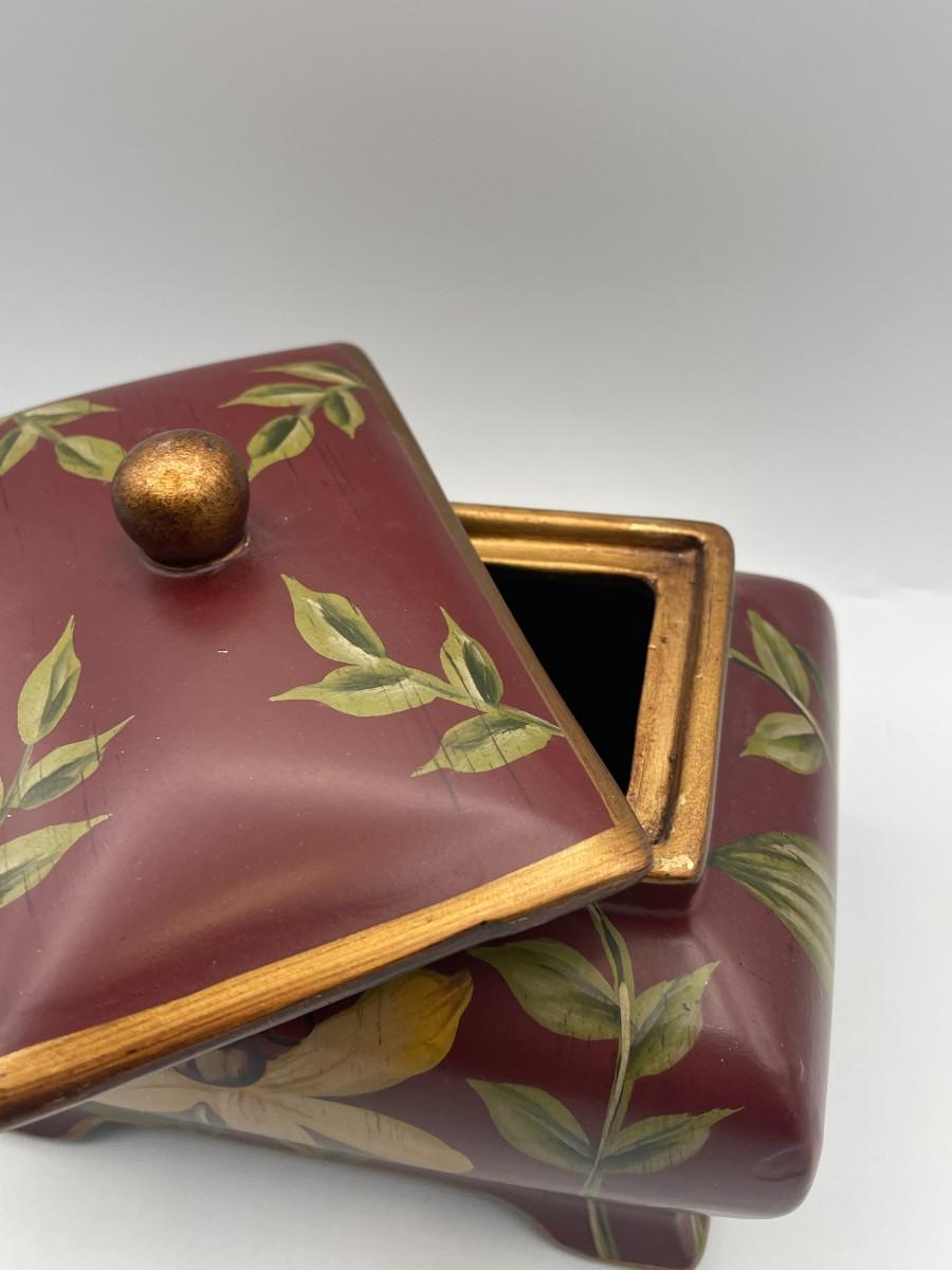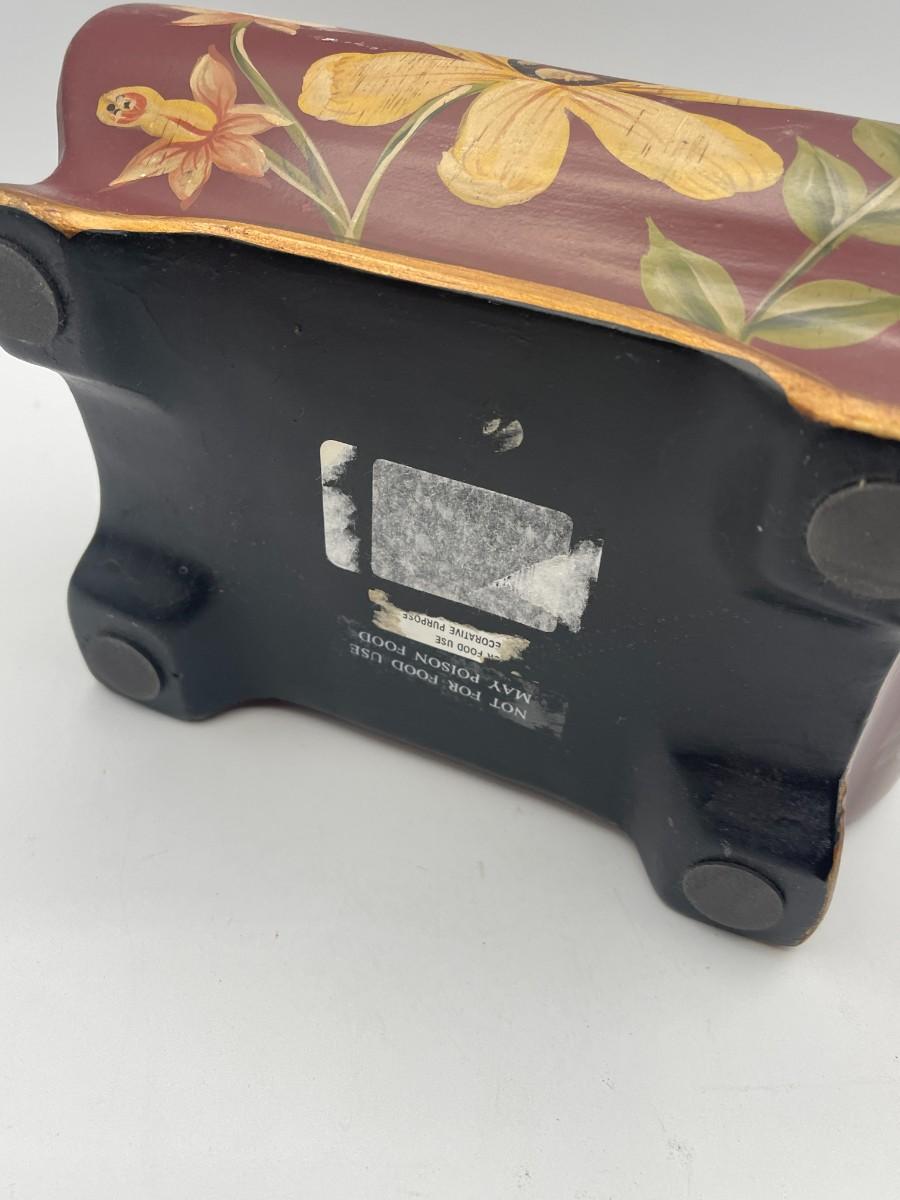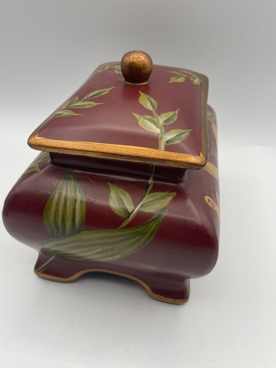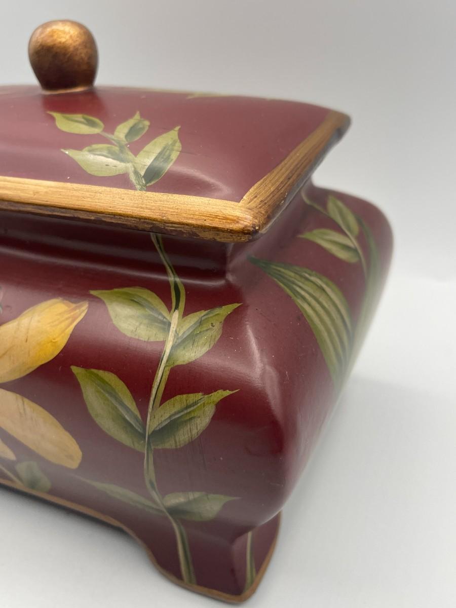 Charming box for trinkets, a catchall at the front or back doors, or that extra set of keys you need to keep handy. Lovely red color, footed box, with yellow floral accents. 8.5" W x 6" W x 6.5" H # 866