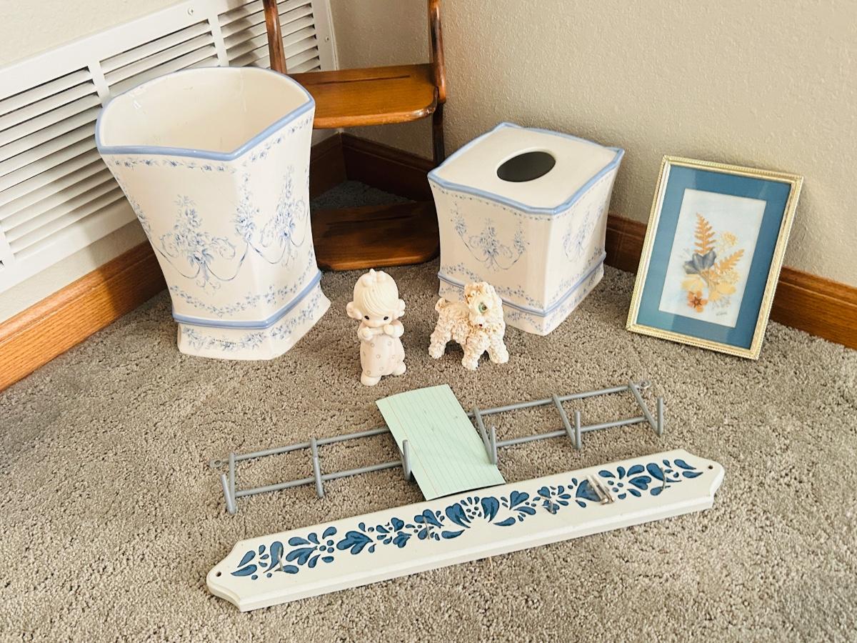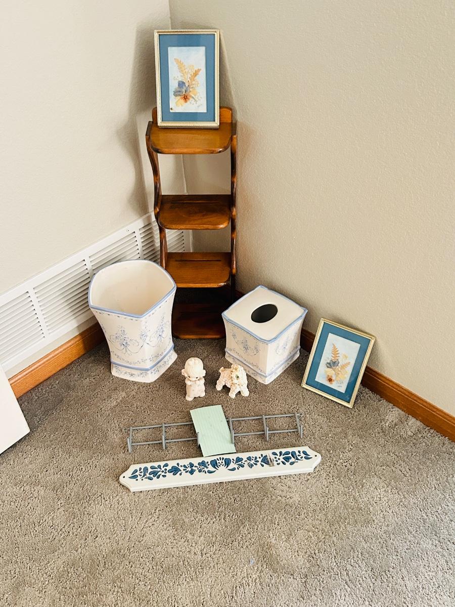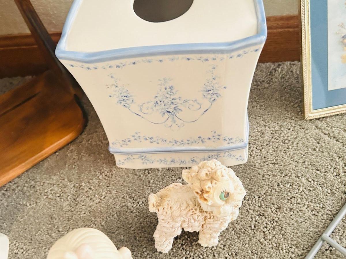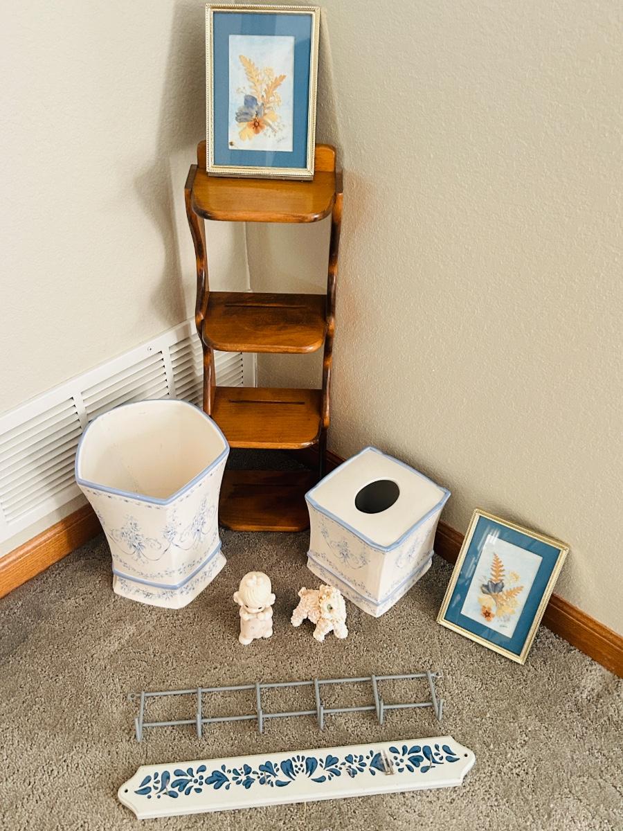 PORCELAIN WASTE CAN AND TISSUE HOLDER, WALL HOOKS AND HOME DECOR
