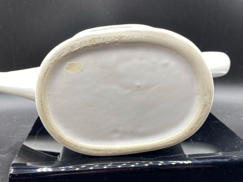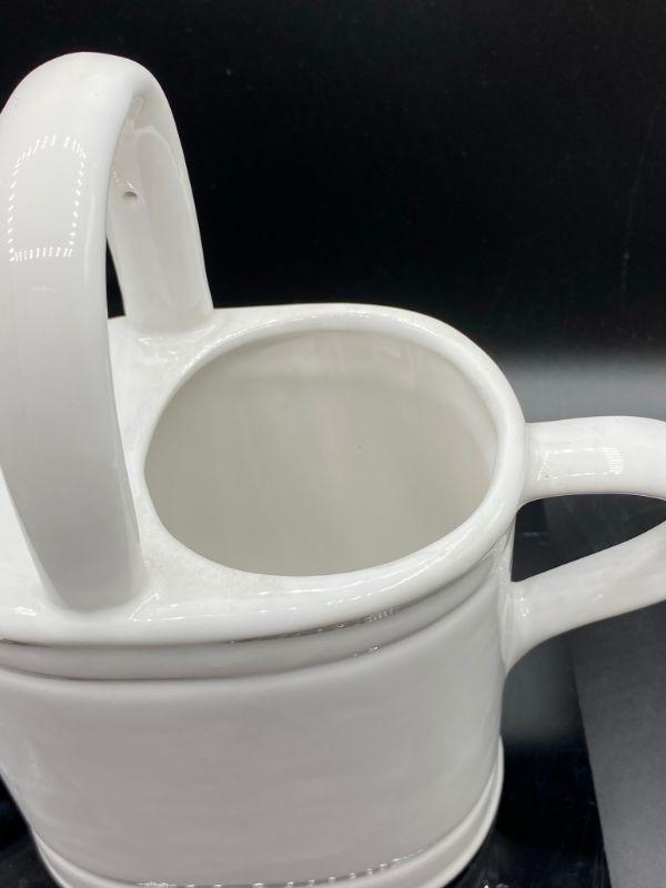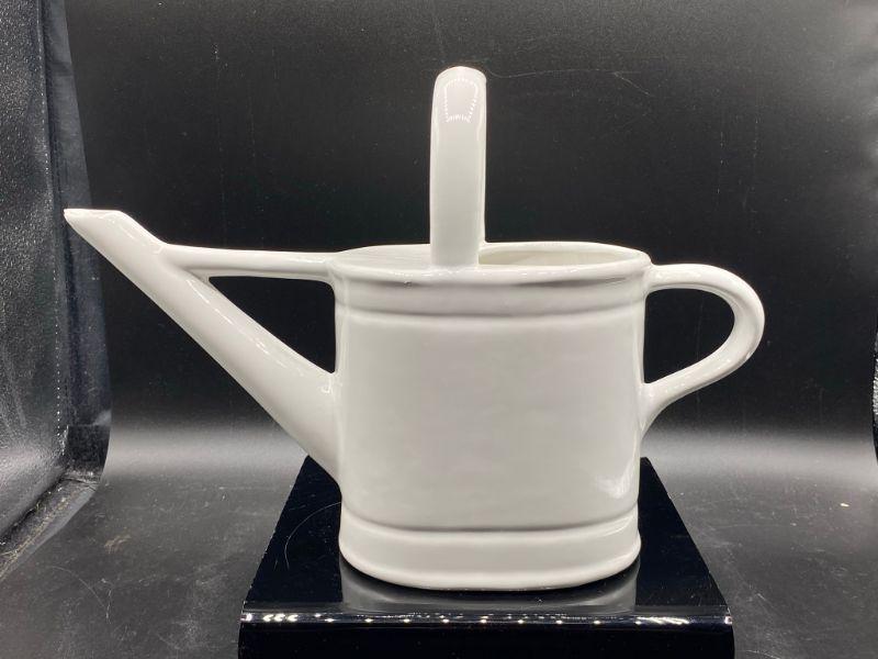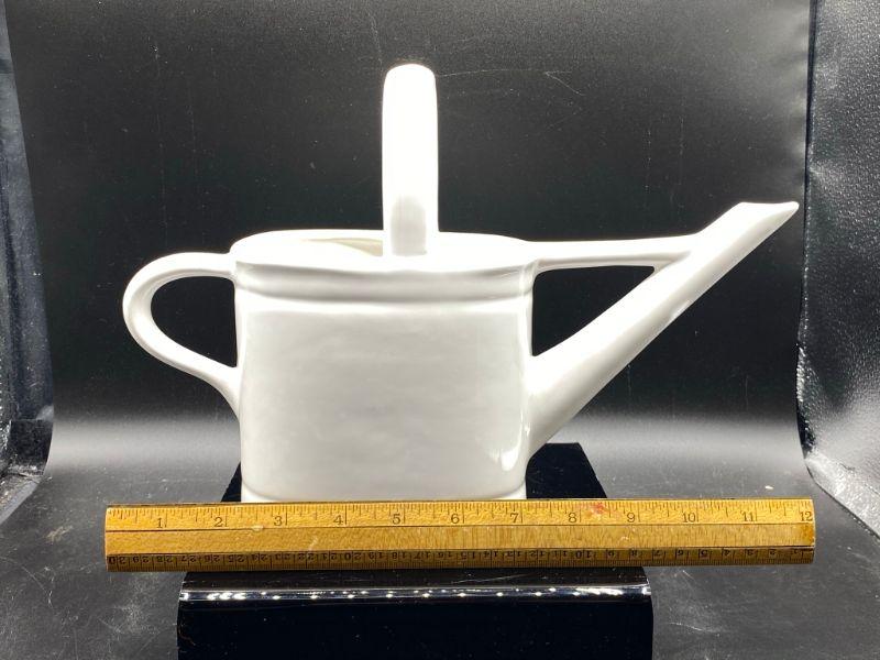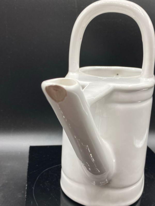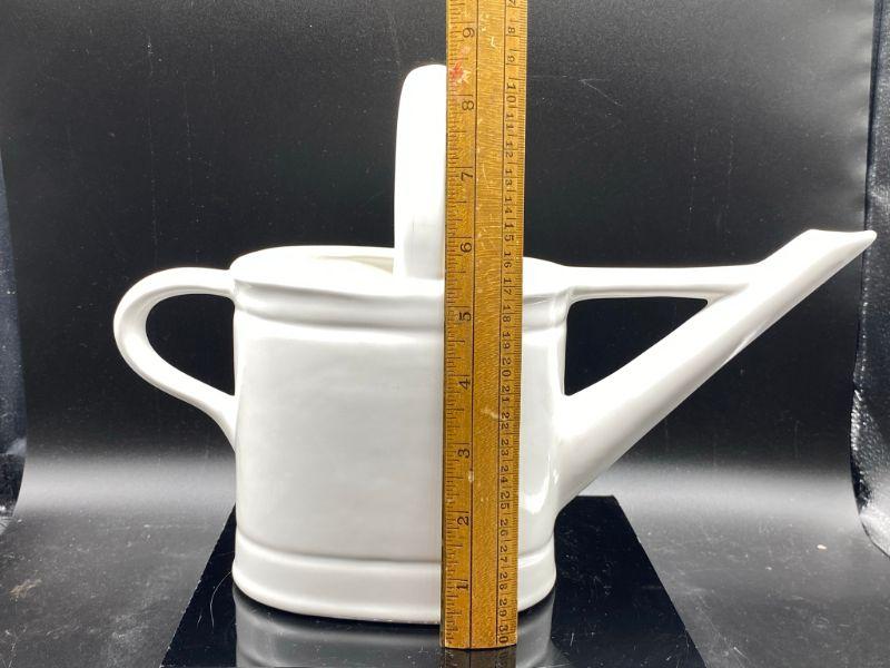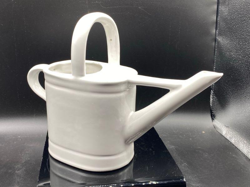 White porcelain watering can planter. Great as is or with a plant inside. Does have a chip on the end of spout. Unmarked. About 12" in length.