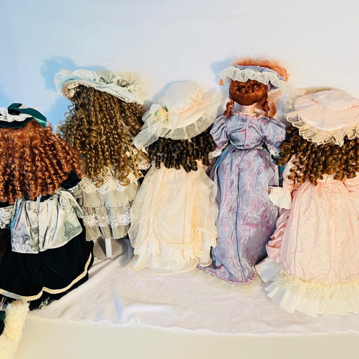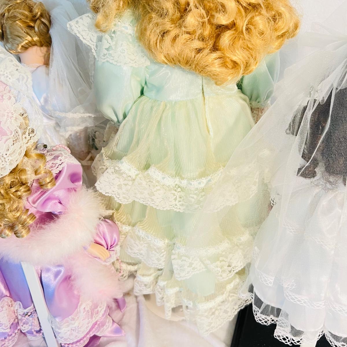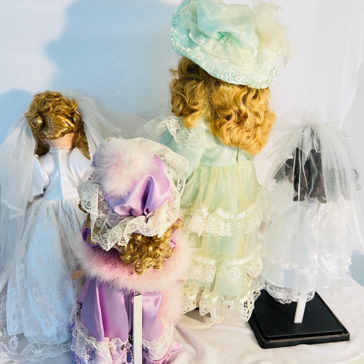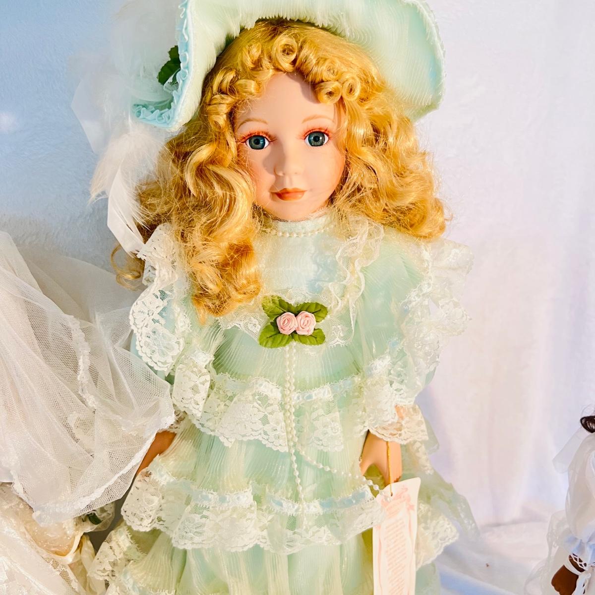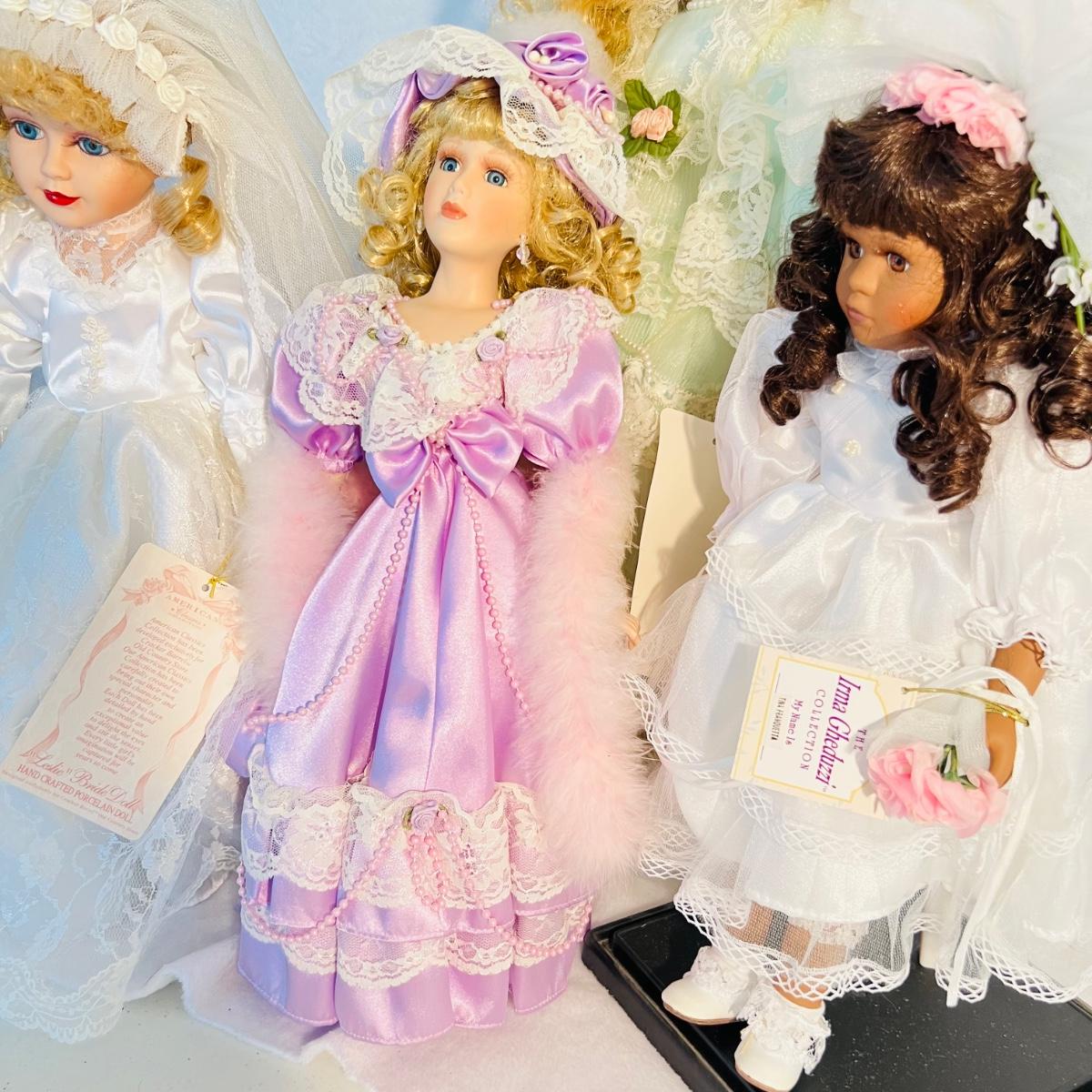 Collection includes five beautifully dressed porcelain dolls ready for a wedding including “Leslie” and a “Cassandra” Bride Dolls from American Classics and one Irma Gheduzzi Collection “Tina Franquetta” doll. All kept under plastic cases and in excellent condition. Leslie, in green, measures 24”H.