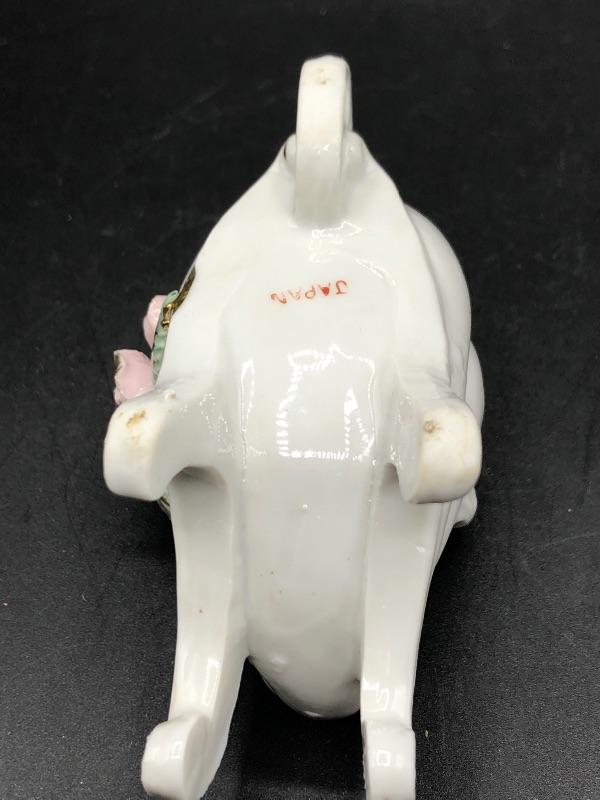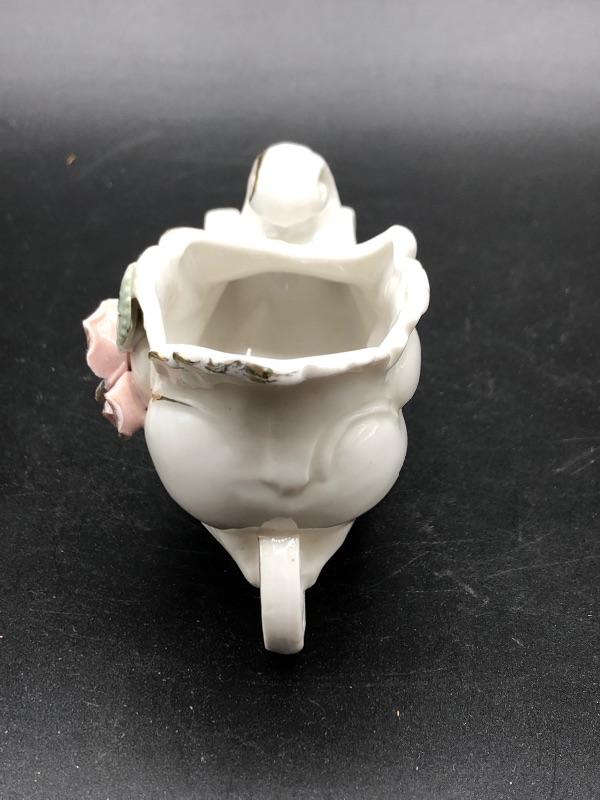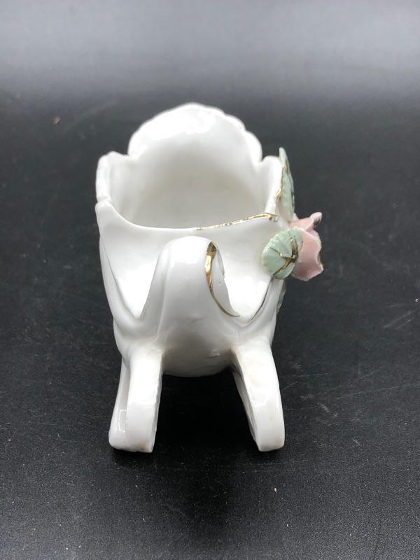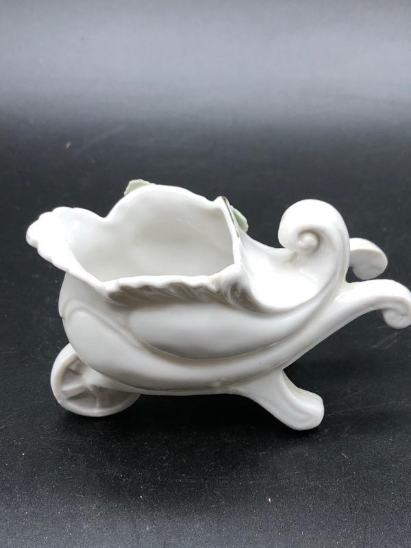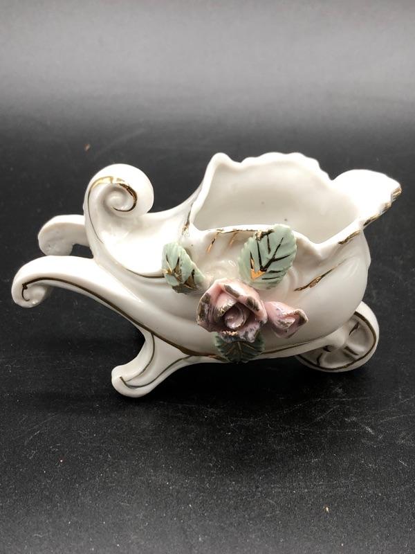 Fancy porcelain wheelbarrow. White with pink roses on the side. Made in Japan.