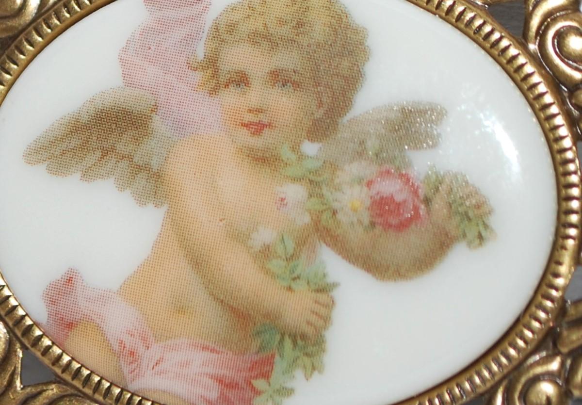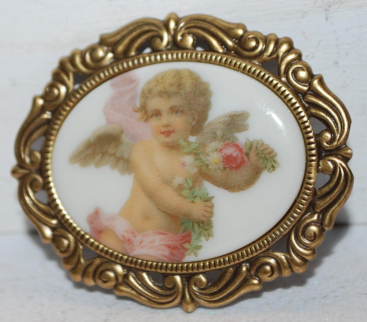 Porcelain-Style Oval CHERUB BROOCH (2" x 1¾") on a Brass-Colored Setting