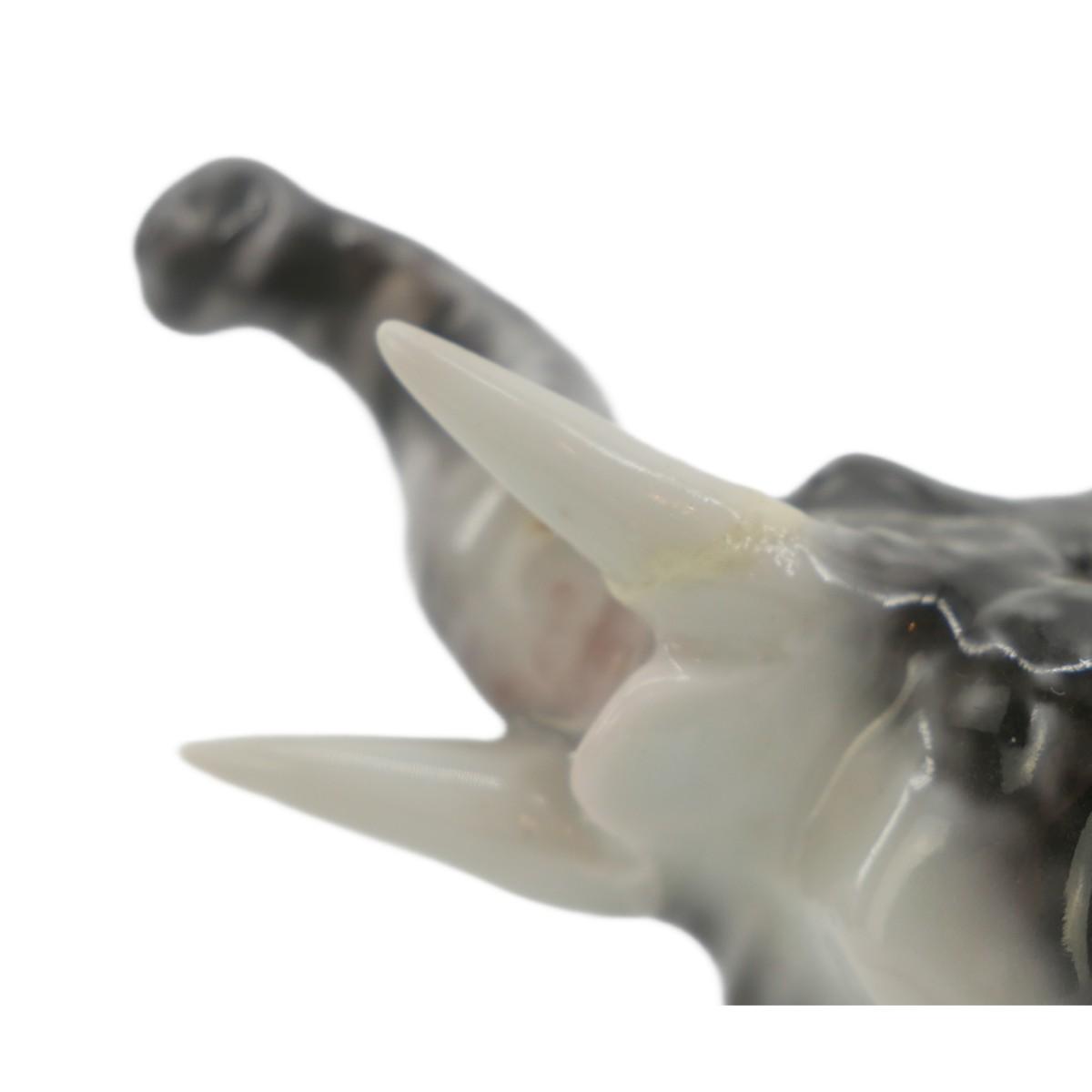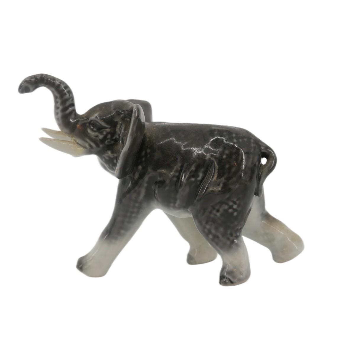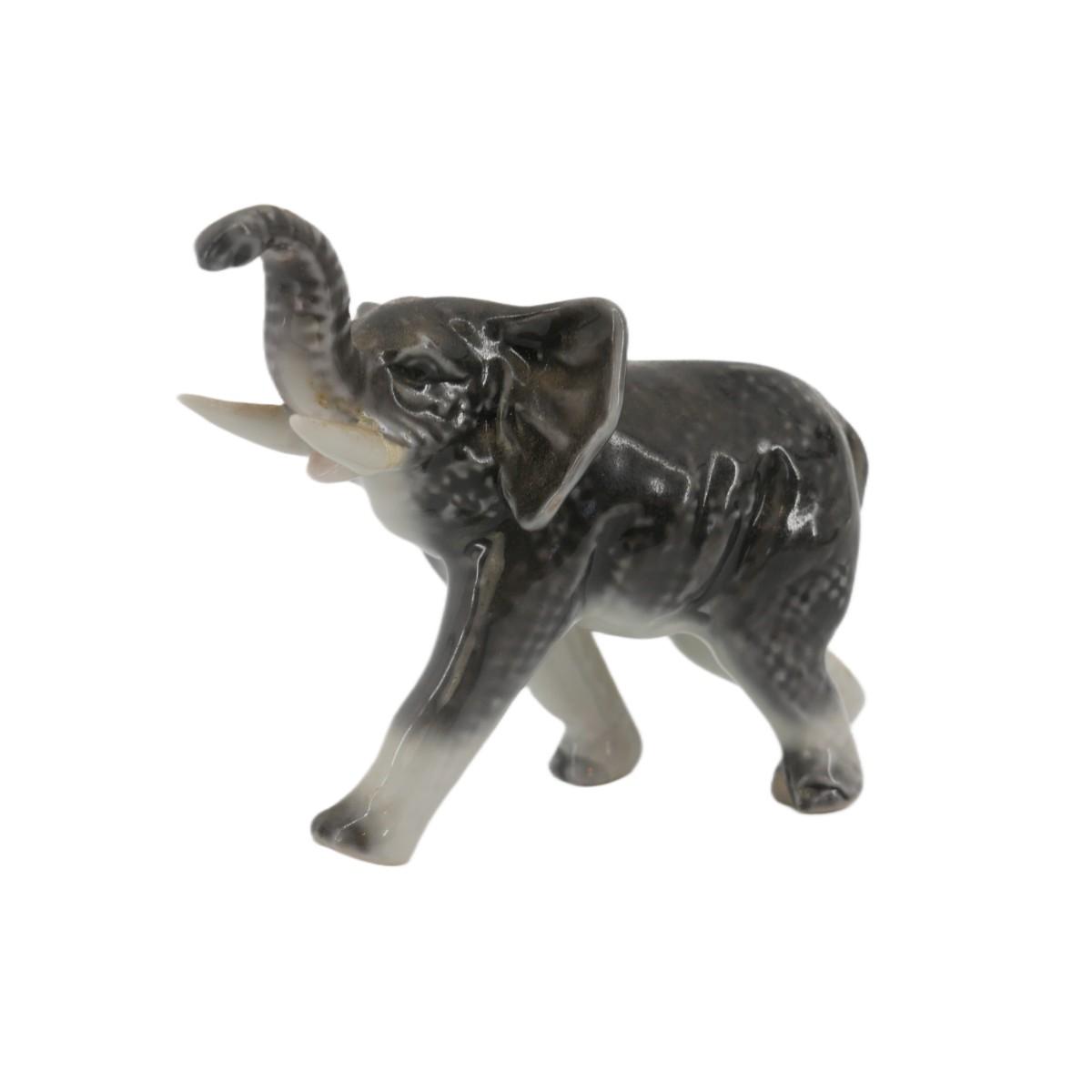 Porcelain elephant figurine with painted glaze, measures 3.5" x 2" x. 3.5", weighs 4.6 oz. Tusk has been repaired, see photos otherwise great condition!