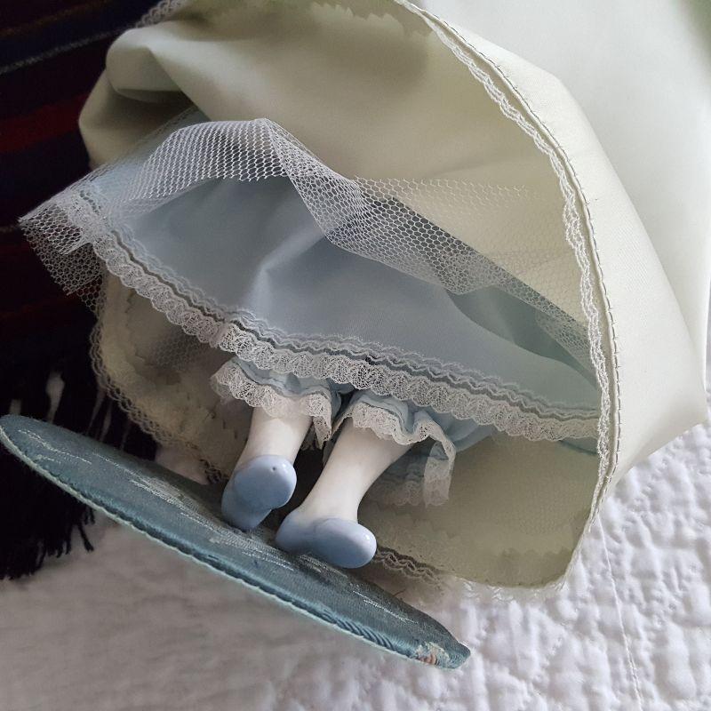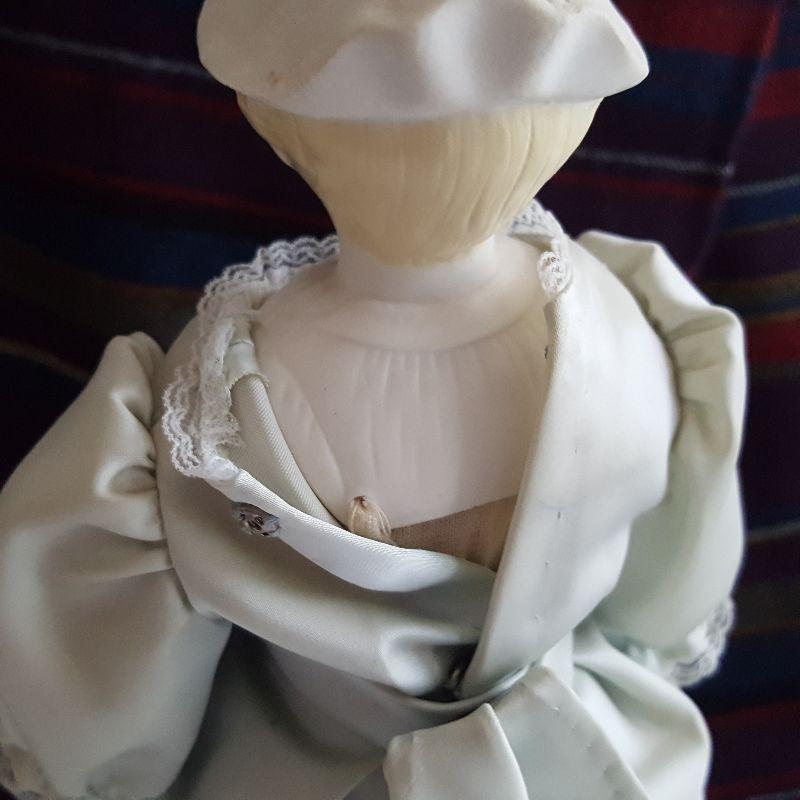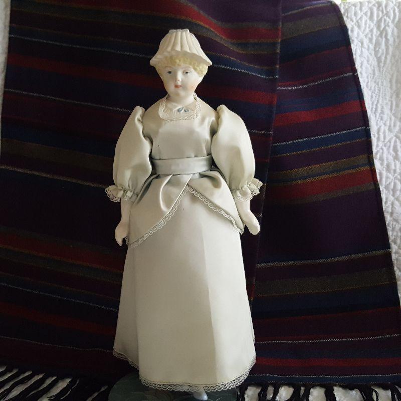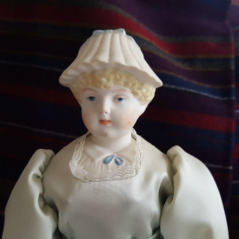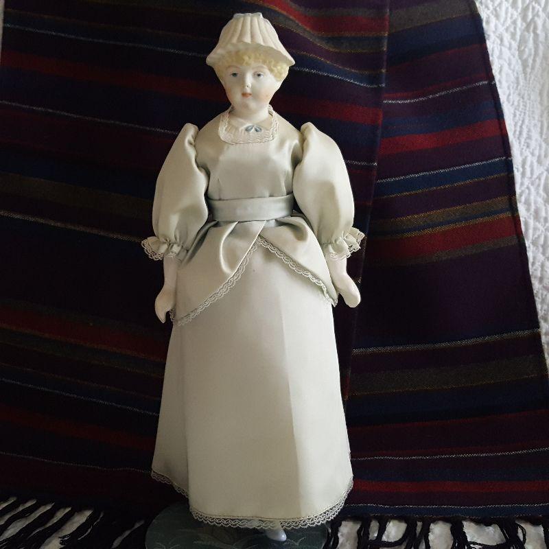 This auction lot is for a fine Vintage Porcelain Hatted Doll. This vintage doll comes with a stand to keep the girl upright. The doll is unique in that there are fewer examples of dolls with hats designed into the doll mold such as this. The doll is unmarked but does have both arms and legs intact. The doll stands about 12-inches tall. A nice example of it genre.