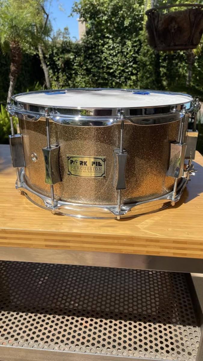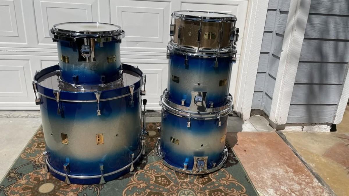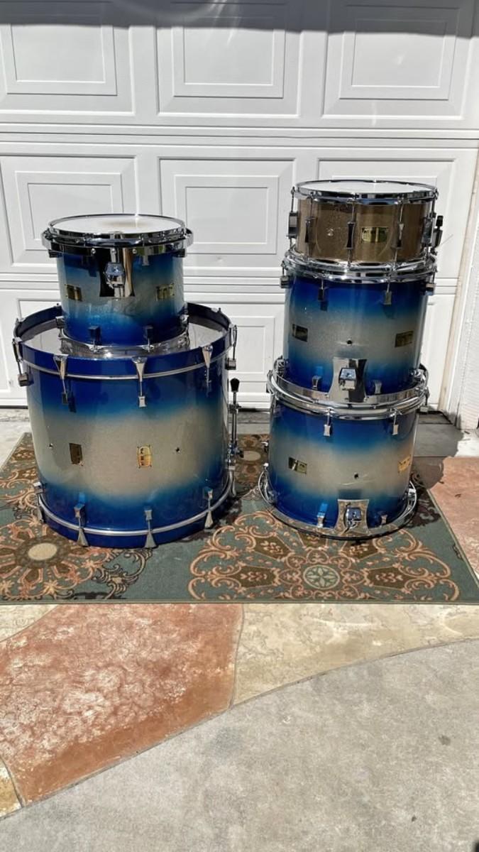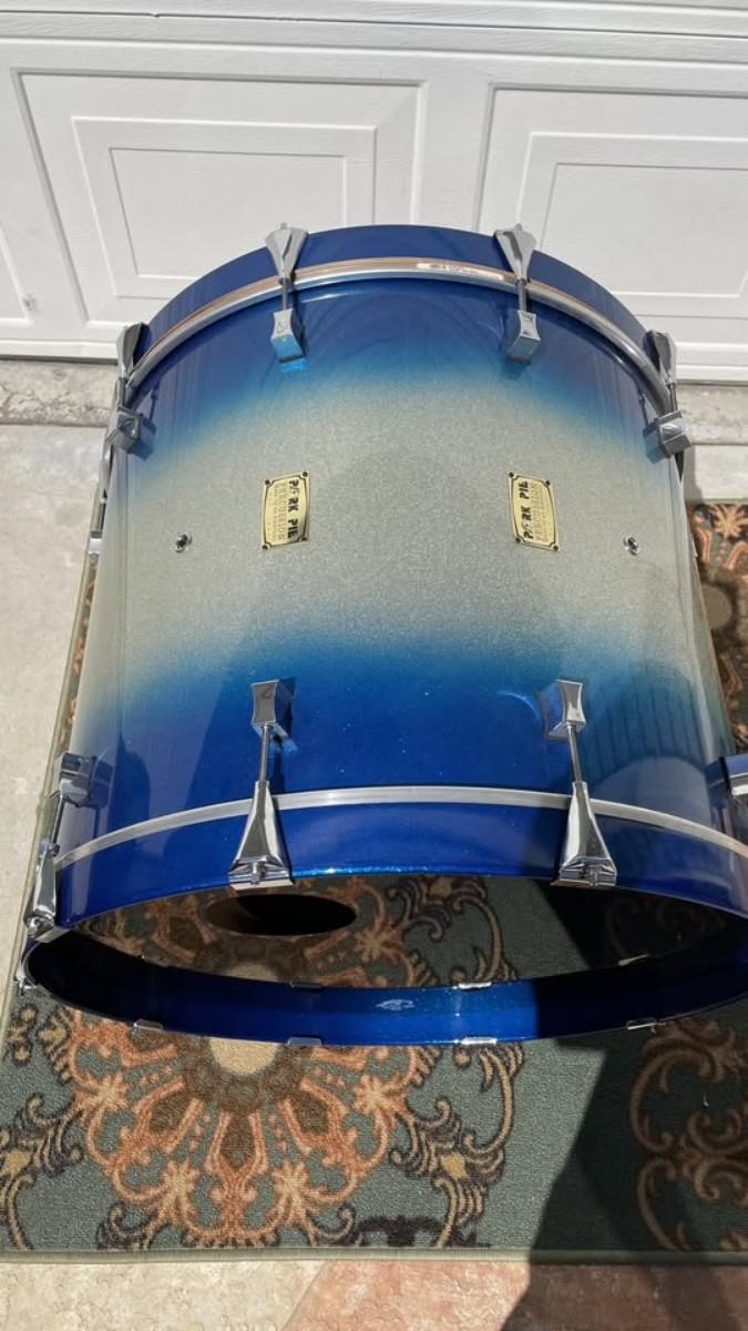 Made in America USA Custom line Pork Pie 5-piece drum set in blue-silver-blue sparkle lacquer burst and copper sparkle lacquer snare drum. Excellent condition and looks brand new.