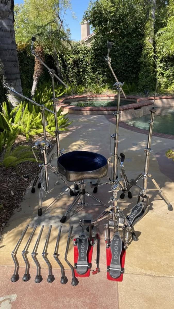 Heavy duty double braced Pork Pie stands. 2 cymbal stands, tom stand with cymbal holder, snare stand, DW 5000 hi-hat stand, DW 5000 double bass drum pedal, Pork Pie matching throne in the same color combination as the kit, isolation mounts for the floor toms with free floating tom legs.