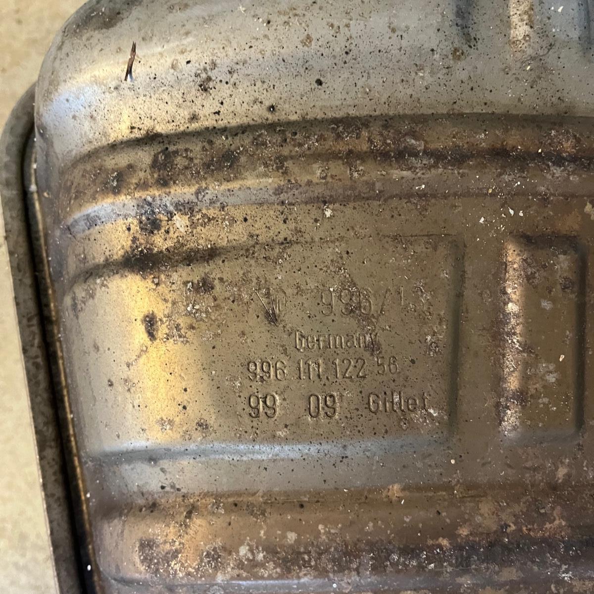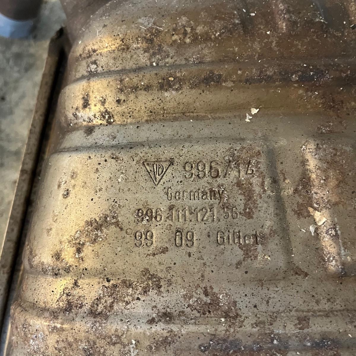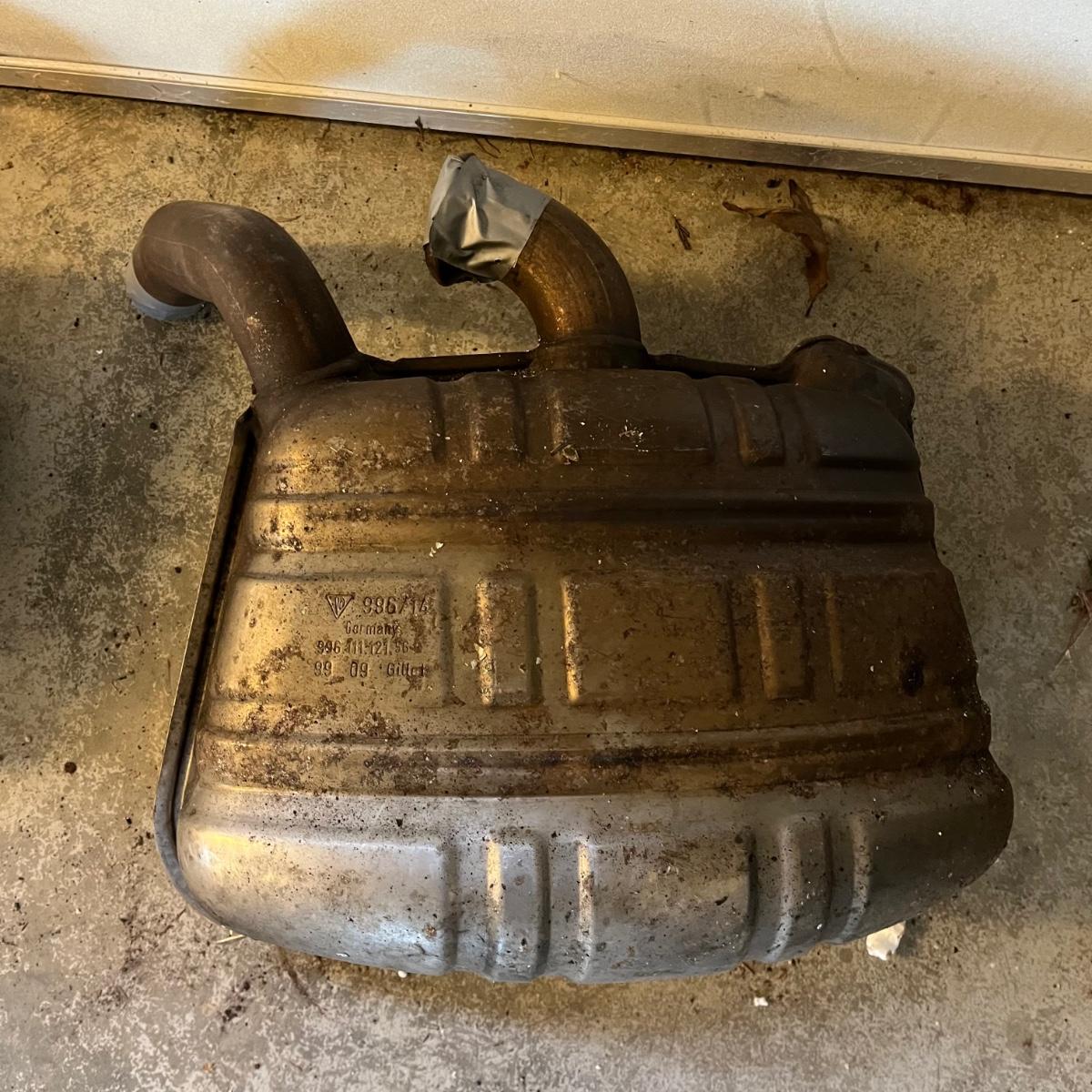 Lot includes Porsche 911 exhaust mufflers left and right sides. Mufflers have part number 996.111.121 56 and 996.111.122 56.