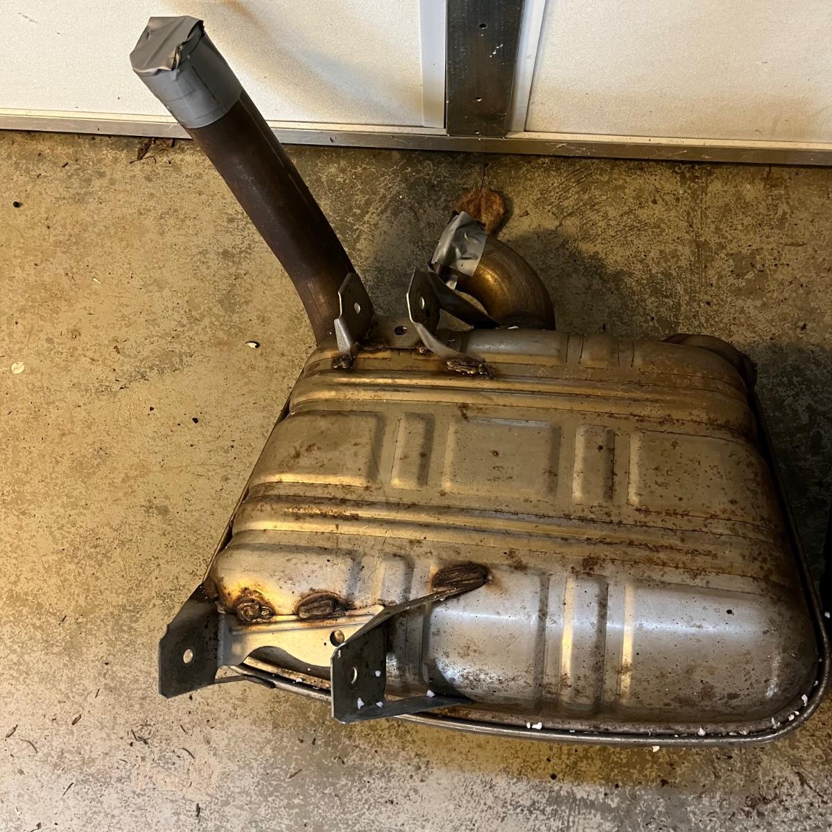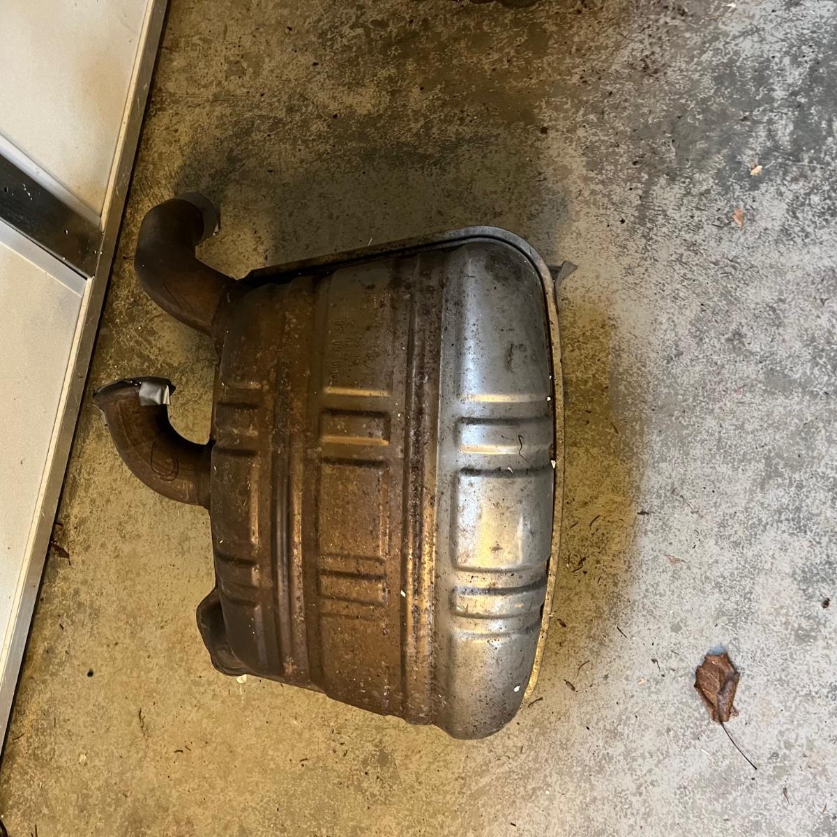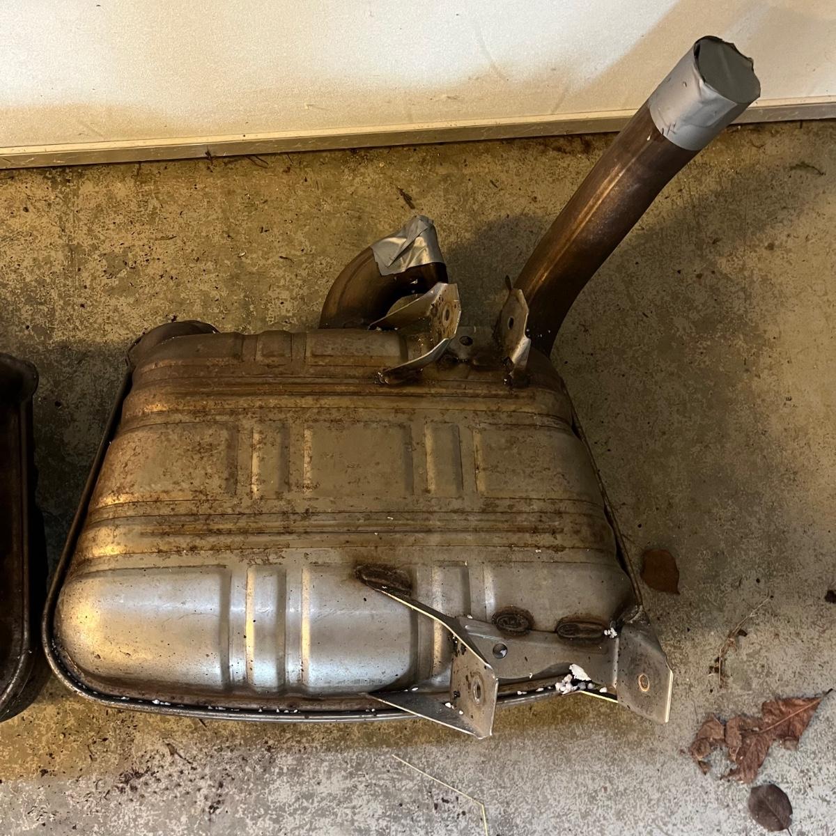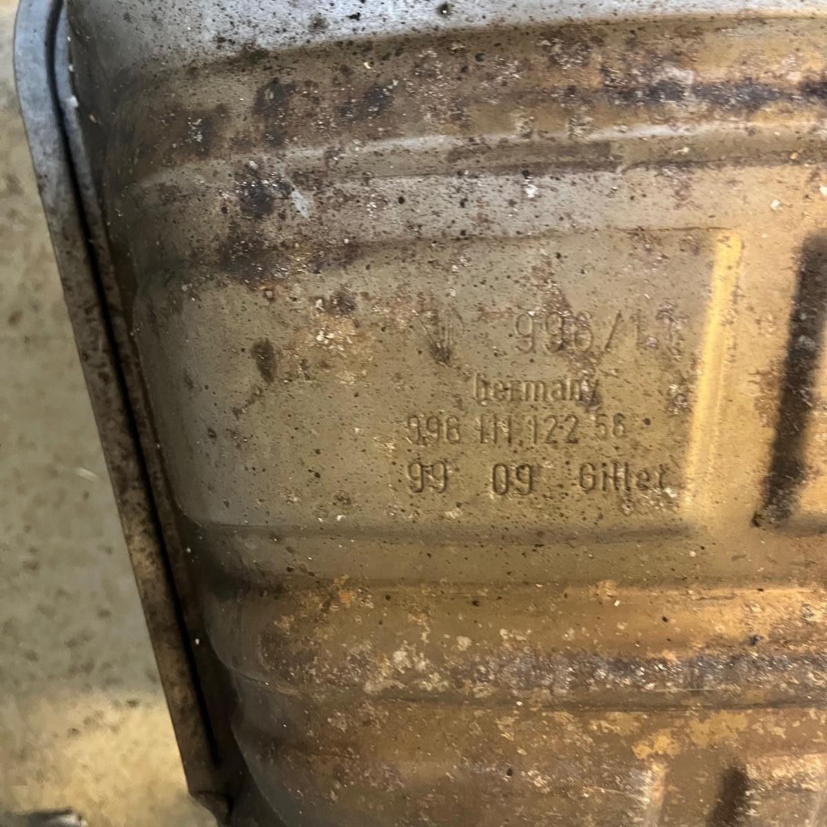 Lot includes Porsche 911 exhaust mufflers left and right sides. Mufflers have part number 996.111.121 56 and 996.111.122 56.