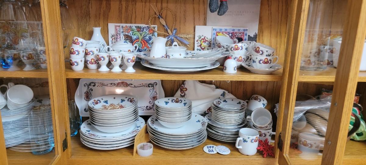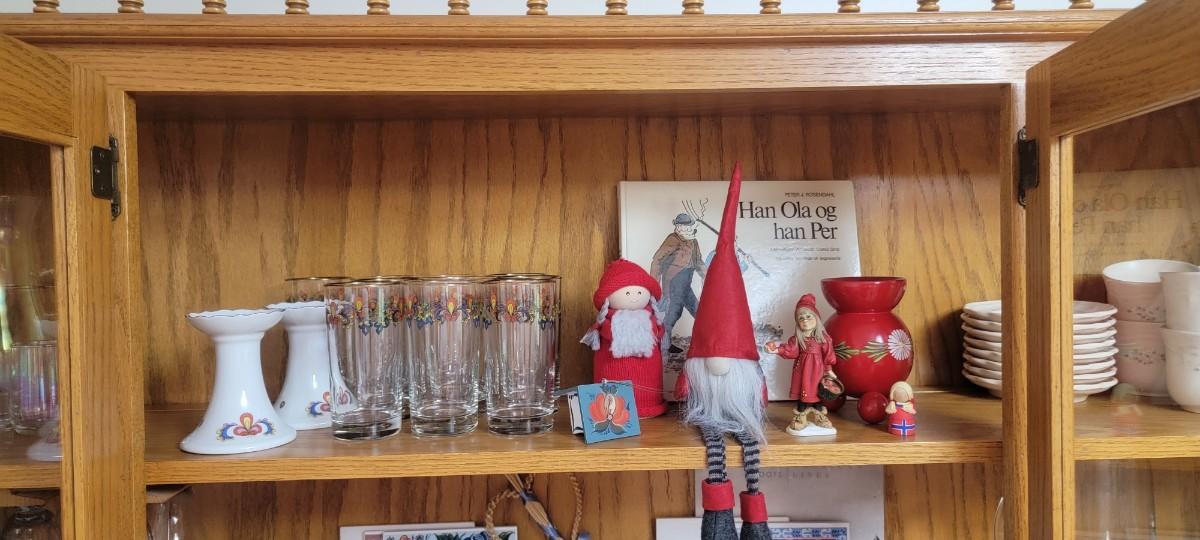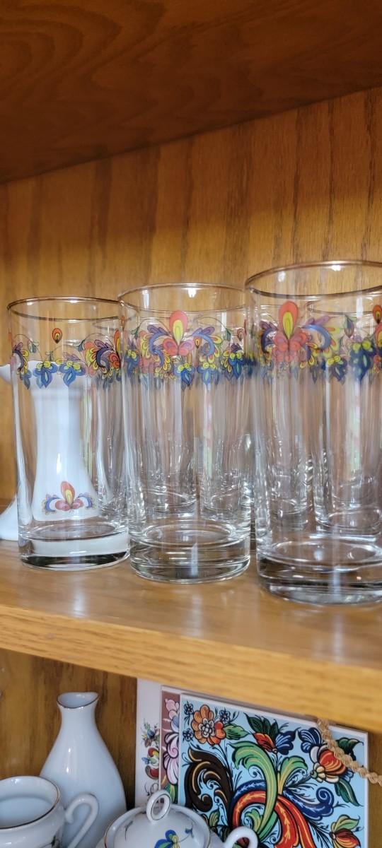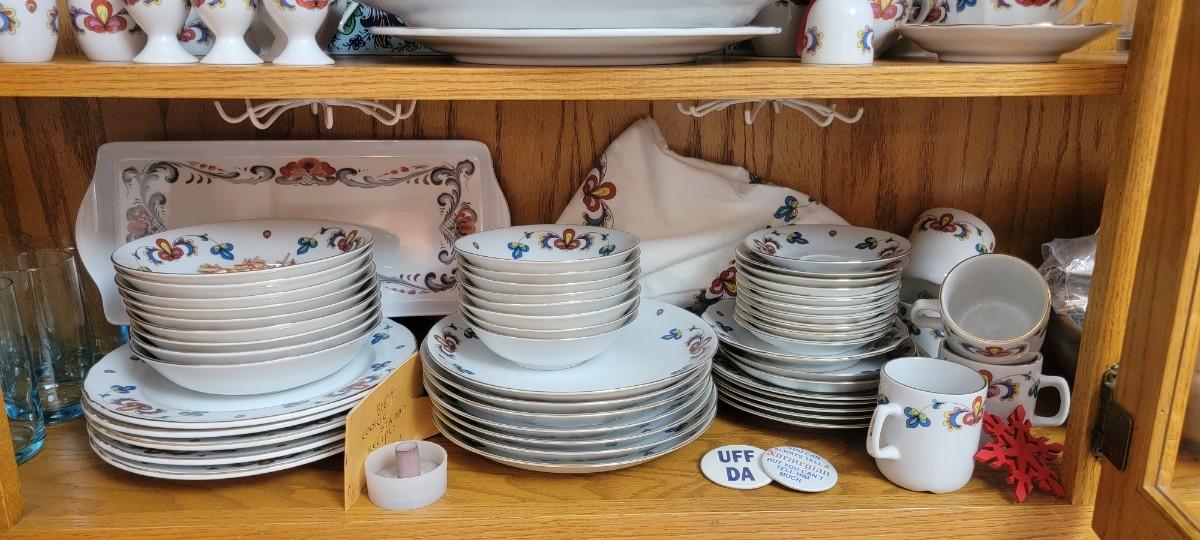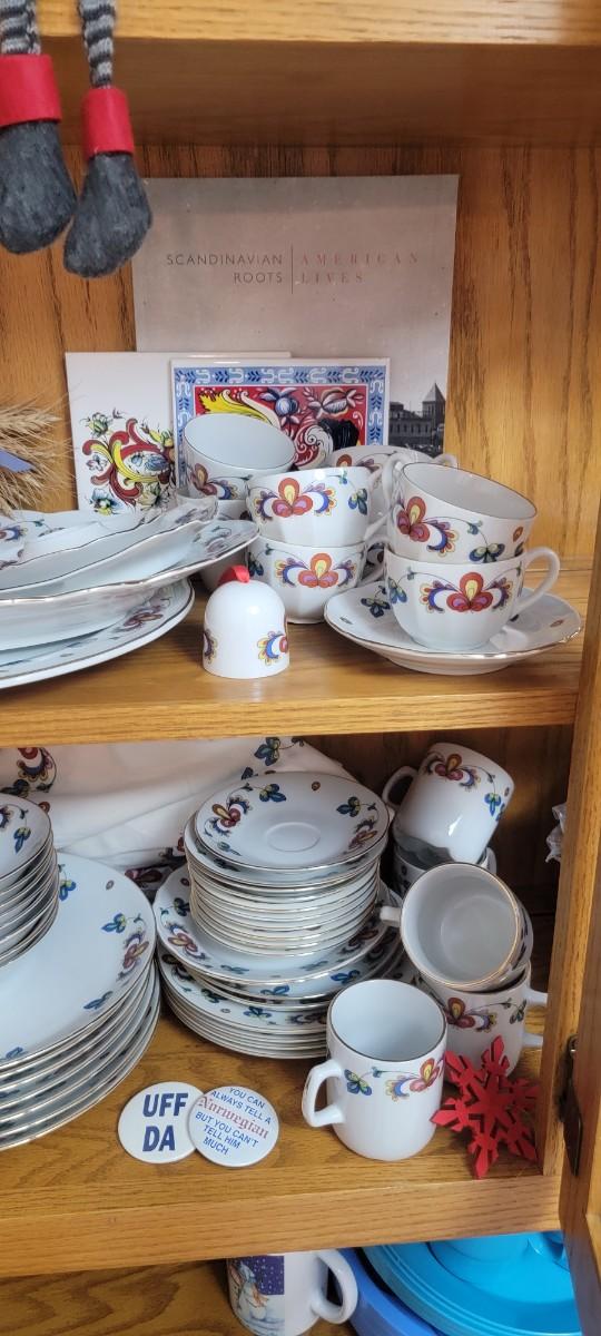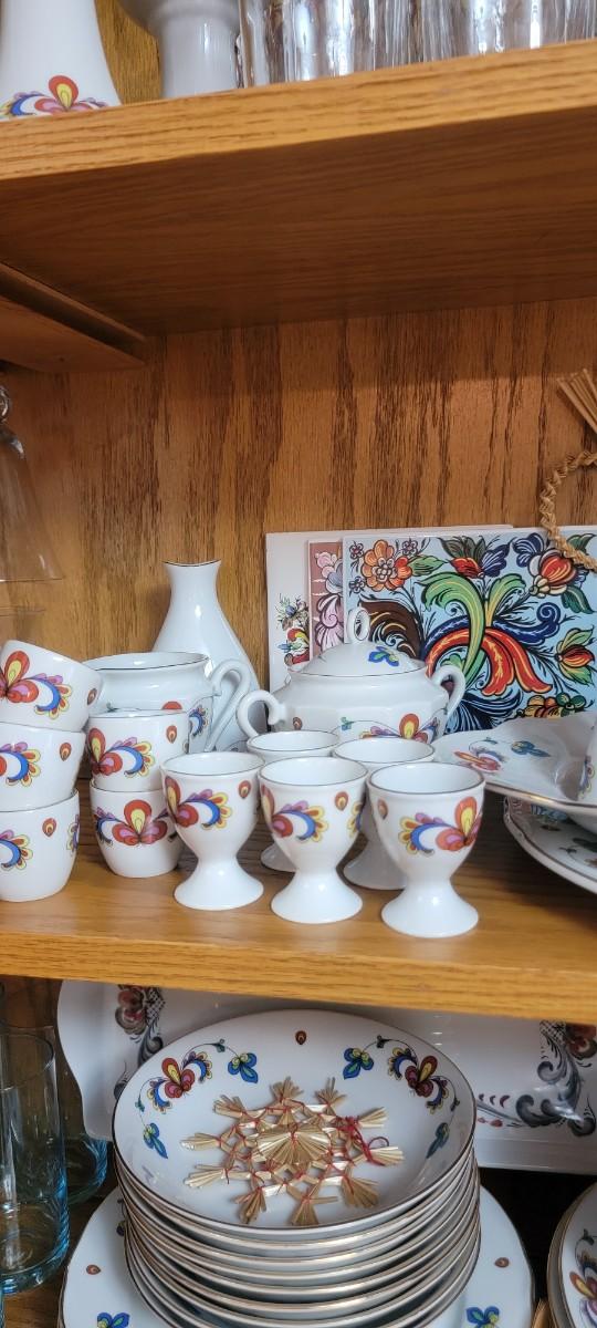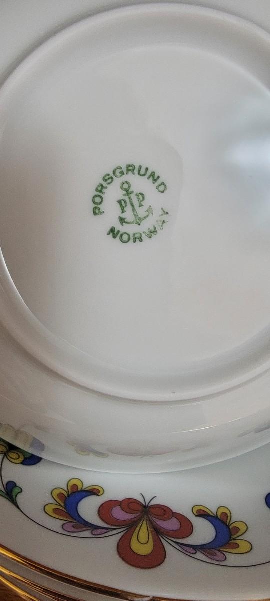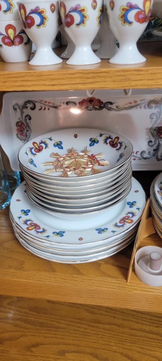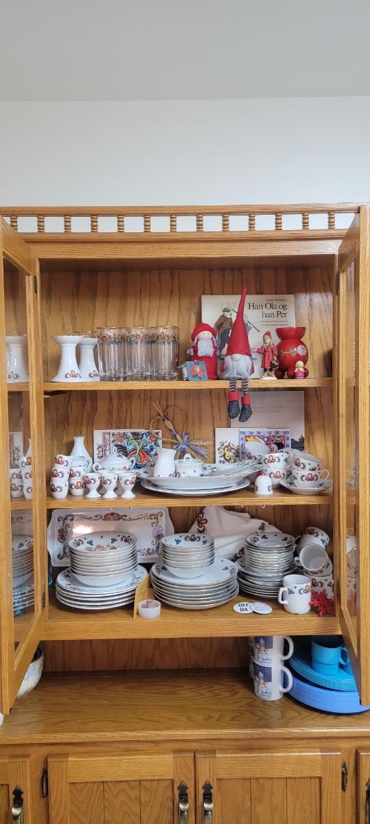 Porsgrund china Norway, plates, serving pieces, bowls, coordinating beverage glasses. Plus Han Ola Og han Per book and other collectibles.