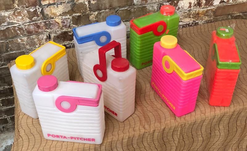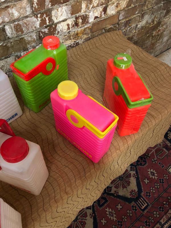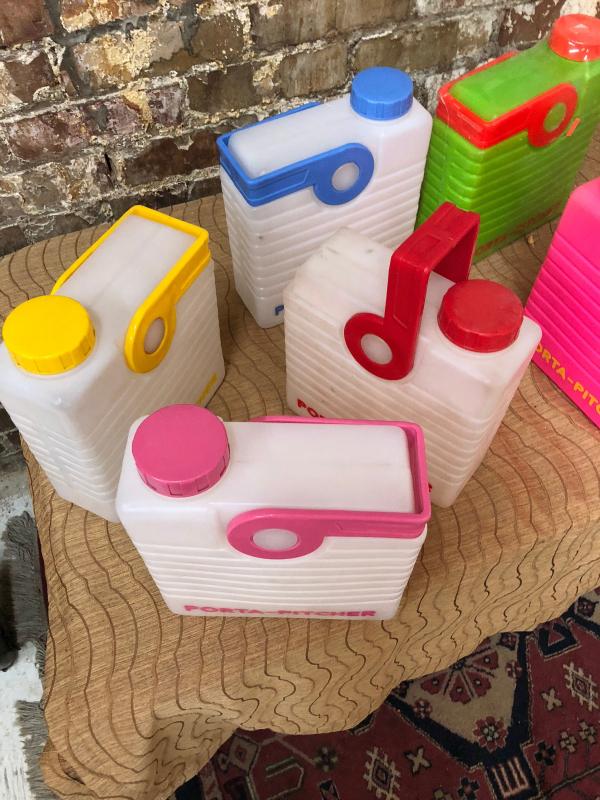 Flat plastic jugs hold a gallon, some brand new, 7 total.
