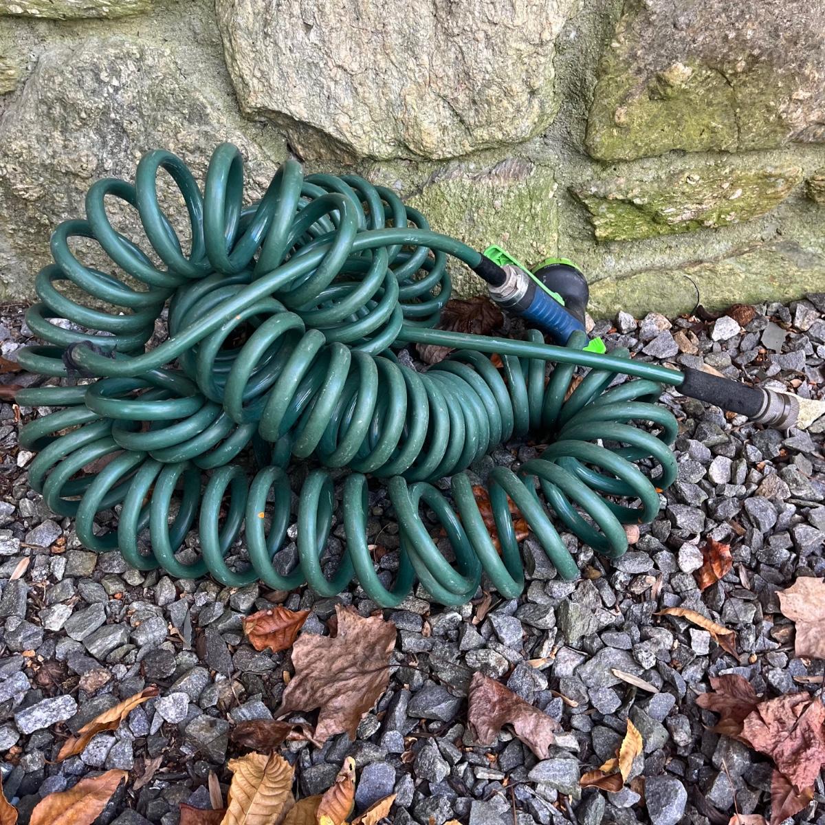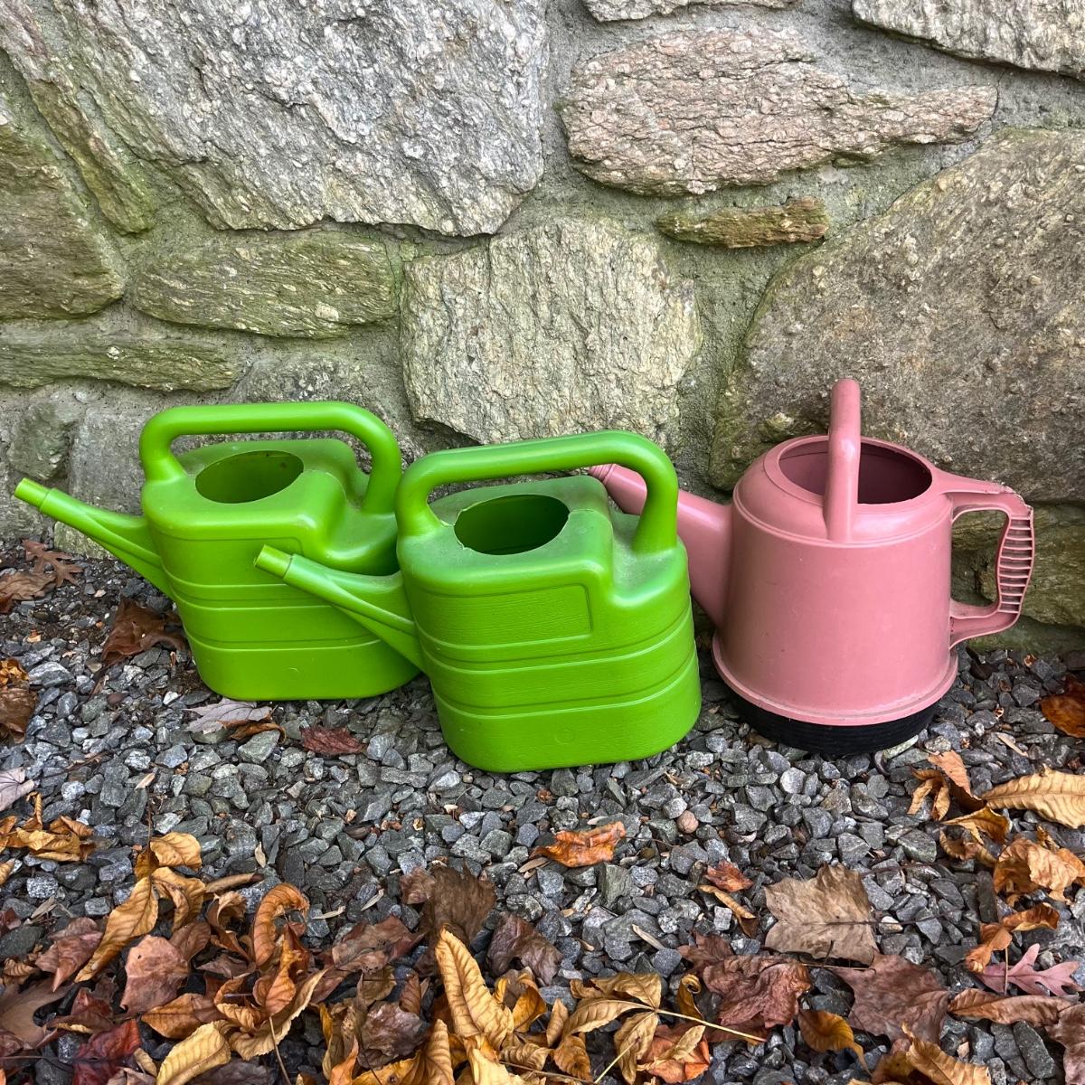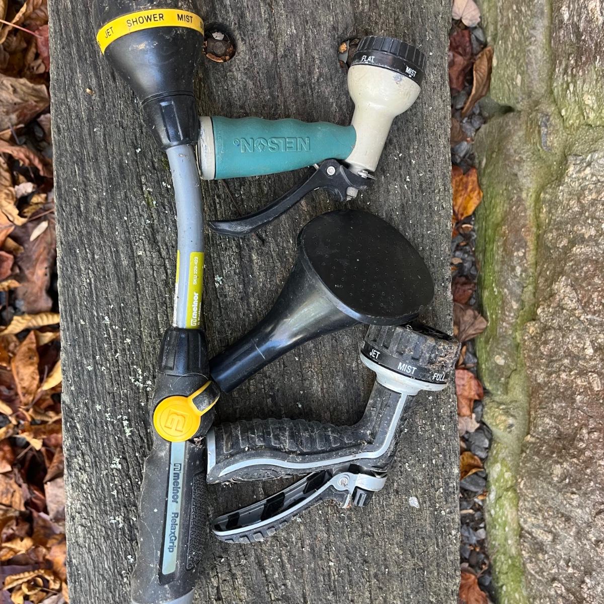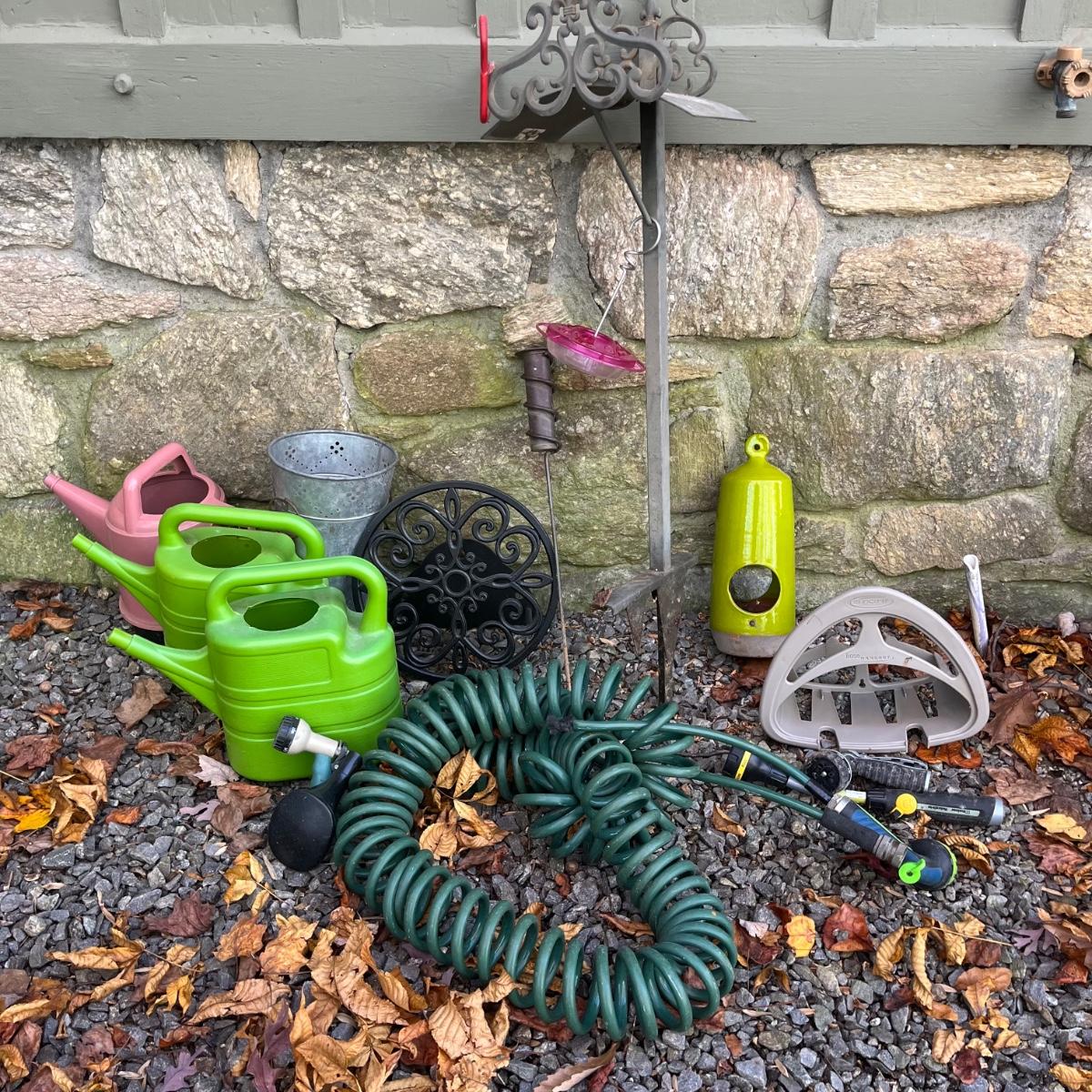 Lot includes a pottery hanging bird feeder, metal in ground hose hanger, metal wall hose hanger, plastic wall hose hanger, copper rain gauge, three plastic water cans, hose, hose nozzles and more. In ground hose hanger measures 8.5” x 13” x 42”.