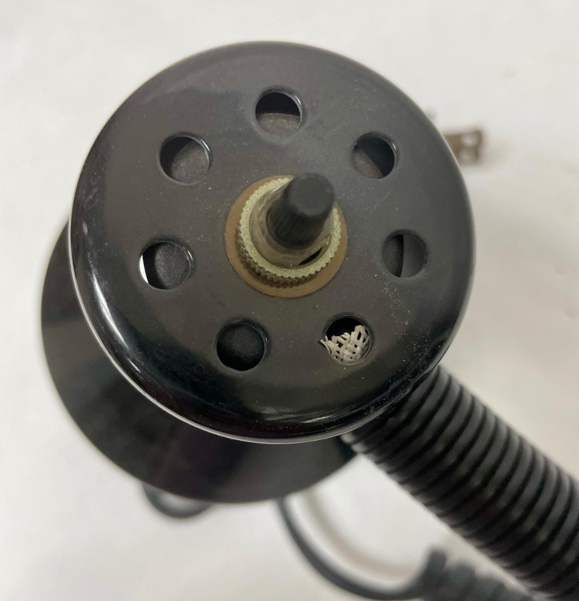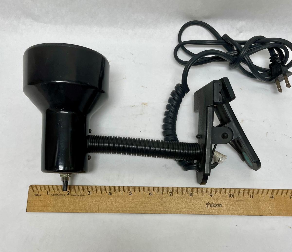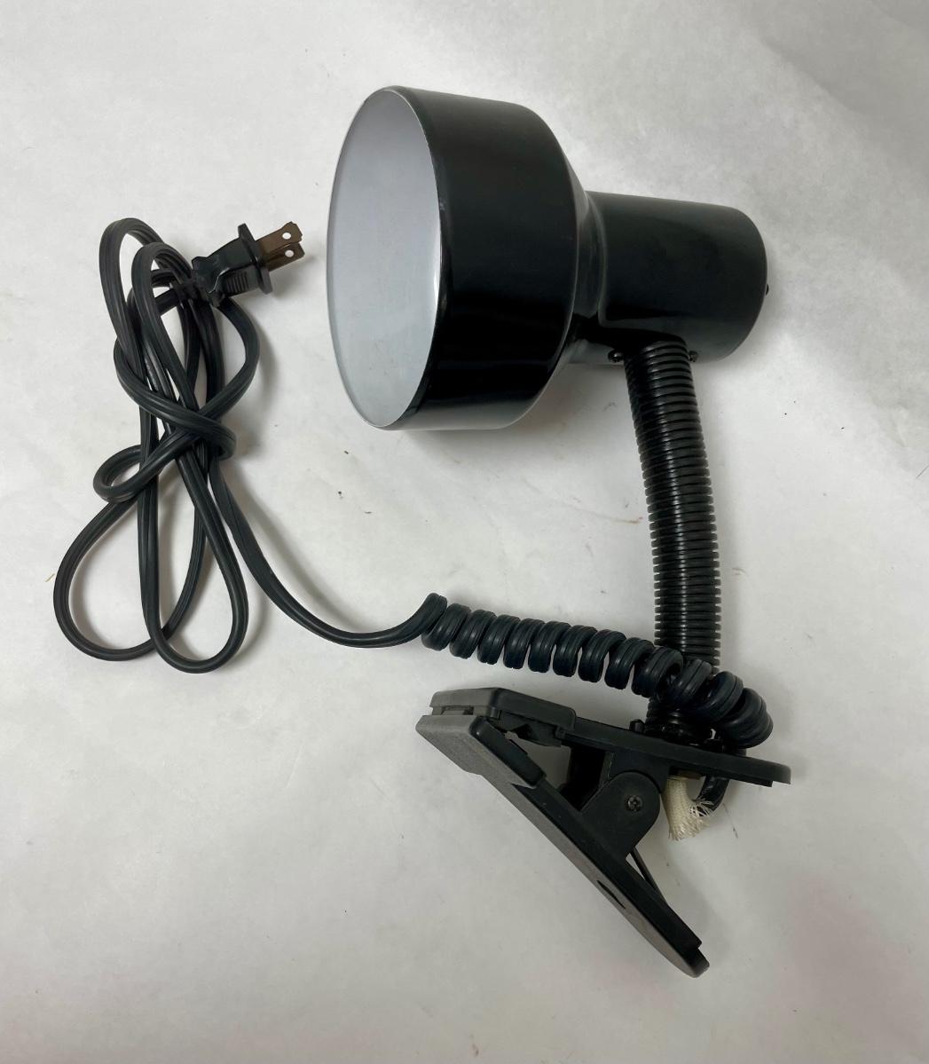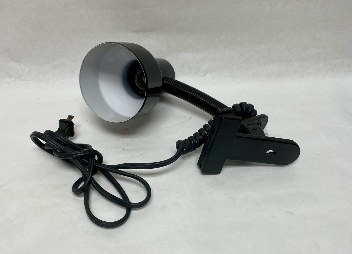 Uses a single bulb. Approx. 10" tall, flexible neck allows it to be position any way needed. Tested, works as expected.