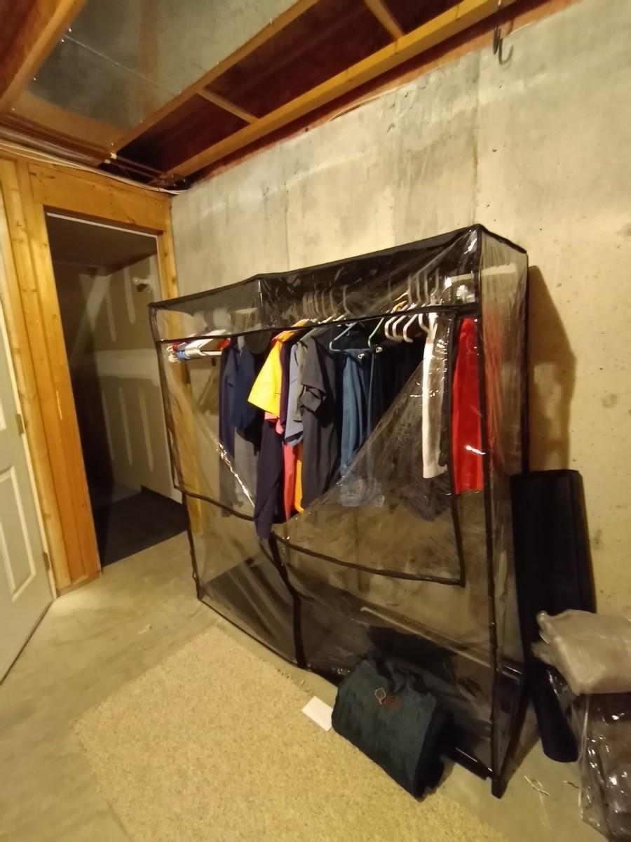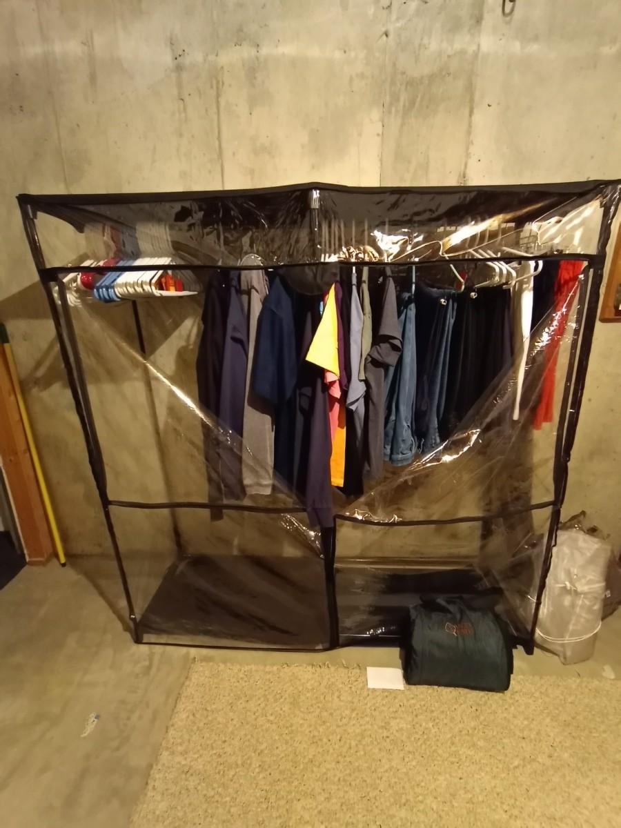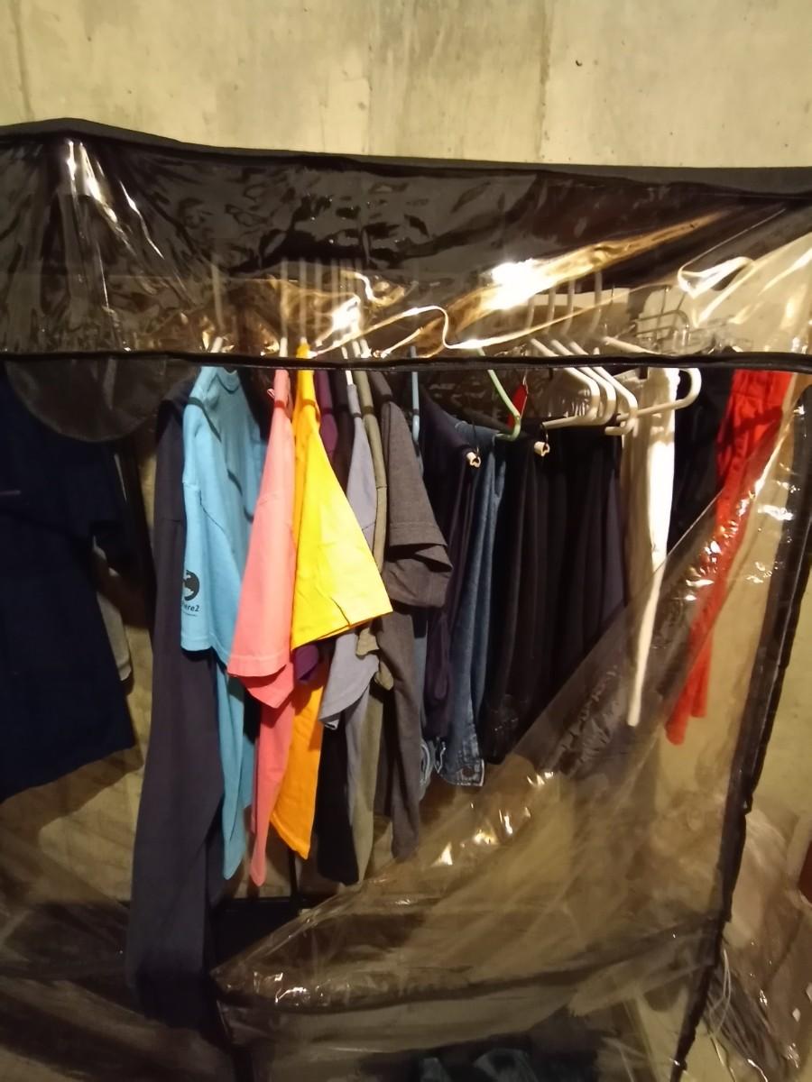 PORTABLE CLOTHES CLOSET 19X60X64 -CAR BLANKET AND VARIETY OF CLOTHING L/XL