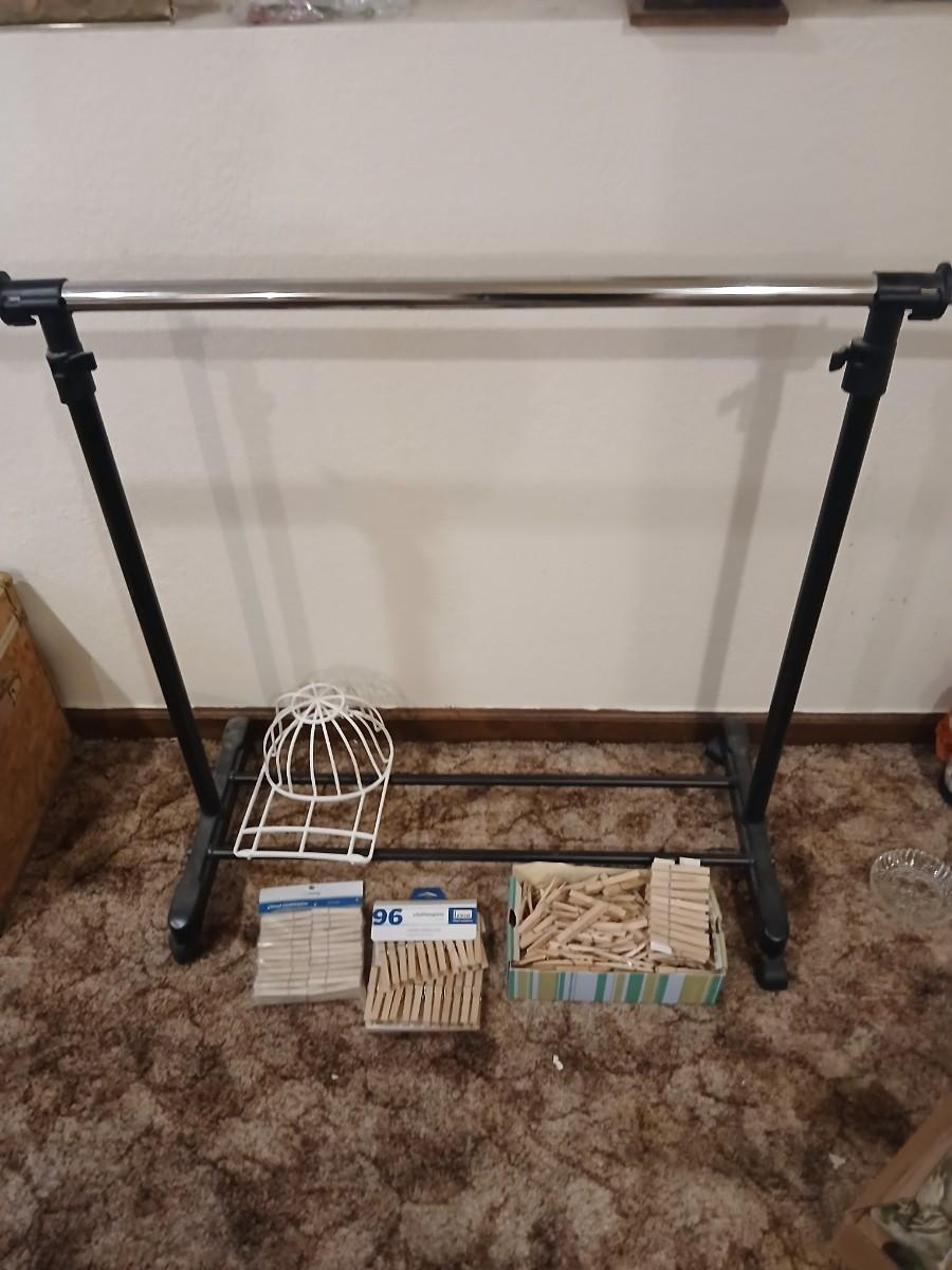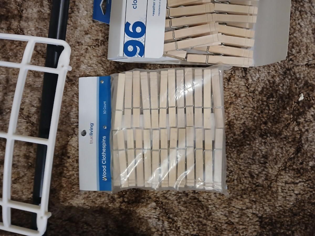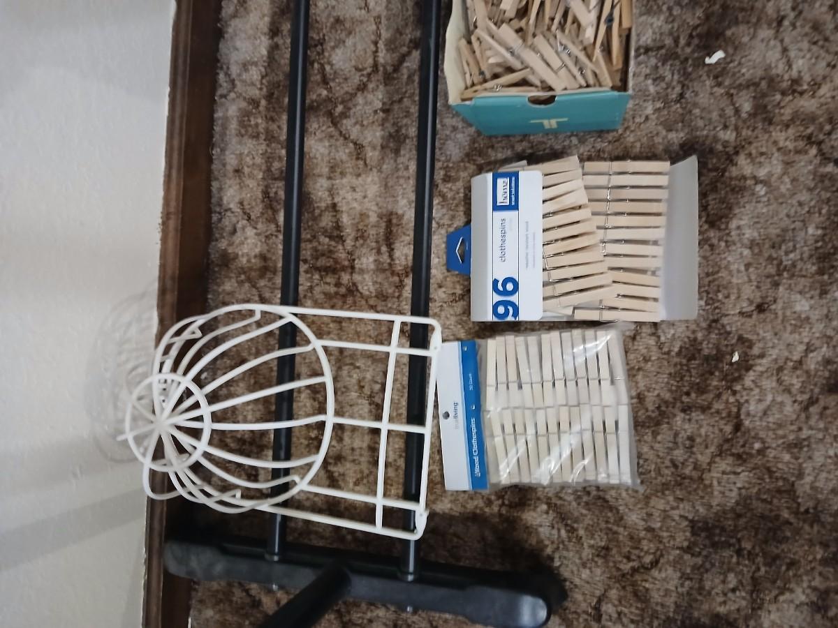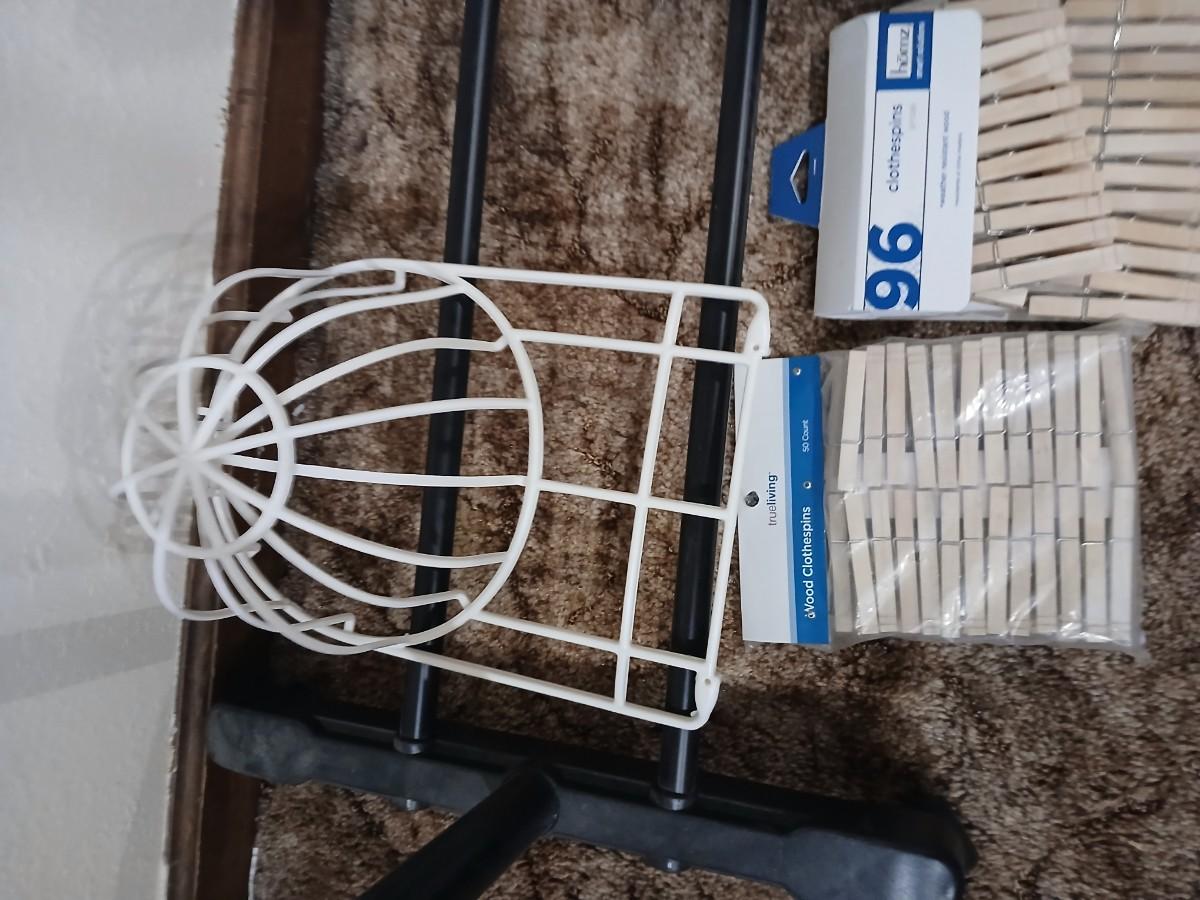 Portable clothes rack with packages of brand-new and opened clothes pins and a baseball cap cleaning tool