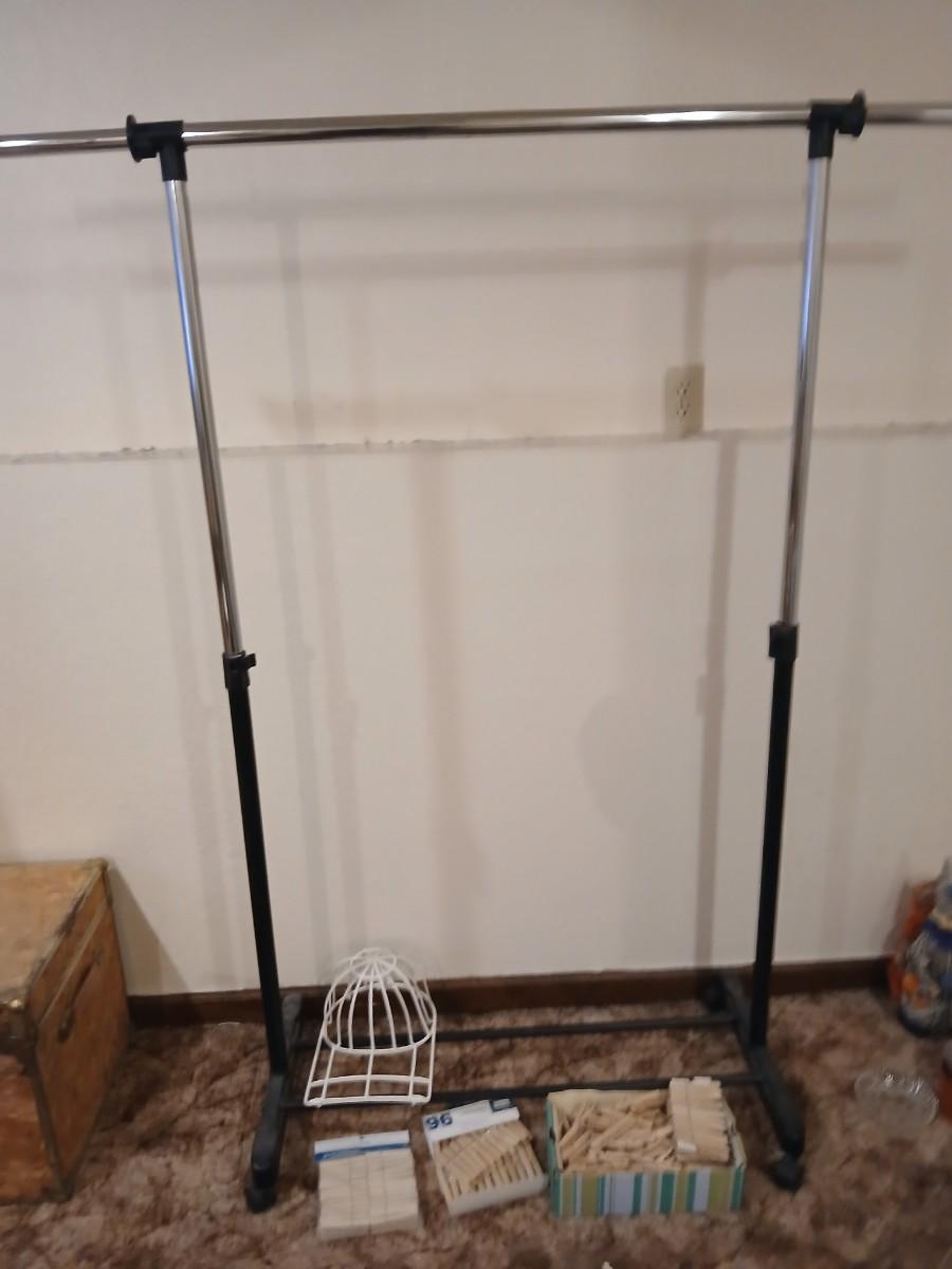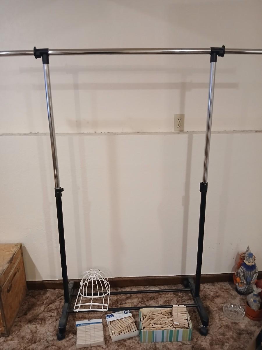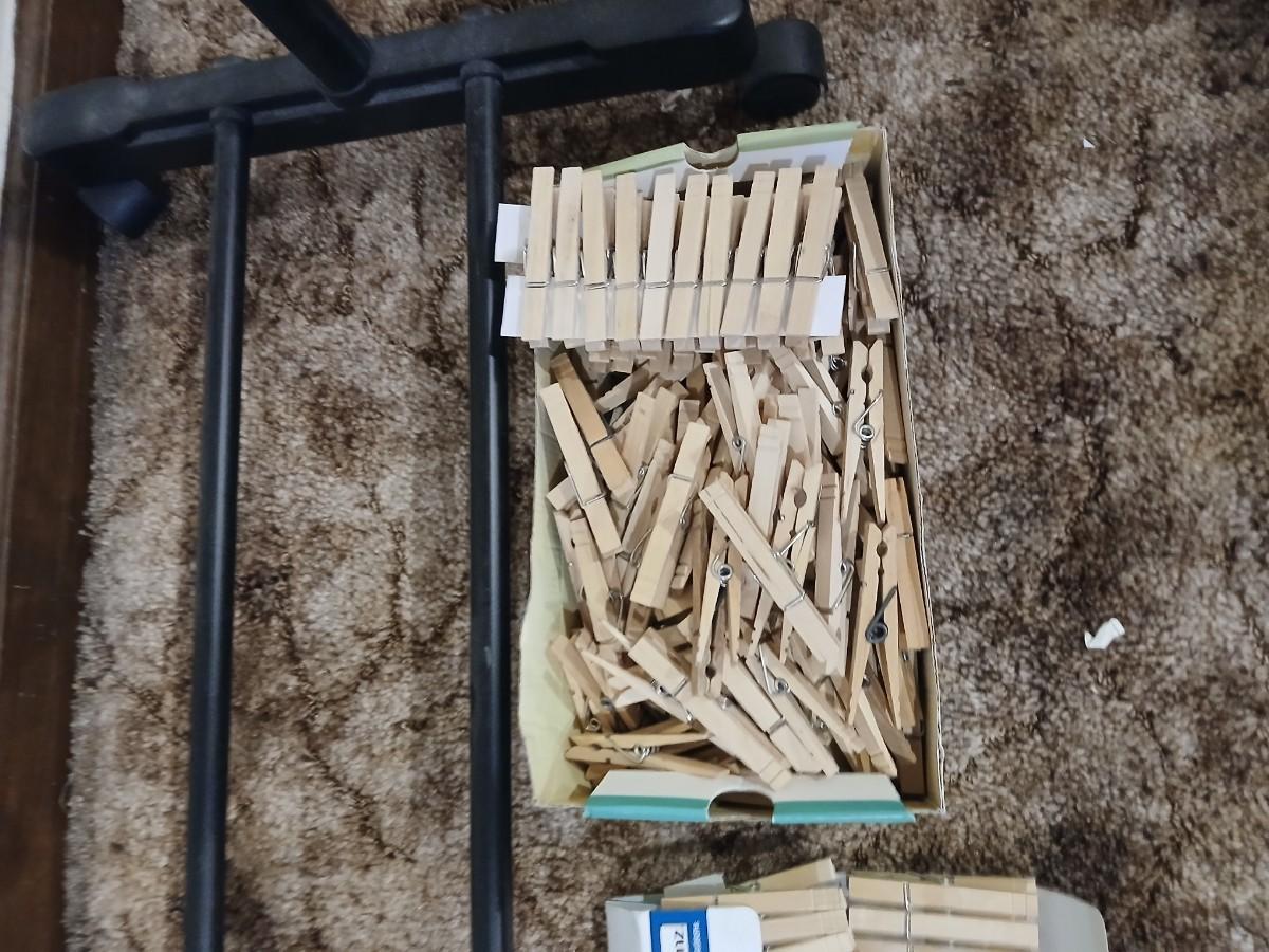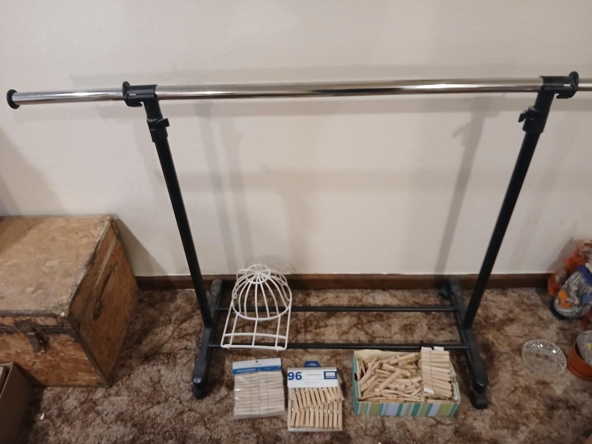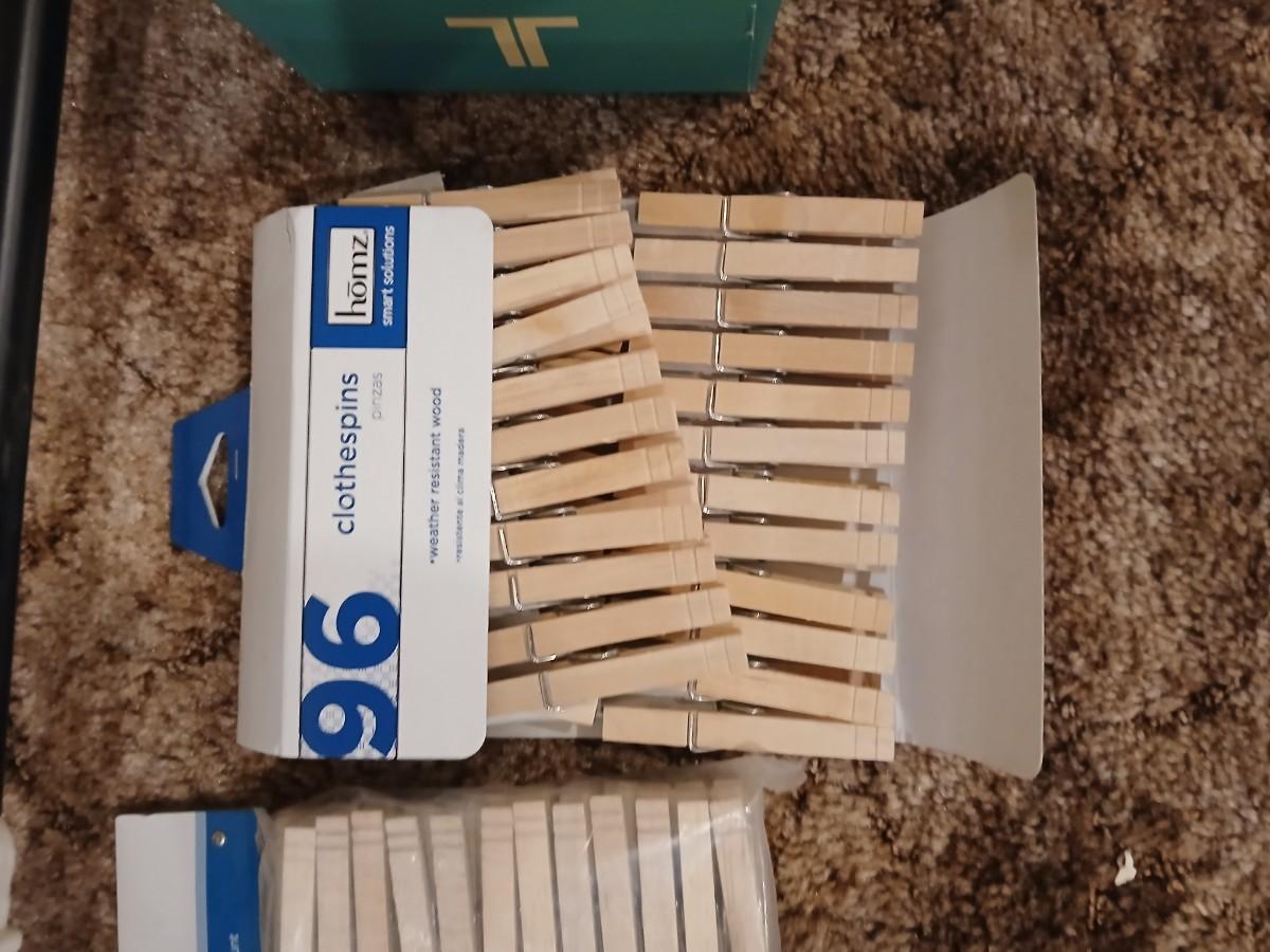 Portable clothes rack with packages of brand-new and opened clothes pins and a baseball cap cleaning tool