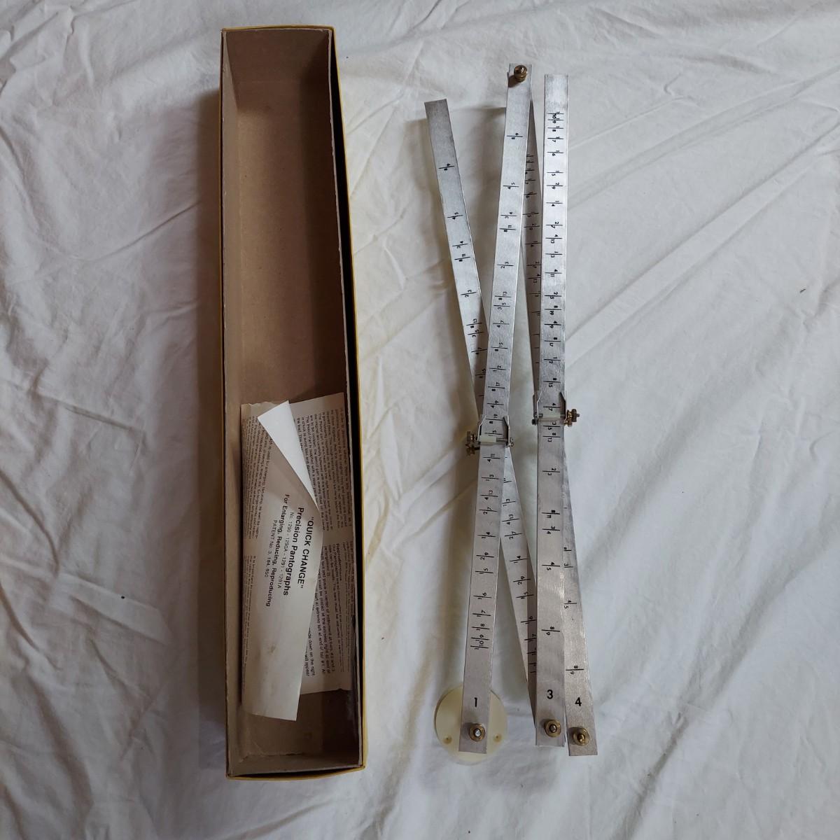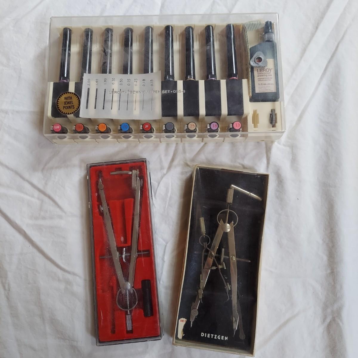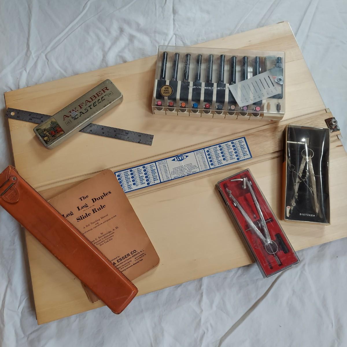 Portable drafting table and art tools. Wooden drafting table made by Alvin measures 24.5" x 18" x 2"H. Lot also includes Leroy pen set, precision pantagraph, slide rule and manual, calligraphy books and more. Shipping available. Shipping certain items can be costly. We suggest contacting our preferred local shipping provider, Postage Express, with dimensions and getting an estimate before bidding: (828) 670-5501 or postageexpress@yahoo.com.