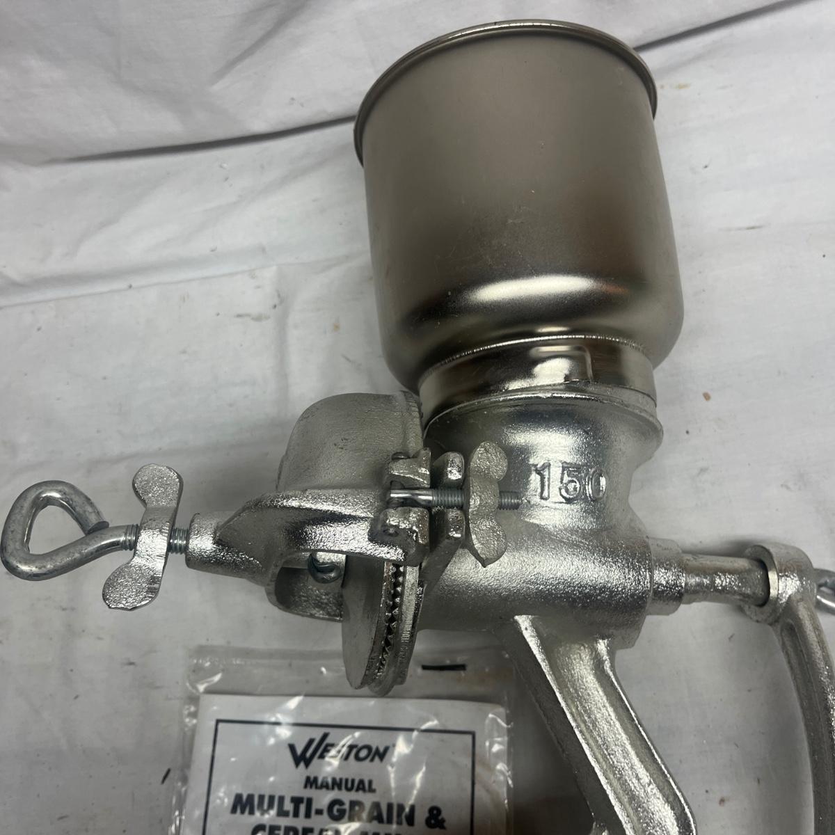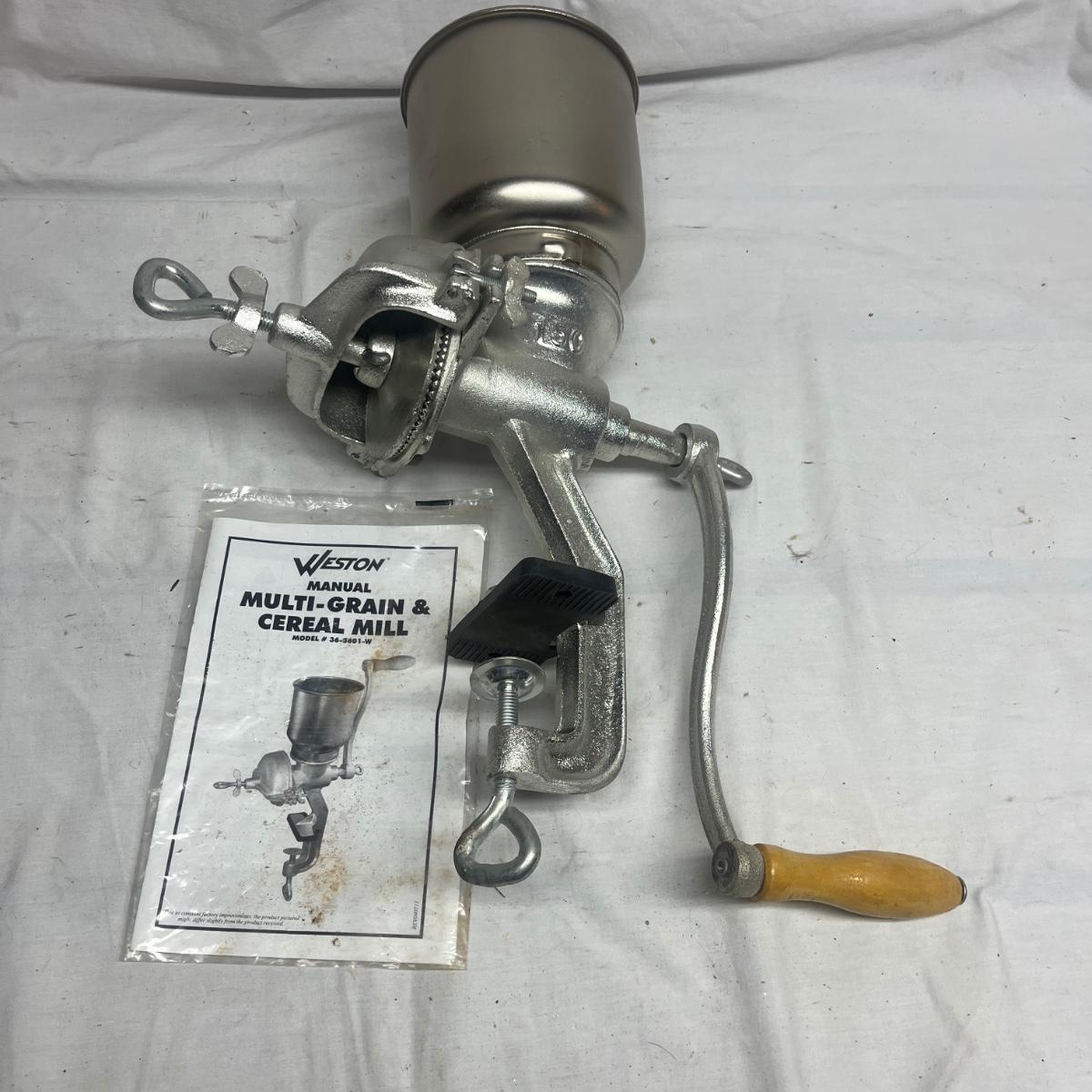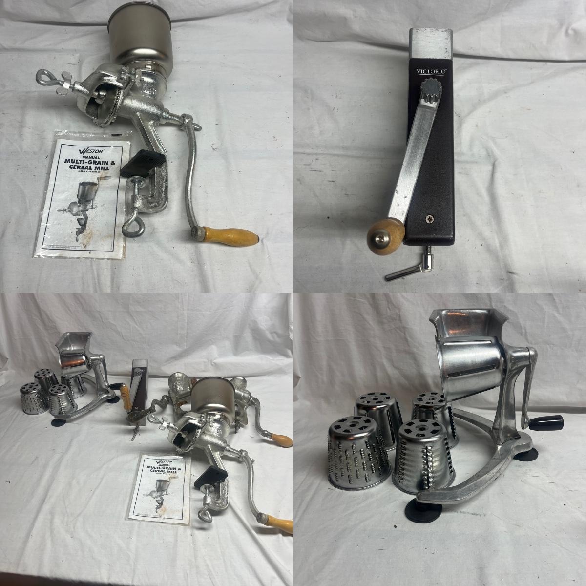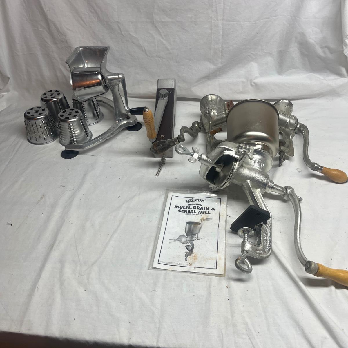 Lot includes a Weston multi-grain & cereal mill, Kitchen Quip food processor, Victorio grain mill and two meat grinders. Weston mill measures 13” x 17” x 17”H.