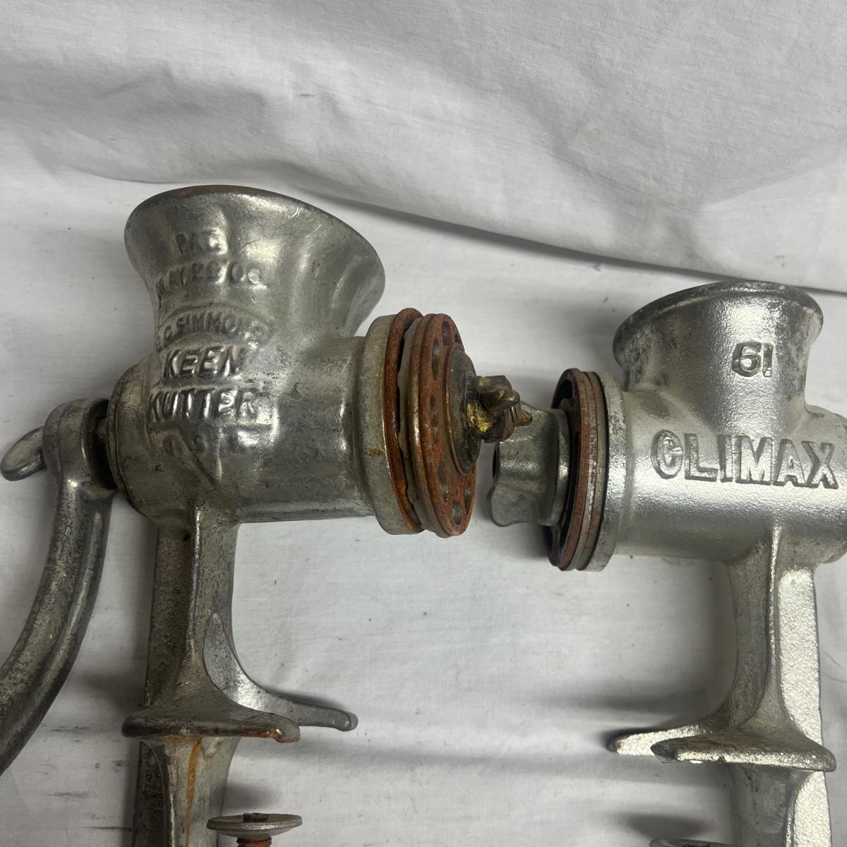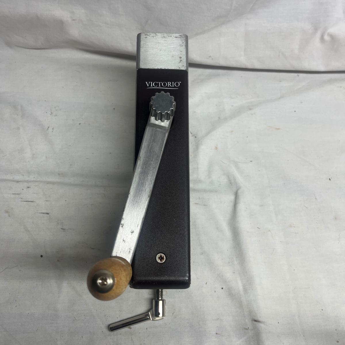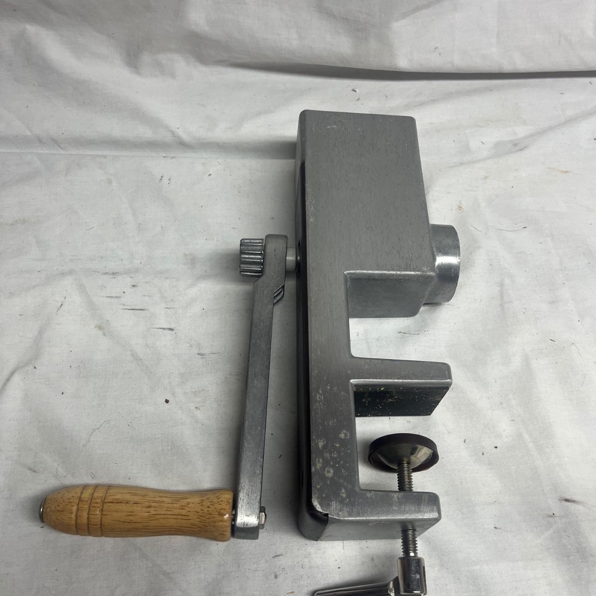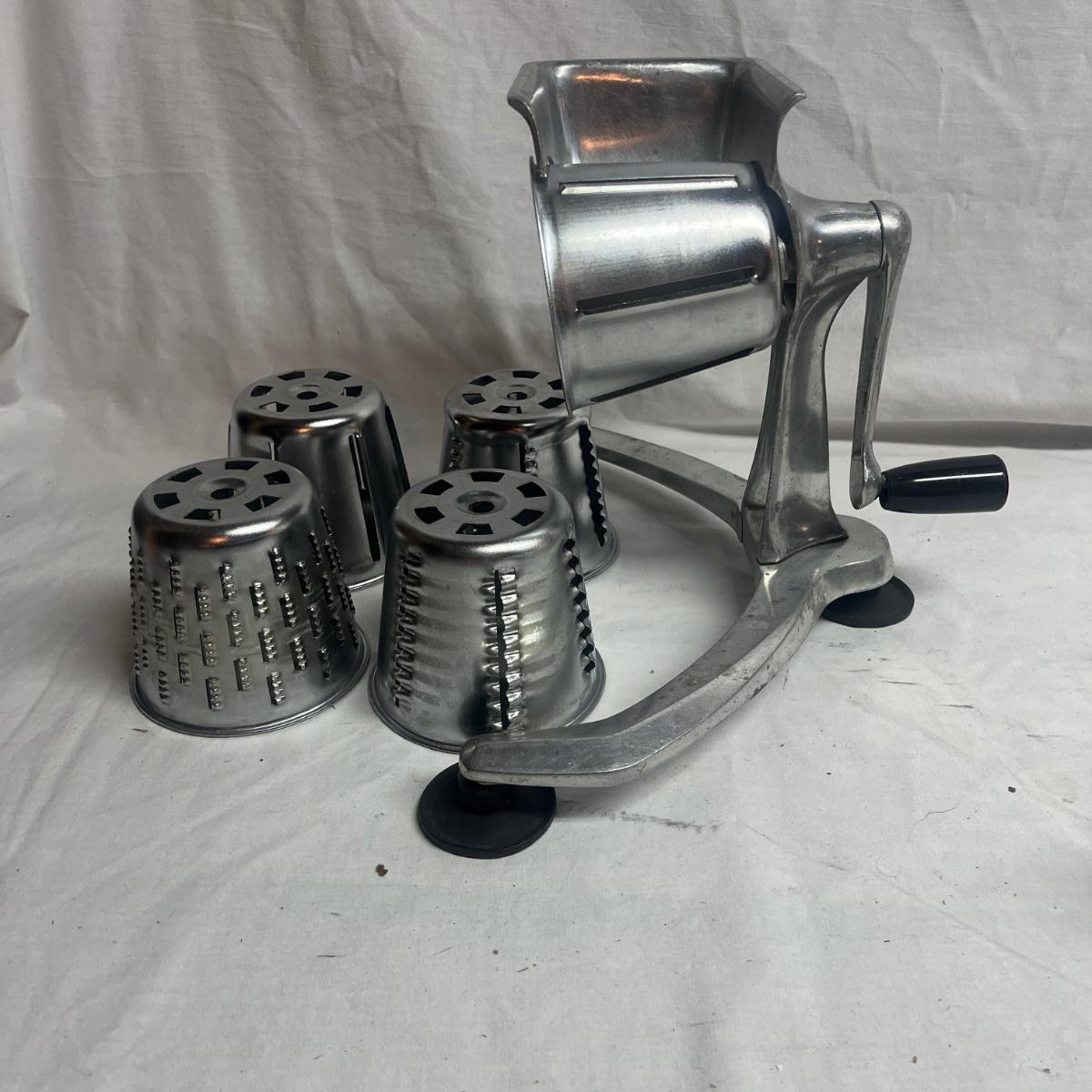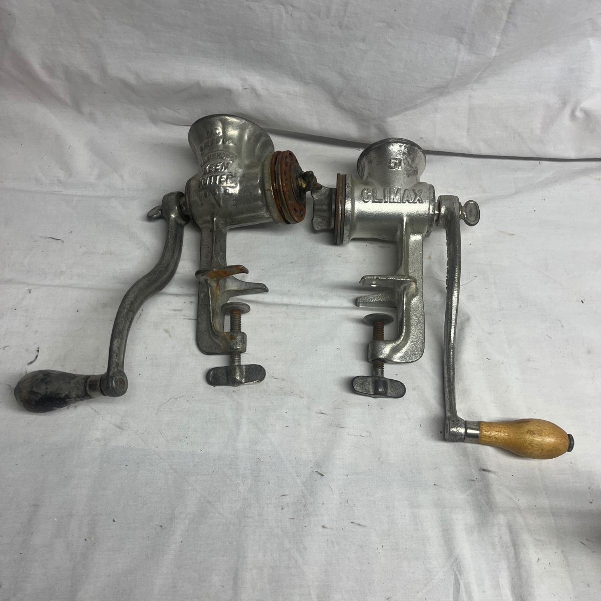 Lot includes a Weston multi-grain & cereal mill, Kitchen Quip food processor, Victorio grain mill and two meat grinders. Weston mill measures 13” x 17” x 17”H.