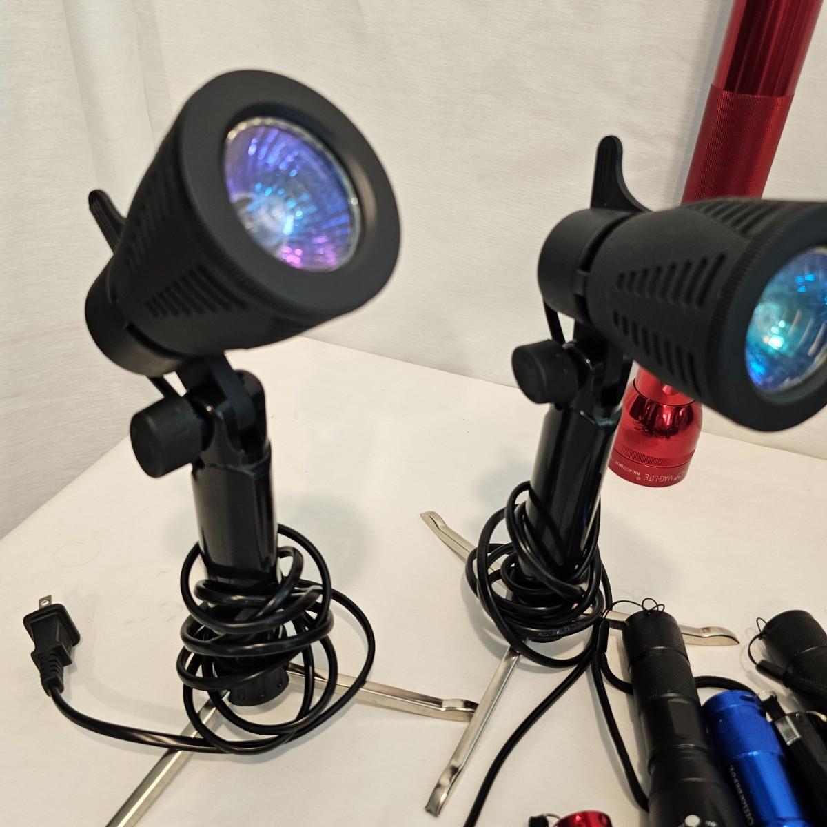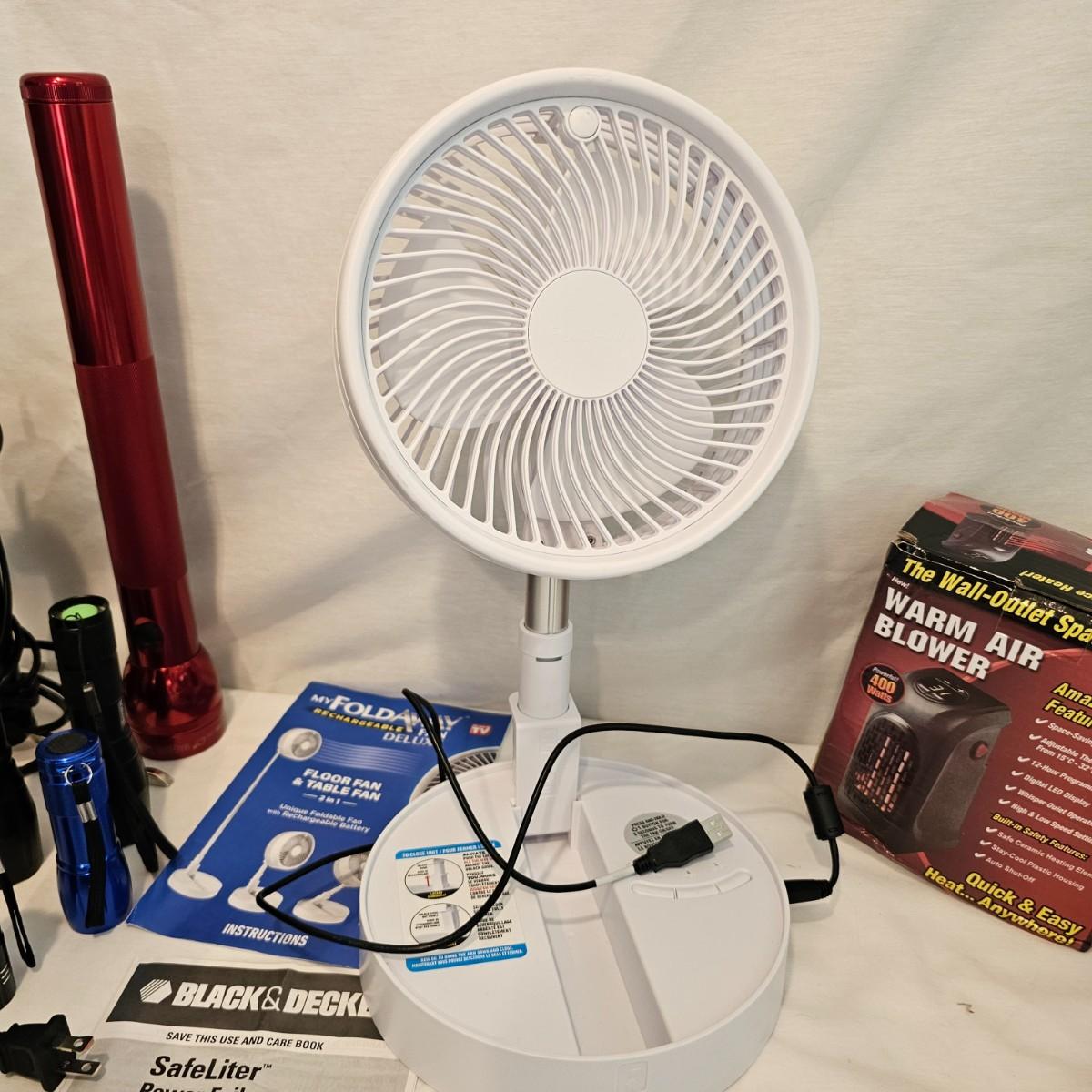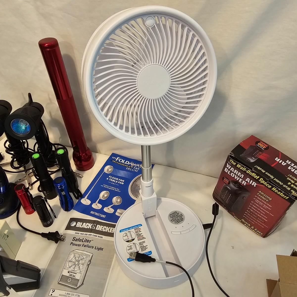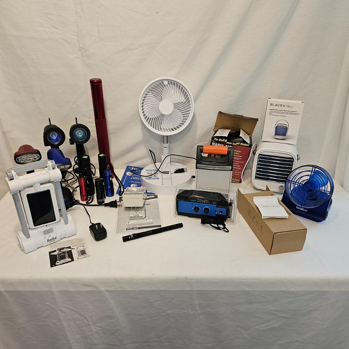 A collection of hand held and tabletop items including flashlights, fans, table lamps and more. All AC items powered on when plugged in. Mini flashlights, a four cell Maglite, other safety items. Note that some items are USB plugs and will need adapters, not included. See photos for details. Shipping available.