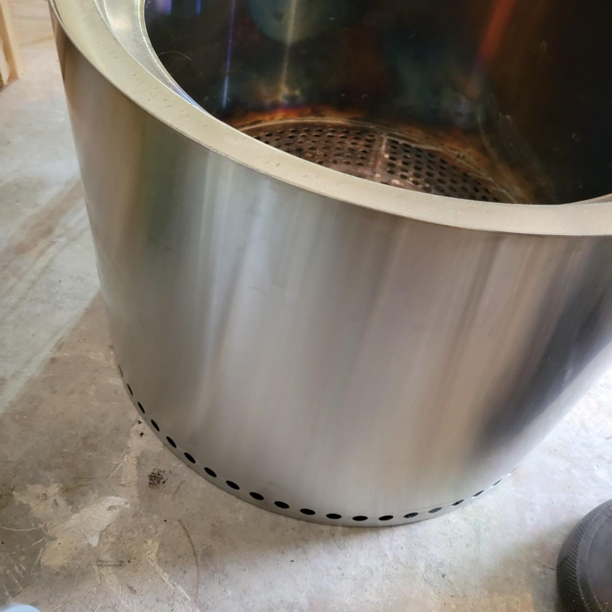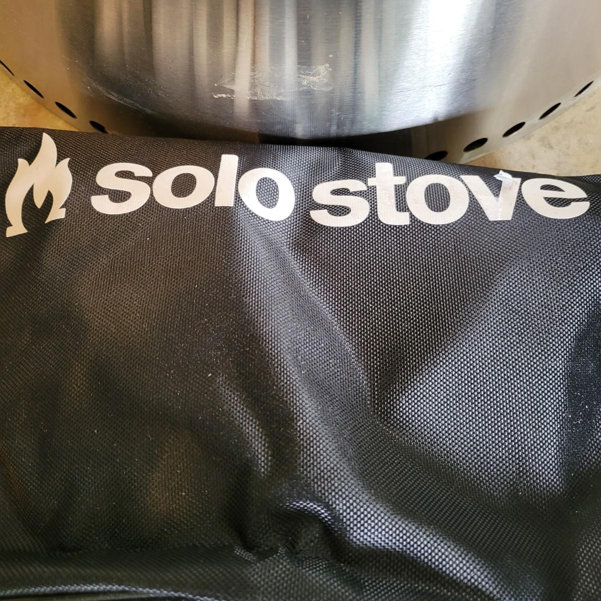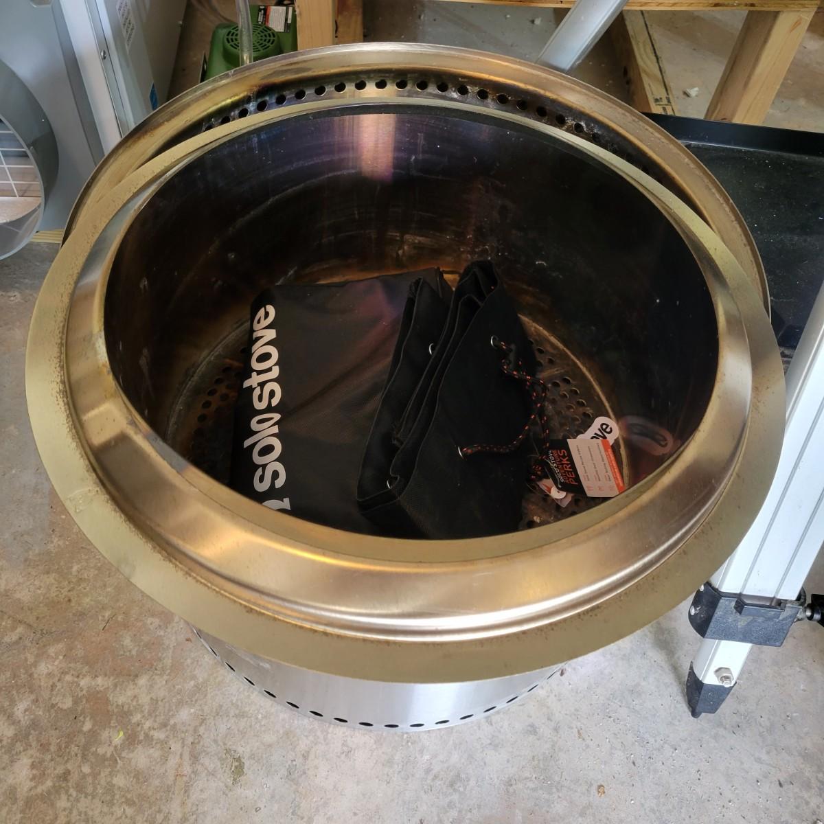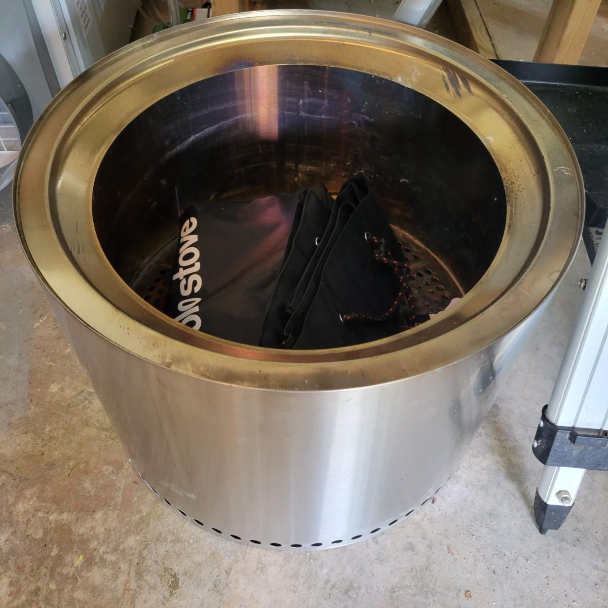 A portable fire pit made of steel manufactured by Solo Stove. This piece appears to have seen minimal use and measures approximately 19.5"D x 14"H. This stove also comes with a bag and therebis no base.. Local pickup only