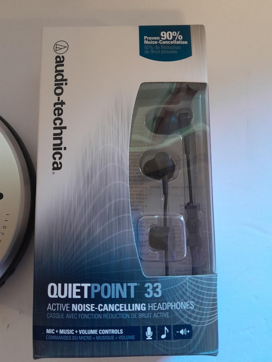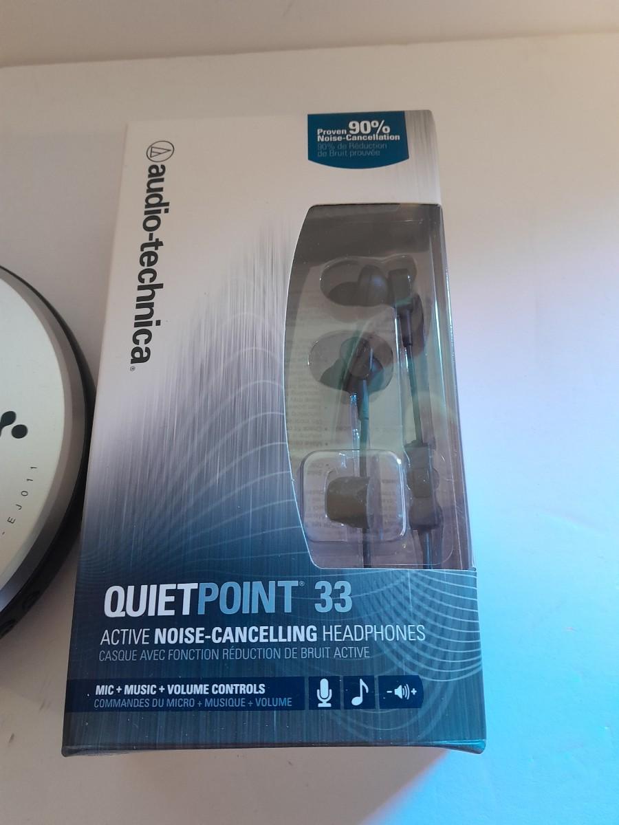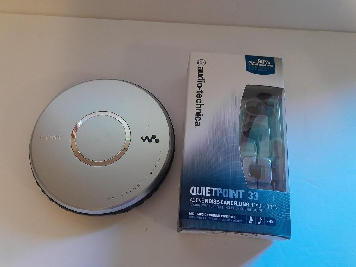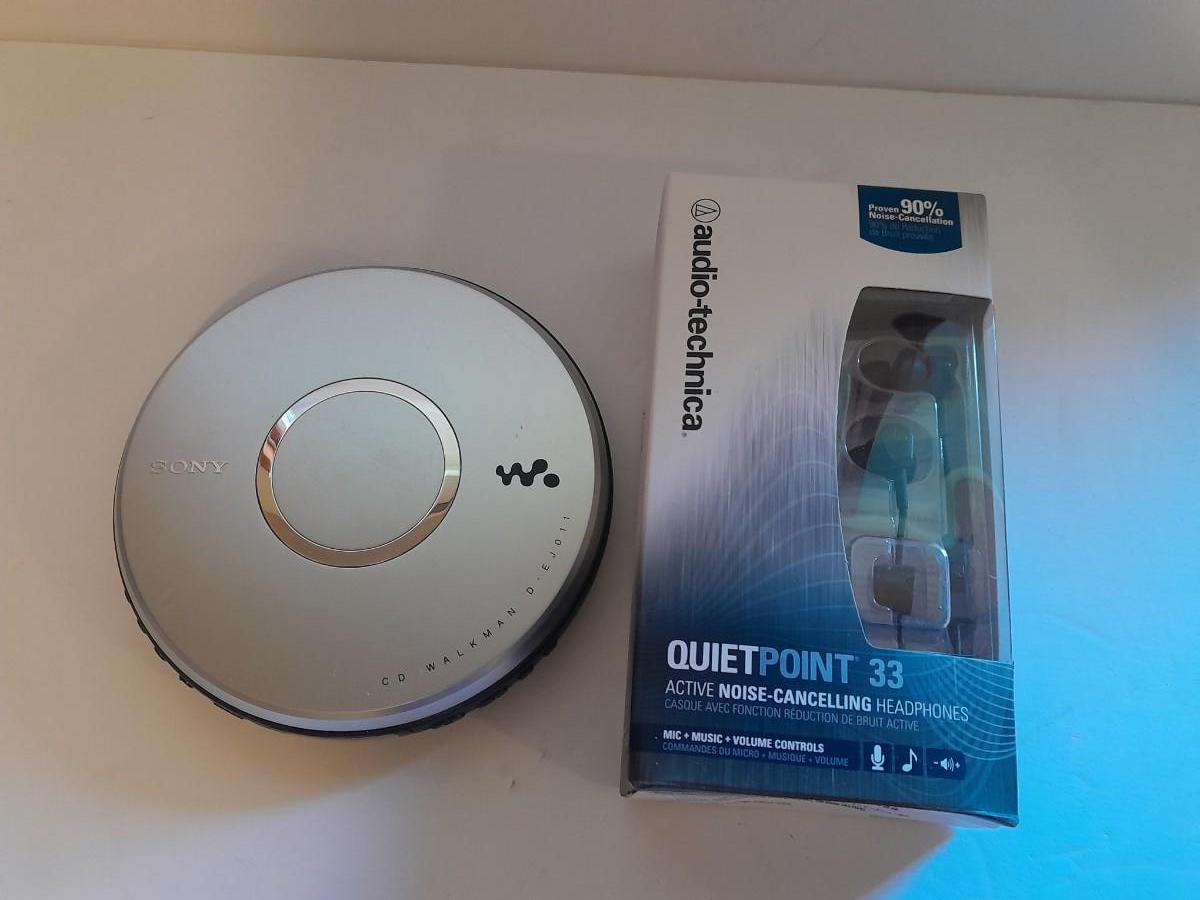 Portable Sony compact disc player (no power cable) with new Audio-technica Quiet point Active noise cancelling headphones
