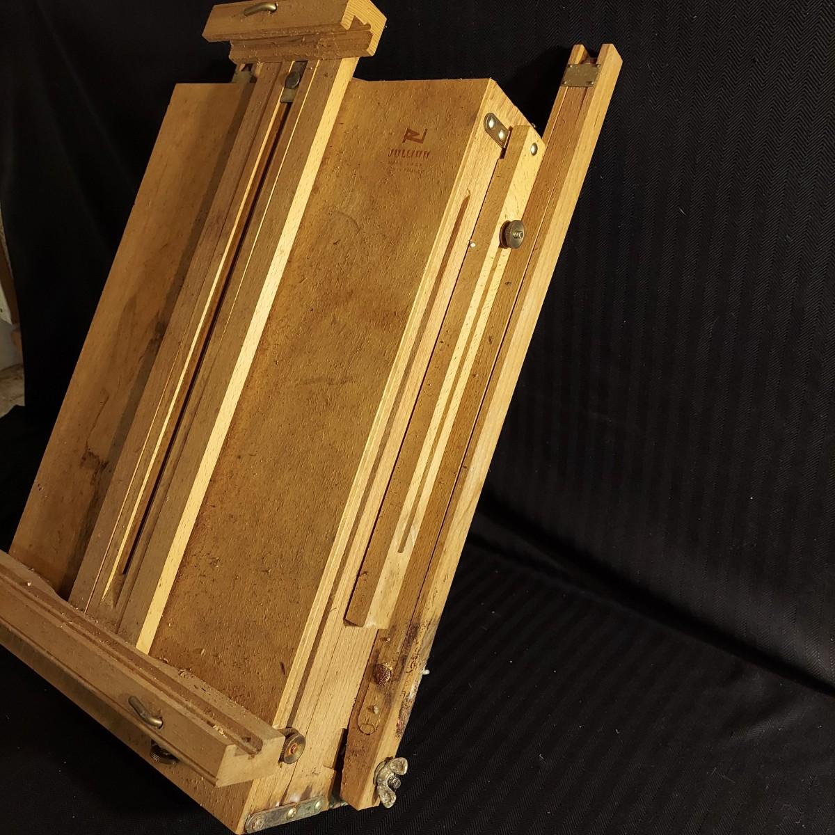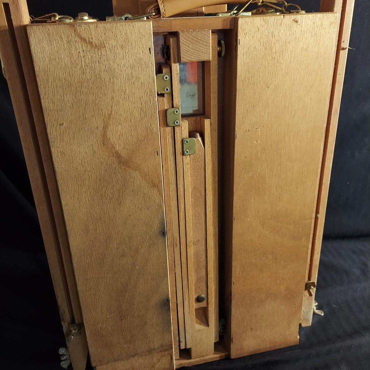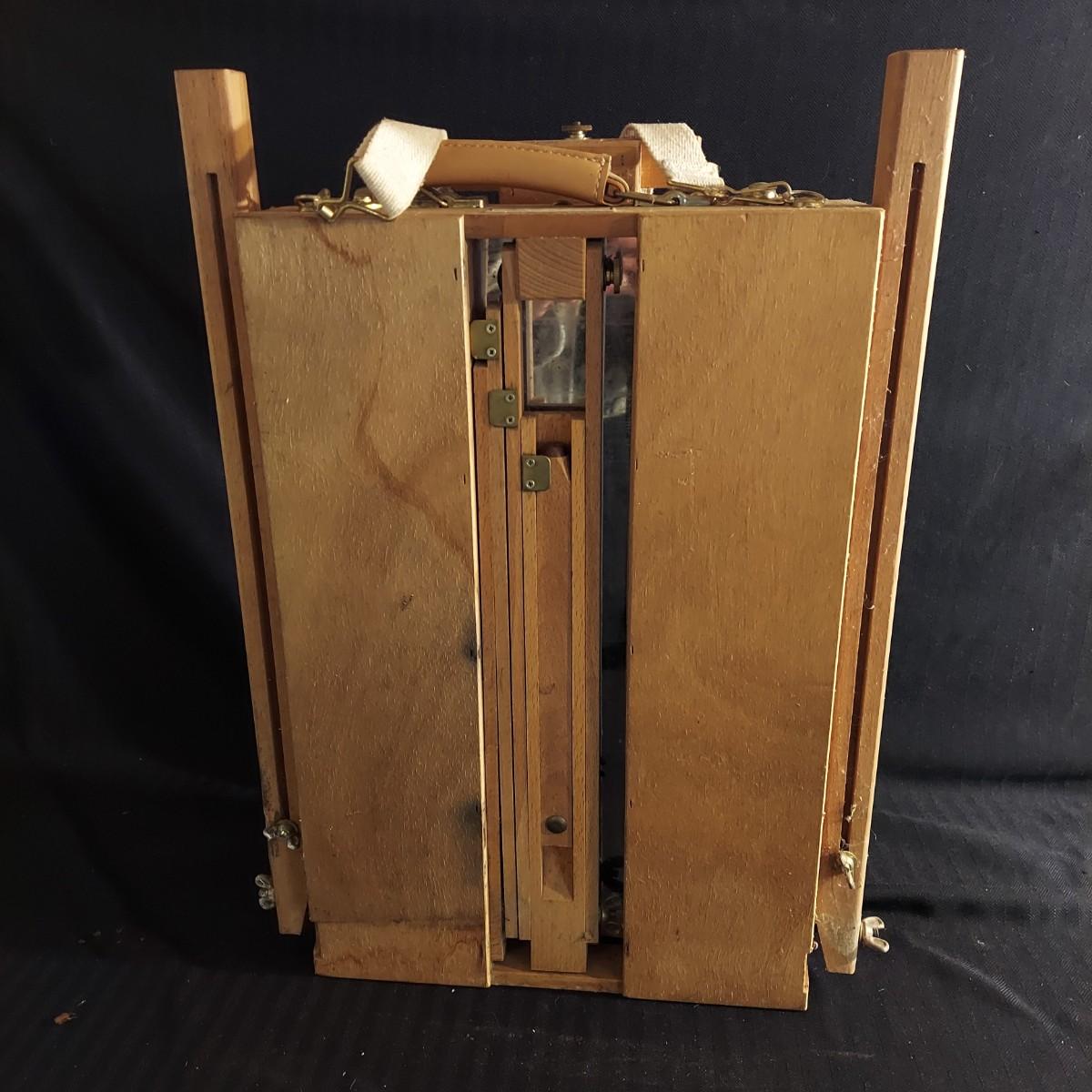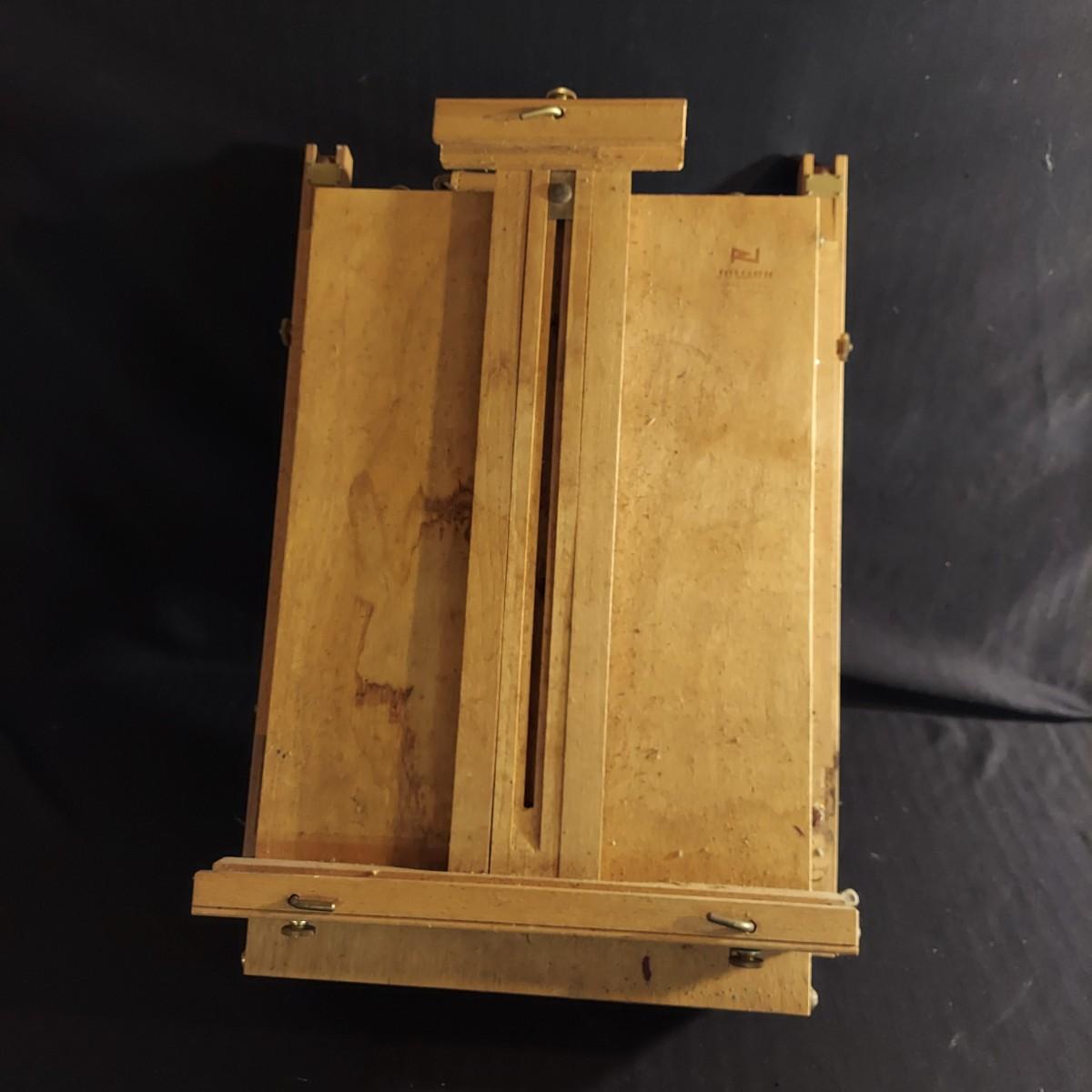 Wooden easel that folds into a portable size with internal storage. Measures 16” x 7” x 22"H. Has some water damage to the bottom. Please see photos for details. Shipping available