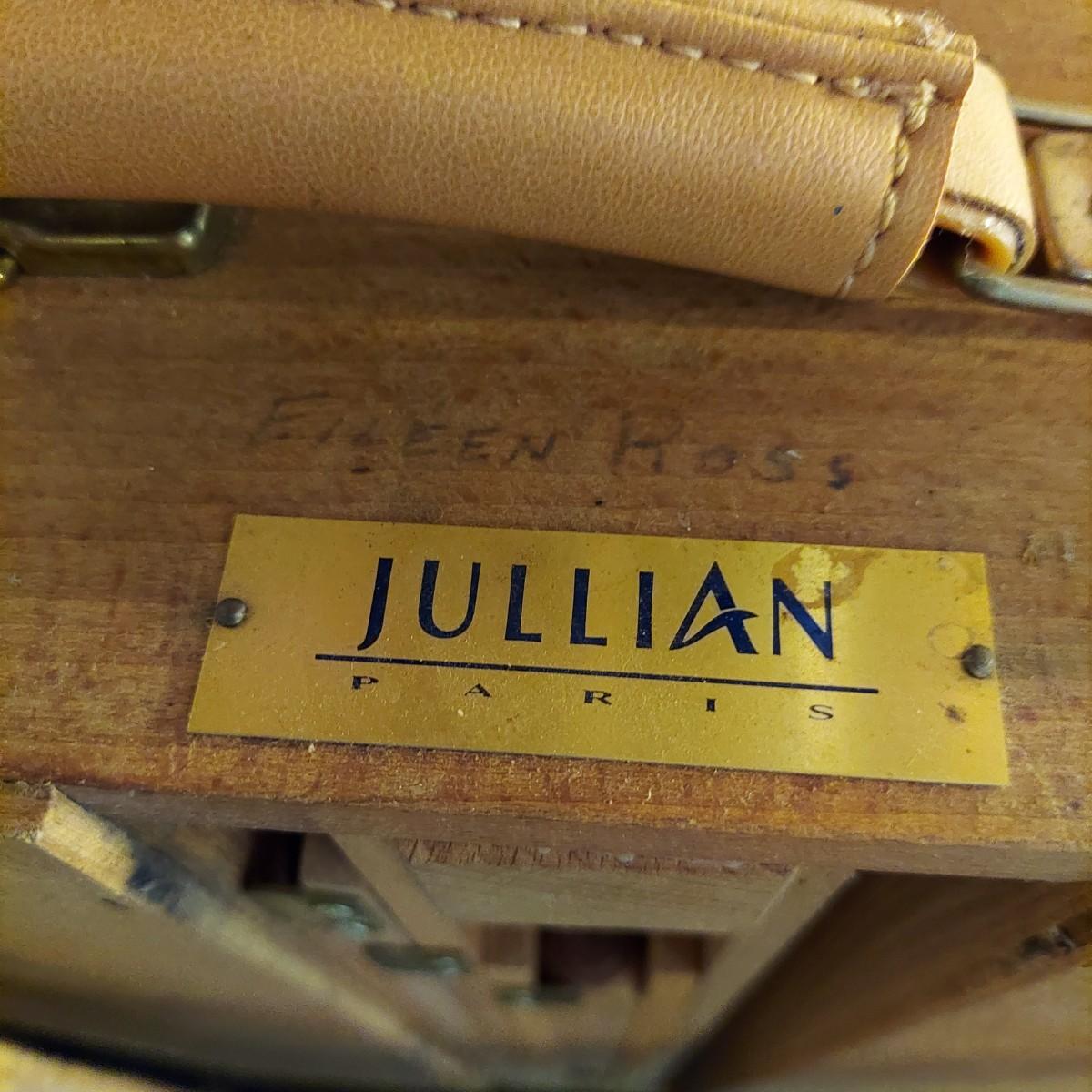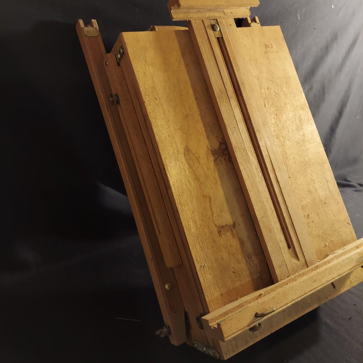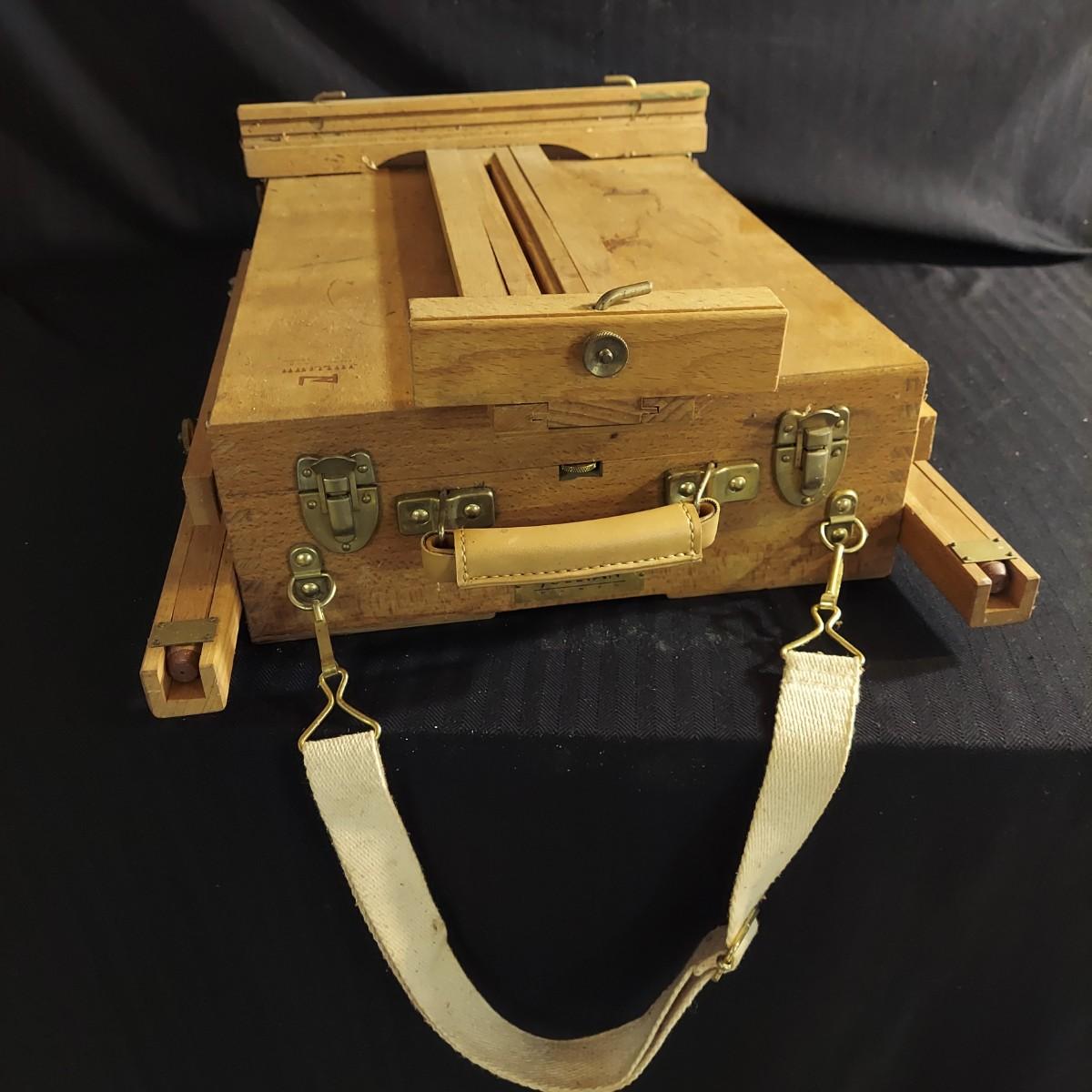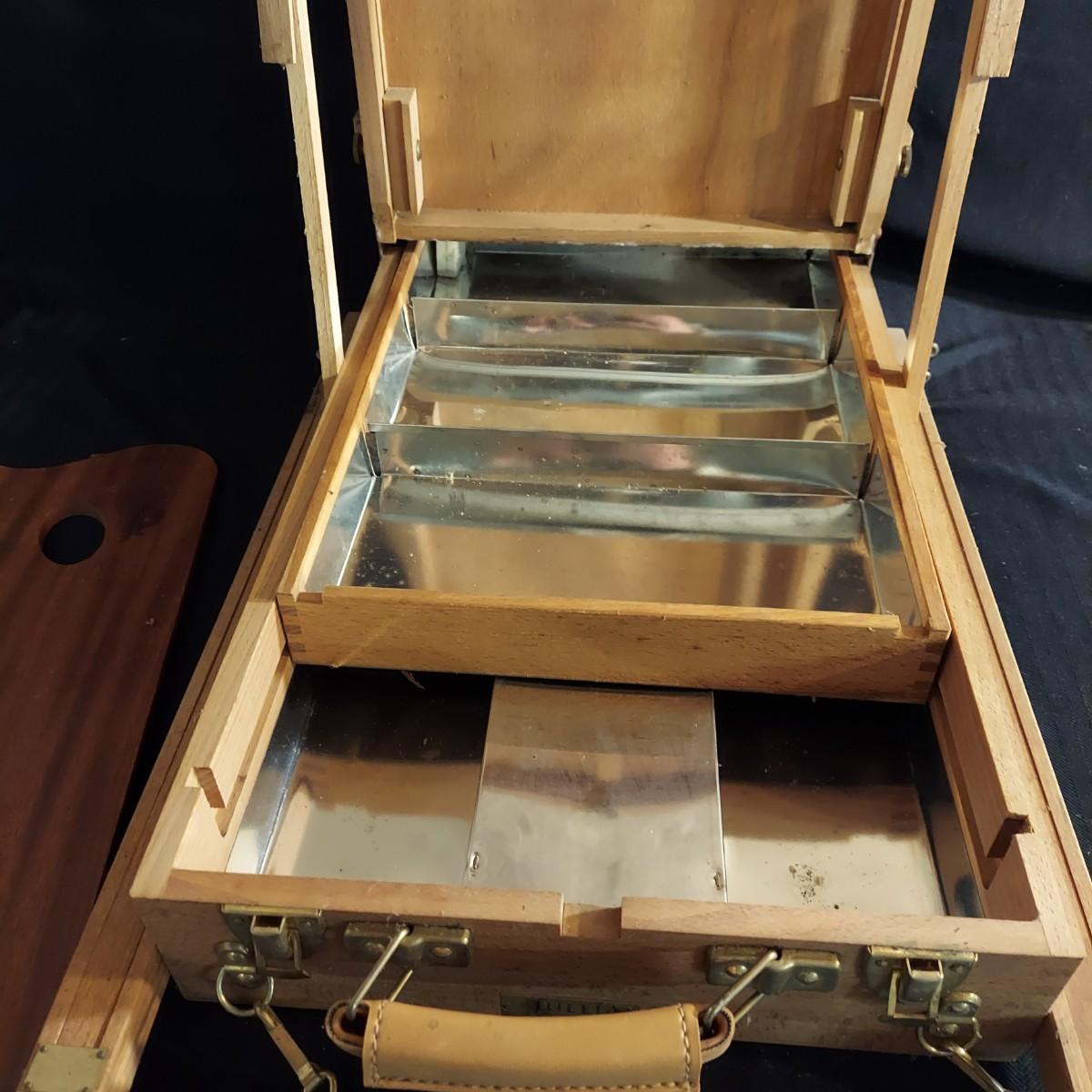 Wooden easel that folds into a portable size with internal storage. Measures 16” x 7” x 22"H. Has some water damage to the bottom. Please see photos for details. Shipping available