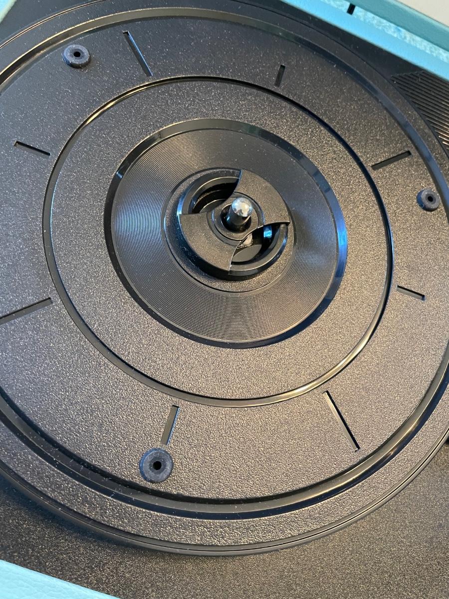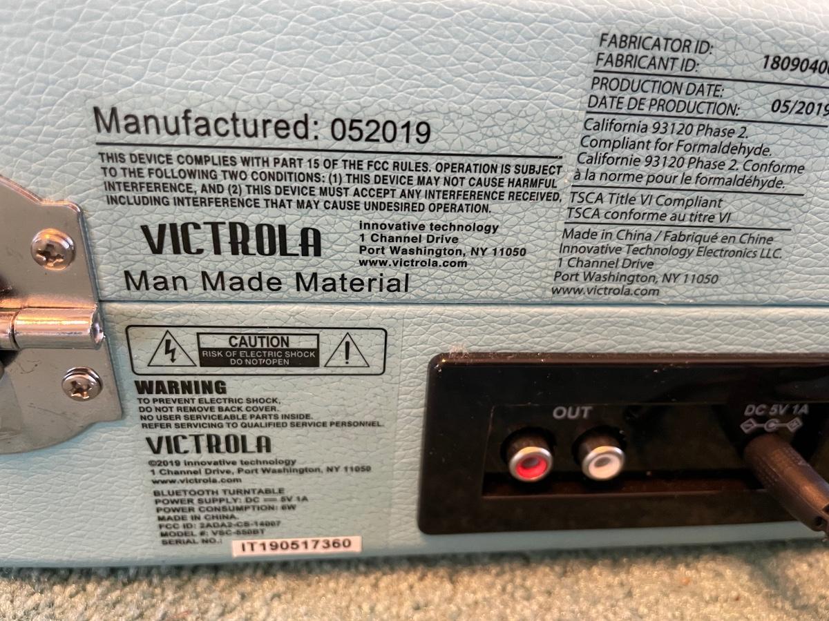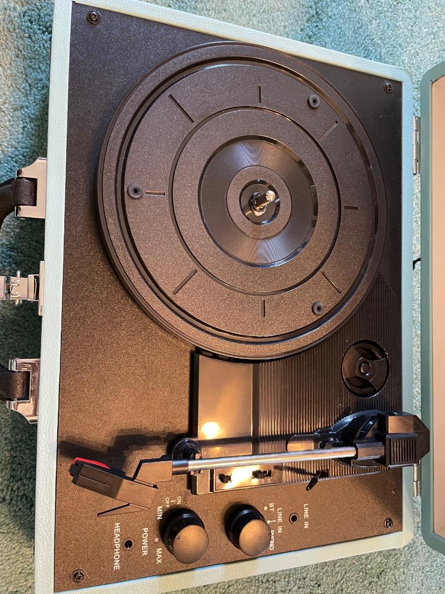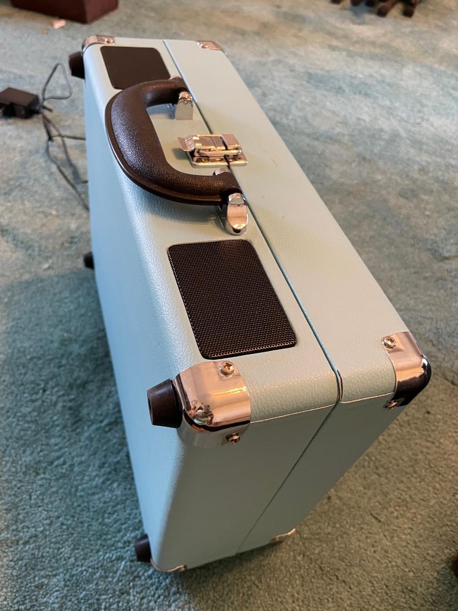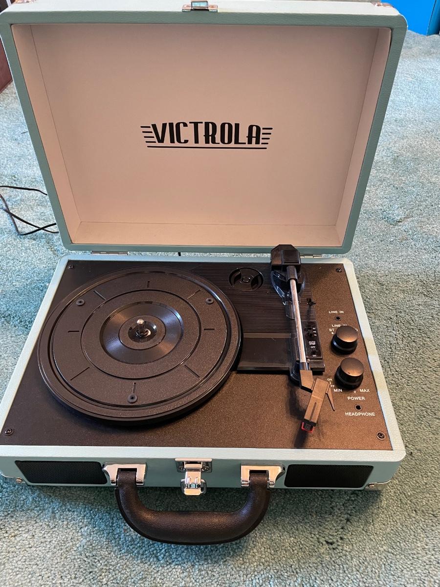 Victrola vintage 3 speed portable suitcase record player, aqua, Bluetooth hookup. Power turns on.